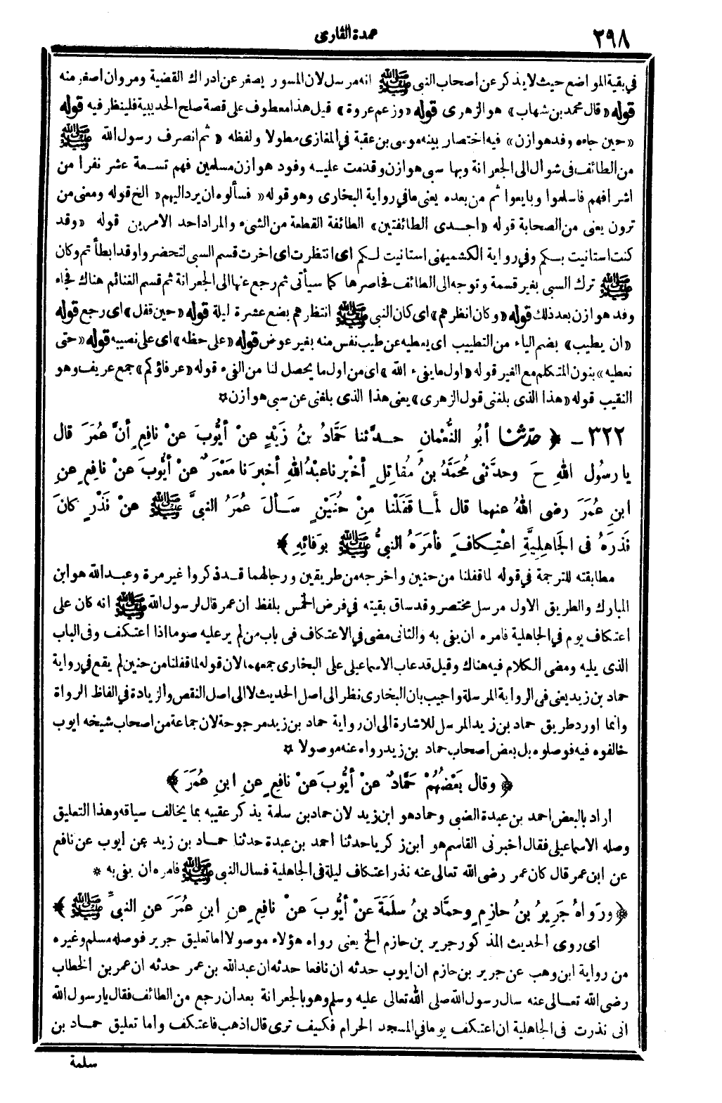 322 - (حَدثنَا أَبُو النُّعْمَان حَدثنَا حَمَّاد بن زيد عَن أَيُّوب عَن نَافِع أَن عمر قَالَ يَا رَسُول الله ح وحَدثني مُحَمَّد بن مقَاتل أخبرنَا عبد الله أخبرنَا معمر عَن أَيُّوب عَن نَافِع عَن ابْن عمر رَضِي الله عَنْهُمَا قَالَ لما قَفَلْنَا من حنين سَأَلَ عمر النَّبِي - صَلَّى اللَّهُ عَلَيْهِ وَسَلَّم َ - عَن نذر كَانَ نَذره فِي الْجَاهِلِيَّة اعْتِكَاف فَأمره النَّبِي - صَلَّى اللَّهُ عَلَيْهِ وَسَلَّم َ - بوفائه) مطابقته للتَّرْجَمَة فِي قَوْله لما قَفَلْنَا من حنين وَأخرجه من طَرِيقين ورجالهما قد ذكرُوا غير مرّة وَعبد الله هُوَ ابْن الْمُبَارك وَالطَّرِيق الأول مُرْسل مُخْتَصر وَقد سَاق بَقِيَّته فِي فرض الْخمس بِلَفْظ أَن عمر قَالَ لرَسُول الله - صَلَّى اللَّهُ عَلَيْهِ وَسَلَّم َ - إِنَّه كَانَ على اعْتِكَاف يَوْم فِي الْجَاهِلِيَّة فَأمره أَن يَفِي بِهِ وَالثَّانِي مضى فِي الِاعْتِكَاف فِي بَاب من لم ير عَلَيْهِ صوما إِذا اعْتكف وَفِي الْبَاب الَّذِي يَلِيهِ وَمضى الْكَلَام فِيهِ هُنَاكَ وَقيل قد عَابَ الْإِسْمَاعِيلِيّ على البُخَارِيّ جَمعهمَا لِأَن قَوْله لما قَفَلْنَا من حنين لم يَقع فِي رِوَايَة حَمَّاد بن زيد يَعْنِي فِي الرِّوَايَة الْمُرْسلَة وَأجِيب بِأَن البُخَارِيّ نظر إِلَى أصل الحَدِيث لَا إِلَى أصل النَّقْص وَالزِّيَادَة فِي أَلْفَاظ الروَاة وَإِنَّمَا أورد طَرِيق حَمَّاد بن زيد الْمُرْسل للْإِشَارَة إِلَى أَن رِوَايَة حَمَّاد بن زيد مرجوحة لِأَن جمَاعَة من أَصْحَاب شَيْخه أَيُّوب خالفوه فِيهِ فوصلوه بل بعض أَصْحَاب حَمَّاد بن زيد رَوَاهُ عَنهُ مَوْصُولا