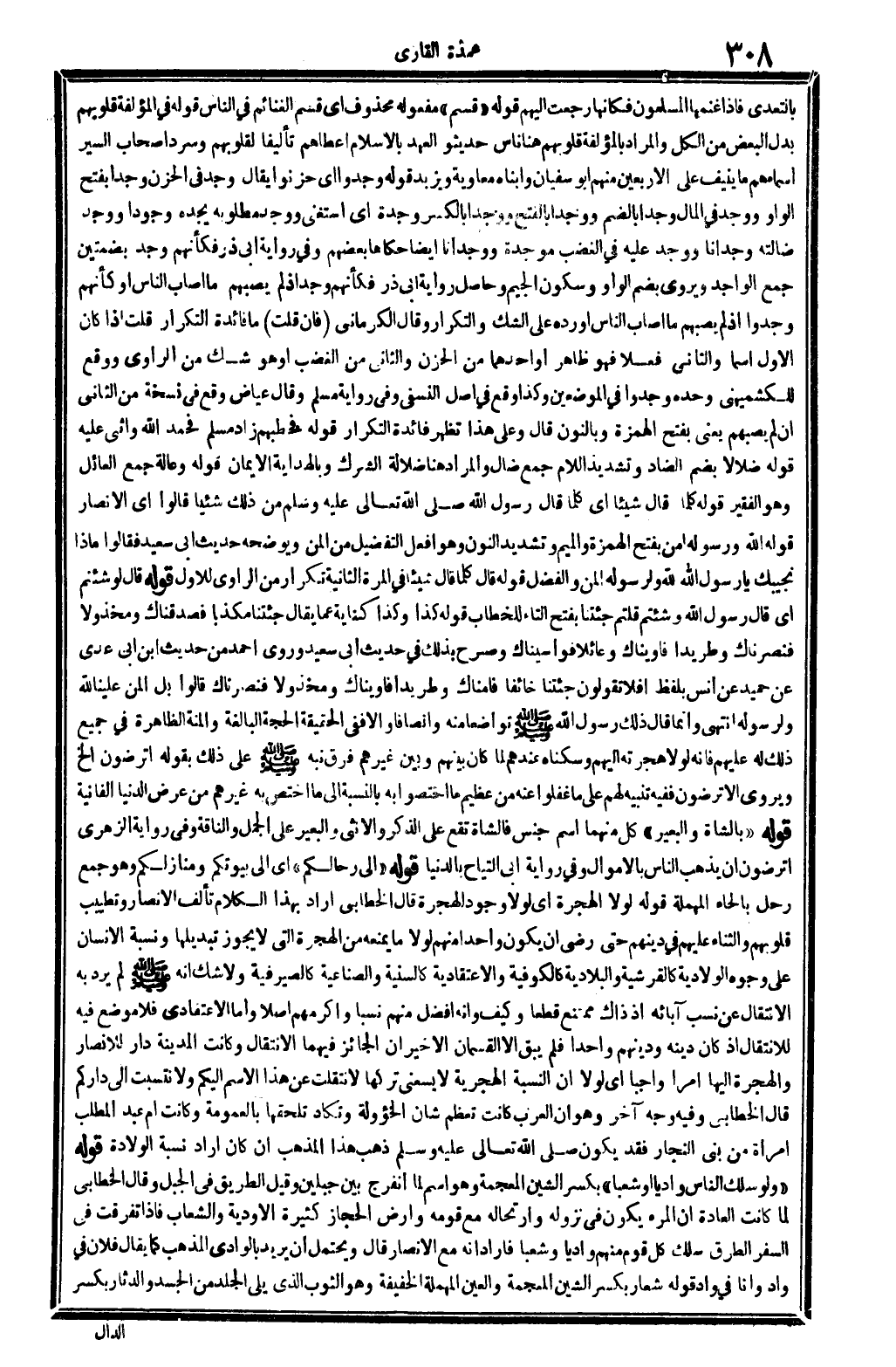 بِالتَّعَدِّي فَإِذا غنمها الْمُسلمُونَ فَكَأَنَّهَا رجعت إِلَيْهِم. قَوْله: (قسم) ، مَفْعُوله مَحْذُوف أَي: قسم الْغَنَائِم فِي النَّاس. قَوْله: (فِي الْمُؤَلّفَة قُلُوبهم) بدل: الْبَعْض من الْكل، وَالْمرَاد بالمؤلفة قُلُوبهم هُنَا نَاس حديثو الْعَهْد بِالْإِسْلَامِ أَعْطَاهُم تأليفاً لقُلُوبِهِمْ، وسرد أَصْحَاب السّير أَسْمَاءَهُم مَا ينيف على الْأَرْبَعين، مِنْهُم: أَبُو سُفْيَان وابناه مُعَاوِيَة وَيزِيد. قَوْله: (وجدوا) أَي: حزنوا، يُقَال: وجد فِي الْحزن وجدا، بِفَتْح الْوَاو، وَوجد فِي المَال وُجداً بِالضَّمِّ ووَجداً بِالْفَتْح ووِجداً بِالْكَسْرِ وَجدّة أَي: اسْتغنى، ووجده مَطْلُوبه يجده وجودا، وَوجد ضالته وجداناً، وَوجد عَلَيْهِ فِي الْغَضَب موجدة ووجداناً أَيْضا، حَكَاهَا بَعضهم، وَفِي رِوَايَة أبي ذَر، فكأنهم وجدٌ بِضَمَّتَيْنِ جمع: الْوَاجِد، ويروى بِضَم الْوَاو وَسُكُون الْجِيم، وَحَاصِل رِوَايَة أبي ذَر: فكأنهم وجد إِذْ لم يصبهم مَا أصَاب النَّاس، أَو كَأَنَّهُمْ وجدوا إِذْ لم يصبهم مَا أصَاب النَّاس، أوردهُ على الشَّك والتكرار، وَقَالَ الْكرْمَانِي: فَإِن قلت: مَا فَائِدَة التّكْرَار؟ قلت: إِذا كَانَ الأول إسماً وَالثَّانِي فعلا فَهُوَ ظَاهر، أَو أَحدهمَا من الْحزن وَالثَّانِي من الْغَضَب، أَو هُوَ شكّ من الرَّاوِي، وَوَقع للكشميهني وَحده: وجدوا فِي الْمَوْضِعَيْنِ، وَكَذَا وَقع فِي أصل النَّسَفِيّ، وَفِي رِوَايَة مُسلم، وَقَالَ عِيَاض: وَقع فِي نُسْخَة من الثَّانِي إِن لم يصبهم، يَعْنِي بِفَتْح الْهمزَة وبالنون قَالَ: وعَلى هَذَا تظهر فَائِدَة التّكْرَار. قَوْله: (فخطبهم) زَاد مُسلم: فَحَمدَ الله وَأثْنى عَلَيْهِ قَوْله: (ضلالا) بِضَم الضَّاد وَتَشْديد اللَّام جمع ضال. وَالْمرَاد هُنَا: ضَلَالَة الشّرك وبالهداية الْإِيمَان. قَوْله: (وَعَالَة) جمع العائل وَهُوَ الْفَقِير. قَوْله: (كلما قَالَ شَيْئا أَي:) كلما قَالَ رَسُول الله صلى الله عَلَيْهِ وَسلم، من ذَلِك شَيْئا، قَالُوا: (أَي الْأَنْصَار. قَوْله: (الله وَرَسُوله وَرَسُوله أَمن) بِفَتْح الْهمزَة وَالْمِيم وَتَشْديد النُّون، وَهُوَ أفعل التَّفْضِيل من: الْمَنّ، ويوضحه حَدِيث أبي سعيد. فَقَالُوا: مَاذَا نجيبك يَا رَسُول الله؟ لله وَلِرَسُولِهِ الْمَنّ وَالْفضل. قَوْله: (قَالَ: كلما قَالَ شَيْئا) فِي الْمرة الثَّانِيَة تكْرَار من الرَّاوِي للْأولِ. قَوْله: (قَالَ: لَو شِئْتُم) أَي: قَالَ رَسُول الله: لَو شِئْتُم (قُلْتُمْ جئتنا) ، بِفَتْح التَّاء للخطاب، قَوْله: (كَذَا وَكَذَا) ، كِنَايَة عَمَّا يُقَال: جئتنا مُكَذبا فَصَدَّقْنَاك، ومخذولاً فَنَصَرْنَاك، وطريداً فَآوَيْنَاك، وعائلاً فوا سيناك، وَصرح بذلك فِي حَدِيث أبي سعيد، وروى أَحْمد من حَدِيث ابْن أبي عدي عَن حميد عَن أنس بِلَفْظ: أَفلا تَقولُونَ: جئتنا خَائفًا فآمناك، وطريداً فَآوَيْنَاك، ومخذولاً فَنَصَرْنَاك؟ قَالُوا: بل الْمَنّ علينا لله وَلِرَسُولِهِ، انْتهى وَإِنَّمَا قَالَ ذَلِك رَسُول الله صلى الله عَلَيْهِ وَسلم تواضعاً مِنْهُ وإنصافاً، وإلاَّ فَفِي الْحَقِيقَة الْحجَّة الْبَالِغَة والْمنَّة الظَّاهِرَة فِي جَمِيع ذَلِك لَهُ عَلَيْهِم، فَإِنَّهُ لَوْلَا هجرته إِلَيْهِم وسكناه عِنْدهم لما كَانَ بنيهم وَبَين غَيرهم فرق، نبه صلى الله عَلَيْهِ وَسلم على ذَلِك بقوله: (أَتَرْضَوْنَ) الخ ويروى: أَلا ترْضونَ؟ فَفِيهِ تَنْبِيه لَهُم على مَا غفلوا عَنهُ من عَظِيم مَا اختصوا بِهِ بِالنِّسْبَةِ إِلَى مَا اخْتصَّ بِهِ غَيرهم من عرض الدُّنْيَا الفانية. قَوْله: (بِالشَّاة وَالْبَعِير) ، كل مِنْهُمَا إسم جنس، فالشاة تقع على الذّكر وَالْأُنْثَى وَالْبَعِير على الْجمل والناقة، وَفِي رِوَايَة الزُّهْرِيّ: أَتَرْضَوْنَ أَن يذهب النَّاس بالأموال؟ وَفِي رِوَايَة أبي التياح: بالدنيا؟ قَوْله: (إِلَى رح