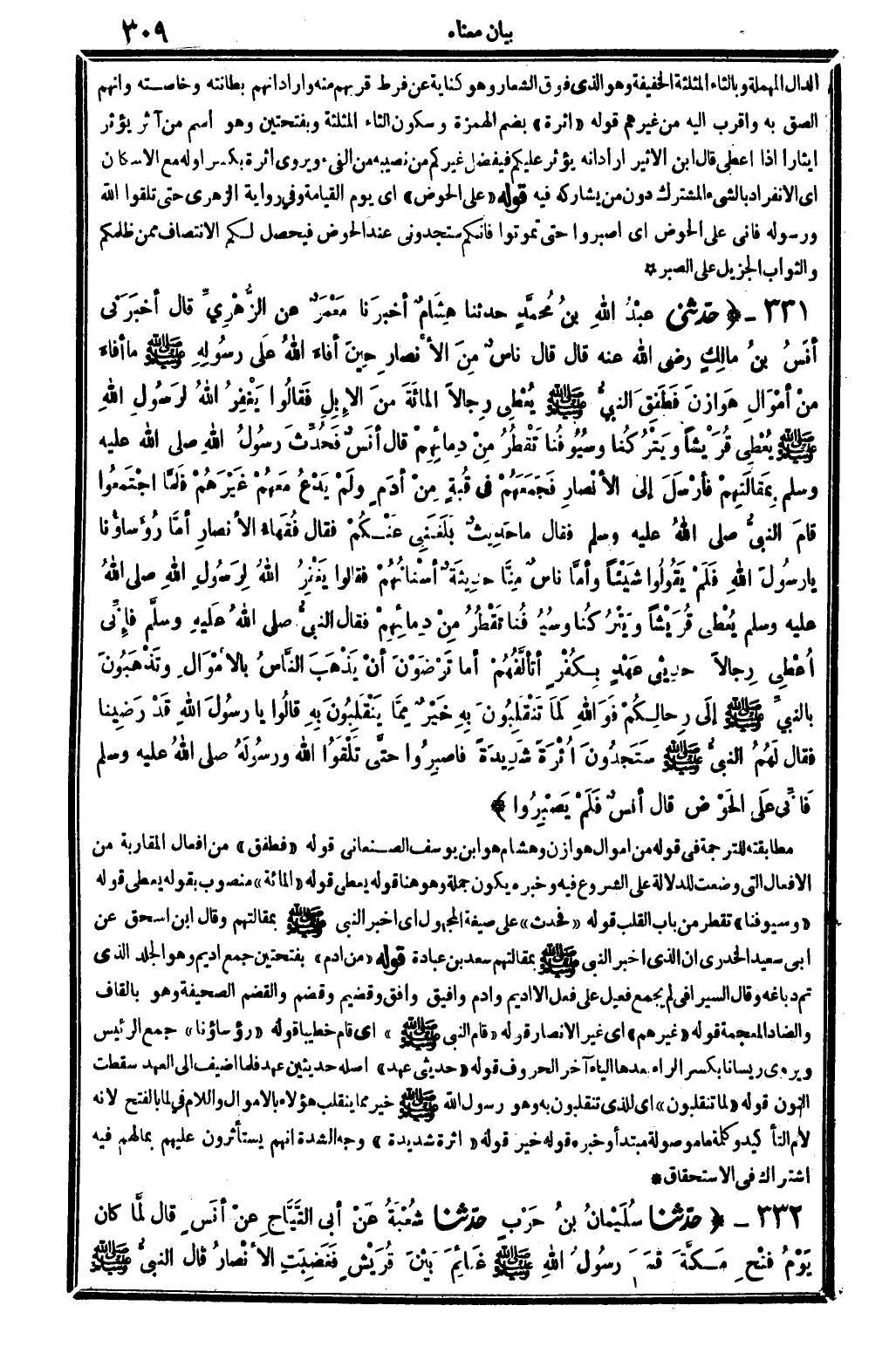 4331 - حدَّثني عبْدُ الله بنُ مُحَمَّدٍ حَدثنَا هِشَامٌ أخبرَنا مَعْمَرٌ عَن الزُّهْرِيِّ قَالَ أخبرَني أنسُ بنُ مالِكٍ رَضِي الله عَنهُ قَالَ قَالَ ناسٌ مِنَ الأنْصارِ حِينَ أفاءَ الله عَلَى رسُولِهِ صلى الله عَلَيْهِ وَسلم مَا أفاءَ منْ أمْوَالِ هَوازنَ فَطَفِقَ النبيُّ صلى الله عَلَيْهِ وَسلم يُعْطي رِجالاً المائَةَ منَ الإِبِلِ فَقالُوا يَغْفِرُ الله لرَسُولِ الله صلى الله عَلَيْهِ وَسلم يُعْطي قُرَيْشاً وَيَتْرُكُنا وسُيُوفُنا تَقْطُرُ مِنْ دِمائِهِمْ قَالَ أنَسٌ فَحدِّثَ رَسُولُ الله صلى الله عَلَيْهِ وَسلم بِمَقالَتِهِمْ فأرْسَلَ إِلَى الأنْصارِ فَجَمَعَهُمْ فِي قُبةٍ مِنْ أدَمٍ ولَمْ يَدْعُ مَعَهُمْ غَيْرَهُمْ فَلَمَّا اجْتَمَعُوا قامَ النبيُّ صلى الله عَلَيْهِ وَسلم فَقَالَ مَا حَدِيثٌ بَلَغَنِي عَنْكُمْ فَقَالَ فُقَهَاءُ الأنصارِ أمَّا رُؤَساؤُنا يَا رسُولَ الله فَلَمْ يَقُولُوا شَيْئاً وأمَّا ناسٌ مِنَّا حدِيثَةٌ أسْنانُهُمْ فَقَالُوا يَغْفِرُ الله لِرَسُولِ الله صلى الله عَلَيْهِ وَسلم يُعْطى قُرَيْشاً ويَتْرُكُنا وسُيُوفُنا تَقْطُرُ مِنْ دِمَائِهِمْ فَقَالَ النبيُّ صلى الله عَلَيْهِ وَسلم فإِنِّي أُعْطِي رِجالاً حدِيثي عَهْدٍ بِكُفْرٍ أتألَّفُهُمْ أما تَرْضَوْنَ أنْ يَذْهَبَ النَّاسُ بالأمْوَالِ وتَذْهَبُونَ بالنبيِّ صلى الله عَلَيْهِ وَسلم إلَى رِحالِكُمْ فَوَالله لَمَا تَنْقَلِبُونَ بِهِ خَيْرٌ مِمَّا يَنْقَلِبُونَ بِهِ قالُوا يَا رسُولَ الله قَدْ رَضِينا فَقَالَ لَهُمُ النبيُّ صلى الله عَلَيْهِ وَسلم سَتَجدُونَ أُثْرَةً شَدِيدَةً فاصبِرُوا حَتَّى تَلْقُوا الله ورسُولَهُ صلى الله عَلَيْهِ وَسلم فَإنِّي عَلَى الحَوْض قَالَ أنسٌ فَلَمْ يَصْبِرُوا. .