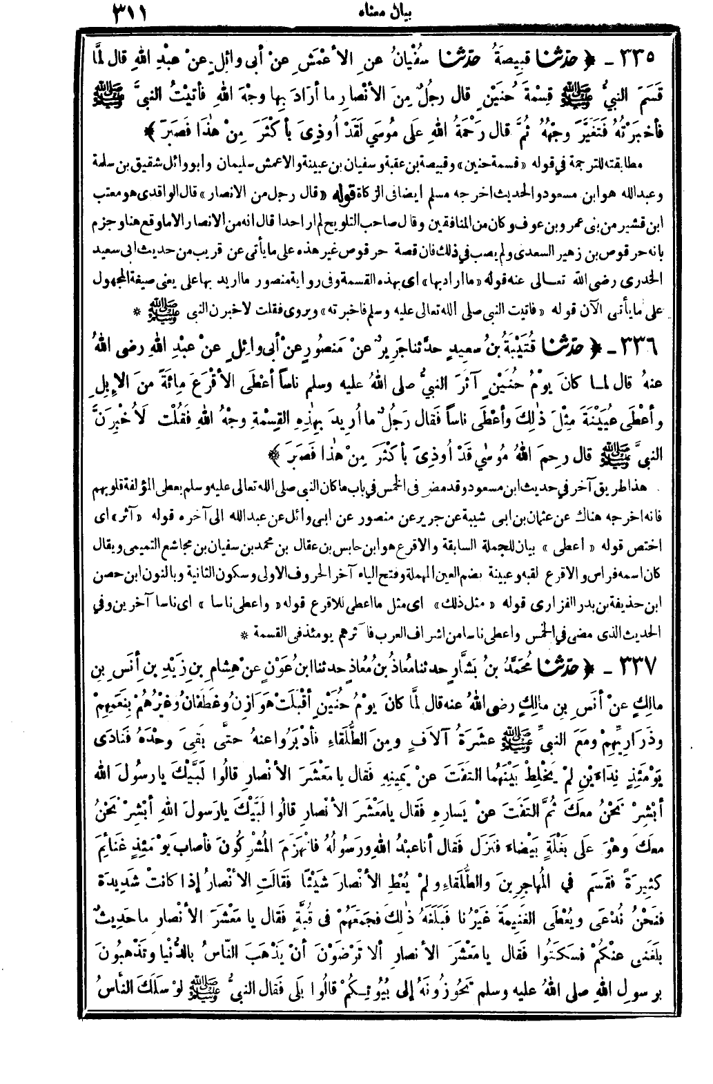 337 - (حَدثنَا مُحَمَّد بن بشار حَدثنَا معَاذ بن معَاذ حَدثنَا ابْن عون عَن هِشَام بن زيد بن أنس بن مَالك عَن أنس بن مَالك رَضِي الله عَنهُ قَالَ لما كَانَ يَوْم حنين أَقبلت هوَازن وغَطَفَان وَغَيرهم بنعمهم وذراريهم وَمَعَ النَّبِي - صَلَّى اللَّهُ عَلَيْهِ وَسَلَّم َ - عشرَة آلَاف وَمن الطُّلَقَاء فأدبروا عَنهُ حَتَّى بَقِي وَحده فَنَادَى يَوْمئِذٍ نداءين لم يخلط بَينهمَا الْتفت عَن يَمِينه فَقَالَ يَا معشر الْأَنْصَار قَالُوا لبيْك يَا رَسُول الله أبشر نَحن مَعَك ثمَّ الْتفت عَن يسَاره فَقَالَ يَا معشر الْأَنْصَار قَالُوا لبيْك يَا رَسُول الله أبشر نَحن مَعَك وَهُوَ على بغلة بَيْضَاء فَنزل فَقَالَ أَنا عبد الله وَرَسُوله فَانْهَزَمَ الْمُشْركُونَ فَأصَاب يَوْمئِذٍ غَنَائِم كَثِيرَة فقسم فِي الْمُهَاجِرين والطلقاء وَلم يُعْط الْأَنْصَار شَيْئا فَقَالَت الْأَنْصَار إِذا كَانَت شَدِيدَة فَنحْن ندعى وَيُعْطى الْغَنِيمَة غَيرنَا فَبَلغهُ ذَلِك فَجَمعهُمْ فِي قبَّة فَقَالَ يَا معشر الْأَنْصَار مَا حَدِيث بَلغنِي عَنْكُم فَسَكَتُوا فَقَالَ يَا معشر الْأَنْصَار أَلا ترْضونَ أَن يذهب النَّاس بالدنيا وَتَذْهَبُونَ برَسُول الله - صَلَّى اللَّهُ عَلَيْهِ وَسَلَّم َ - تحوزونه إِلَى بُيُوتكُمْ قَالُوا بلَى فَقَالَ النَّبِي - صَلَّى اللَّهُ عَلَيْهِ وَسَلَّم َ - لَو سلك النَّاس