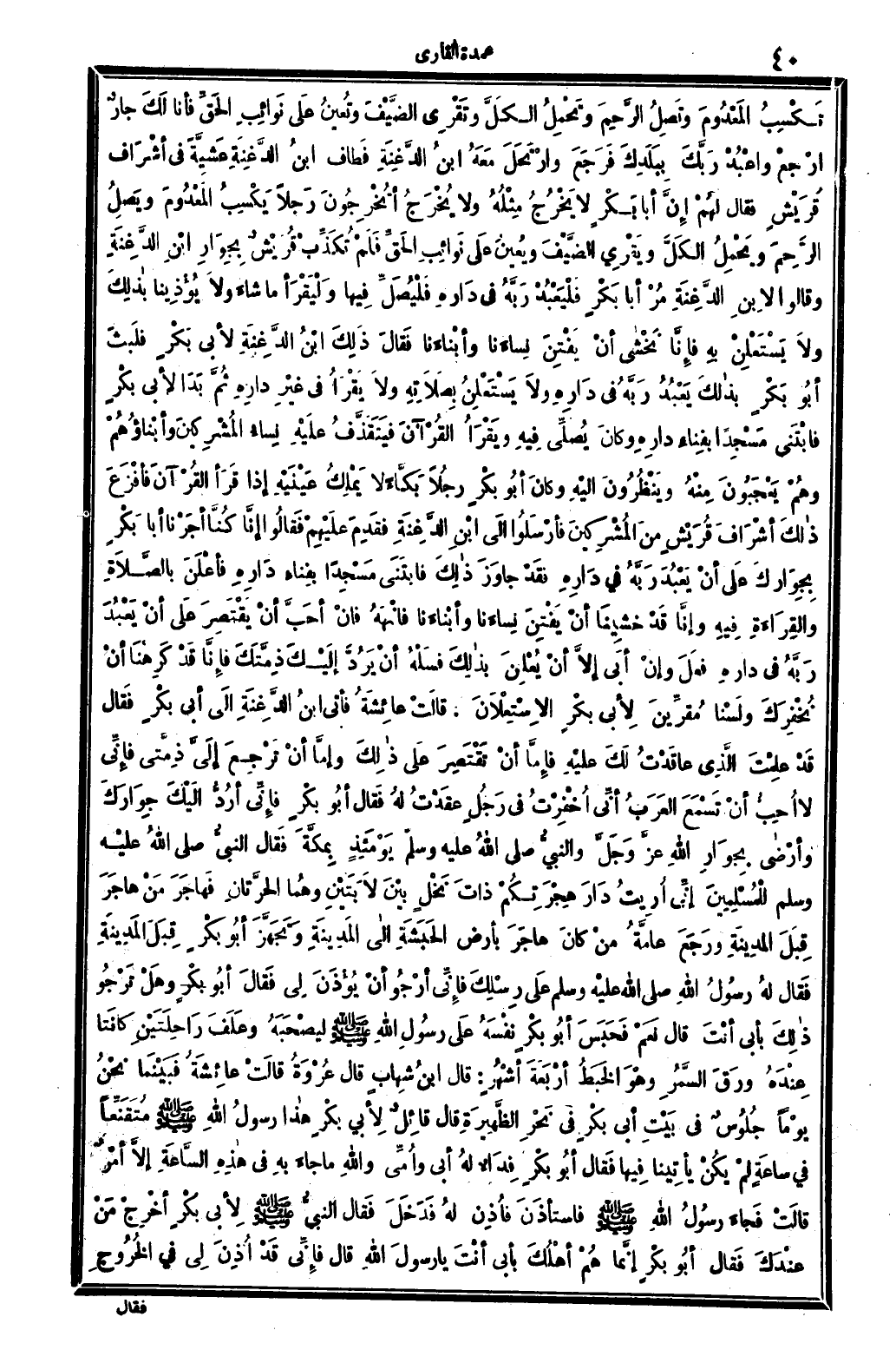 تَكْسِبُ المَعْدُومَ وتَصِلُ الرَّحِمَ وتَحْمِلُ الكَلَّ وتَقْرِي الضَّيْفَ وتُعِينُ علَى نَوَائِبِ الحَقِّ فَأَنا لَكَ جارٌ ارْجَعْ واعْبُدْ رَبَّكَ بِبَلَدِكَ فرَجَعَ وارْتَحَلَ مَعَهُ ابنُ الدَّغِنَةِ فَطافَ ابنُ الدَّغِنَةِ عَشِيَّةً فِي أشْرَافِ قُرَيْشٍ فَقَالَ لَهُمْ إنَّ أبَا بَكْرٍ لاَ يَخْرُجُ مِثْلُهُ وَلَا يُخْرَجُ أتُخْرِجُونَ رَجُلاً يَكْسِبُ الْمَعْدُومَ ويَصِلُ الرَّحِمَ ويَحْمِلُ الكَلَّ ويَقْرِي الضَّيْفَ ويُعينُ علَى نَوائِبِ الحَقِّ فلَمْ تُكَذِّبْ قُرَيْشٌ بِجِوَارِ ابنِ الدَّغِنَةِ وَقَالُوا لابنِ الدَّغِنَةِ مُرْ أبَا بَكْرٍ فَلْيَعْبُدْ رَبَّهُ فِي دَارِهِ فَلْيُصَلِّ فِيها ولْيَقْرَأ مَا شاءَ ولاَ يُؤْذِينا بِذالِكَ ولاَ يَسْتَعْلِنْ بِهِ فإنَّا نَخْشَى أنْ يَفْتِنَ نِسَاءَنَا وأبْناءَنَا فَقالَ ذلِكَ ابنُ الدَّغِنَةِ لأبِي بَكْرٍ فلَبِثَ أبُو بَكْرٍ بذالِكَ يَعْبُدُ رَبَّهُ فِي دَارِهِ ولاَ يَسْتَعْلِنُ بِصَلاتِهِ ولاَ يَقْرَأ فِي غيْرِ دَارِهِ ثُمَّ بَدَا لأبِي بَكْرٍ فابْتَنَى مَسْجِدَاً بِفِناءِ دارِهِ وكانَ يُصَلِّي فِيهِ ويَقْرأ القُرْآنَ فيَتَقَذَّفُ علَيْهِ نِساءُ الْمُشْرِكِينَ وأبْنَاءَهُمْ وهُمْ يَعْجَبُونِ مِنْهُ ويَنْظُرُونَ إلَيْهِ وكانَ أبُو بَكْرٍ رَجُلاً بكَّاءٍ لاَ يَمْلِكُ عَيْنَيْهِ إذَا قرَأ القُرْآنَ فأفْزَعَ ذالِكَ أشْرَافَ قُرَيْشٍ مِنَ الْمُشْرِكِينَ فأرْسَلُوا إلَى ابْنِ الدَّغِنَةِ فقَدِمَ علَيْهِمْ فقَالُوا إنَّا كُنَّا أجَرْنَا أبَا بَكْرٍ بِجِوَارِكَ علَى أنْ يَعْبُدَ رَبَّهُ فِي دَارِهِ فقَدْ جاوَزَ ذالِكَ فابْتَنَى مَسْجِدَاً بِفِناءِ دَارِهِ فأعْلَنَ بالصَّلاَةِ والقِرَاءَةِ فِيهِ وإنَّا قَدْ خَشِينَا أنْ يَفْتِنَ نِساءَنَا وأبْنَاءَنَا فانْهَهُ فإنْ أحَبَّ أنْ يَقْتَصِرَ علَى أنْ يَعْبُدَ رَبَّهُ فِي دَارِهِ فعَلَ وإنْ أبَى إلاَّ أنْ يُعْلِنَ بذالِكَ فسَلْهُ أنْ يَرُدَّ إلَيْكَ ذِمَّتَكَ فإنَّا قَدْ كَرِهْنَا أنْ نُخْفِرَكَ ولَسْنَا مُقرِّينَ لأِبِي بَكْرٍ الإسْتِعْلاَنَ. قالَتْ عائِشَةُ فَأتى ابنُ الدَّغِنَةِ إلَى أبِي بَكْرٍ فَقَالَ قَدْ عَلِمْتَ الَّذِي عاقَدْتُ لَكَ علَيْهِ فإمَّا أنْ تَقْتَصِرَ علَى ذَلِكَ وإمَّا أنْ تَرْجِعَ إلَيَّ ذِمَّتِي فإنِّي لَا أُحِبُّ أنْ تَسْمَعَ العَرَبُ أنِّي أُخْفِرْتُ فِي رَجُلٍ عَقَدْتُ لَهُ فقالَ أبُو بَكْرٍ فإنِّي أرُدُّ إلَيْكَ جِوَارَكَ وأرْضَى بِجِوَارِ الله عزِّ وجَلَّ والنَّبِيُّ صلى الله عَلَيْهِ وَسلم يَوْمَئِذٍ بِمَكَّةَ فَقَالَ النَّبِيُّ صلى الله عَلَيْهِ وَسلم لِلْمُسْلِمِينَ إنِّي أُرِيتُ دَارَ هِجْرَتِكُمْ ذاتَ نَخْلٍ بَيْنَ لاَبَتَيْنِ وهُمَا الحَرَّتَانِ فَهاجَرَ مَنْ هاجَرَ قِبَلَ المَدِينَةِ ورَجَعَ عامَّةُ مَنْ كانَ هاجَرَ بأرْضِ الحبَشَةِ إلاى المَدِينَةِ وتَجَهَّزَ أبُو بَكْرٍ قِبَلَ المَدِينَةِ فَقال لَهُ رَسُولُ الله صلى الله عَلَيْهِ وَسلم علَى رِسْلِكَ فإنِّي أرْجُو أنْ يُؤْذَنَ لِي فَقالَ أبُو بَكْرٍ وهَلْ تَرْجُو ذالِكَ بأبِي أنْتَ قَالَ نَعَمْ فحَبَسَ أبُو بَكْرٍ نَفْسَهُ علَى رسُولِ الله صلى الله عَلَيْهِ وَسلم ليَصْحَبَهُ وعَلَفَ رَاحِلَتَيْنِ كانَتَا عِنْدَهُ ورَقَ السَّمُرِ وهْوَ الخَبَطُ أرْبَعَةَ أشْهُرٍ: قَالَ ابنُ شِهَابٍ قَالَ عُرْوَةُ قالَتْ عائِشَةُ فبَيْنَما نحْنُ يَوْمَاً جُلُوسٌ فِي بَيْتِ أبِي بَكْرٍ فِي نَحْرِ الظَّهِيرَةِ قَالَ قائلٌ لأِبِي بَكْرٍ هاذَا رسُولُ الله صلى الله عَلَيْهِ وَسلم مُتَقَنِّعَاً فِي ساعَةٍ لَمْ يَكُنْ يأتِينَا فِيها فَقالَ أبُو بَكْرٍ فِدَاءٌ لَهُ أبي وأُمِّي وَالله مَا جاءَ بِهِ فِي هاذِهِ السَّاعَةِ إلاَّ أمْرٌ قالَتْ فَجاءَ رَسُولُ الله صلى الله عَلَيْهِ وَسلم فاسْتَأذَنَ فأُذِنَ لَهُ فدَ