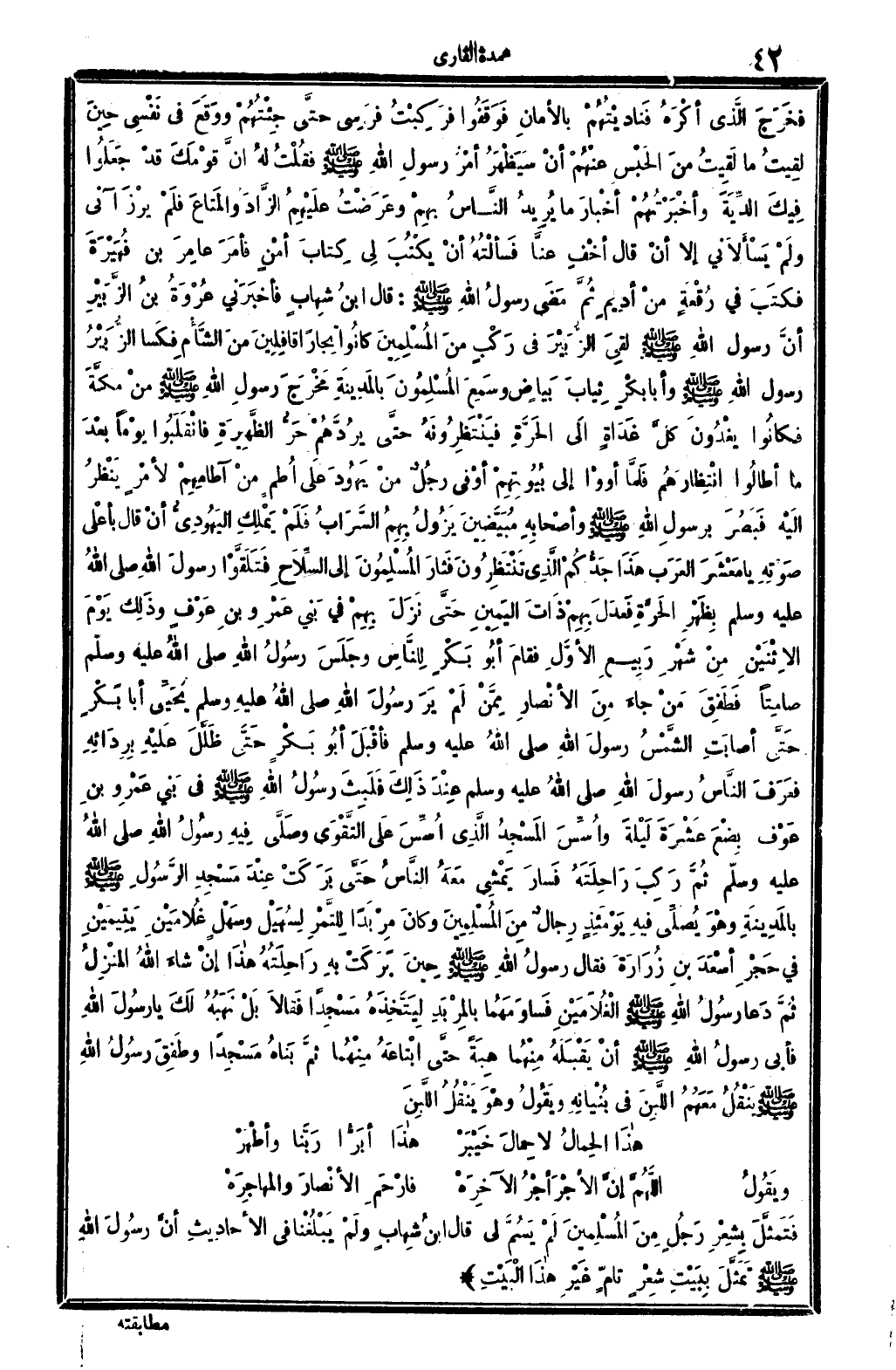 فَخَرَجَ الَّذِي أكْرَهُ فَنادَيْتُهُمْ بالأمَانِ فوَقَفُوا فرَكِبْتُ فَرَسِي حتَّى جئْتَهُمْ ووقَعَ فِي نَفْسِي حِينَ لَقيتُ مَا لَقِيتُ مِنَ الحَبْسِ عَنْهُمْ أنْ سَيَظْهَرُ أمْرُ رسُولِ الله صلى الله عَلَيْهِ وَسلم فقُلْتُ لَهُ أنَّ قَوْمَكَ قدْ جعَلُوا فِيكَ الدِّيَّةَ وأخْبَرْتُهُمْ أخْبَارَ مَا يُرِيدُ النَّاسُ بِهِمْ وعَرَضْتُ عَلَيْهِمْ الزَّادَ والْمَتاعَ فلَمْ يَرْزآنِي ولَمْ يَسْألاَنِي إلاَّ أنْ قالَ أخْفِ عَنَّا فَسألْتُهُ أنْ يَكْتُبَ لِي كِتَابَ أمْنٍ فأمَرَ عامِرَ بن فُهَيْرَةَ فكَتَبَ فِي رُقْعَةٍ مِنْ أدِيمٍ ثُمَّ مَضَى رسُولُ الله صلى الله عَلَيْهِ وَسلم: قَالَ ابنُ شِهابٍ فأخْبَرَنِي عُرْوَةُ بنُ الزبَيْرِ أنَّ رسُولَ الله صلى الله عَلَيْهِ وَسلم لَقِيَ الزُّبَيْرَ فِي رَكْبٍ مِنَ الْمُسْلِمِينَ كانُوا تجارَاً قافِلِينَ مِنَ الشَّأمِ فكَسَا الزُّبَيْرُ رسُولَ الله صلى الله عَلَيْهِ وَسلم وأبَا بَكْرٍ ثِيَابَ بَيَاضٍ وسَمِعَ المُسْلِمُونَ بالْمَدِينَةِ مَخْرَجَ رسُولِ الله صلى الله عَلَيْهِ وَسلم مِنْ مَكَّةَ فكانُوا يغْدُونَ كلَّ غَداةٍ إلَى الحَرَّةِ فيَنْتَظِرُونَهُ حتَّى يَرُدَّهُمْ حَرُّ الظَّهِيرَةِ فانْقَلَبُوا يَوْمَاً بَعْدَ مَا أطَالُوا انْتِظَارَهُمْ فلَمَّا أووْا إِلَى بيُوتِهِمْ أوْفى رَجُلٌ مِنْ يَهُودَ علَى أُطمٍ مِن آطامِهِمْ لأمْرٍ يَنْظُرُ إلَيْهِ فبَصُرَ بِرَسُولِ الله صلى الله عَلَيْهِ وَسلم وأصْحَابِهِ مُبَيَّضِينَ يَزُولُ بِهِمُ السَّرَابُ فلَمْ يَمْلِكِ اليَهُودِيُّ أنْ قالَ بأعْلَى صَوْتِهِ يَا مَعْشَرَ العَرَبِ هذَا جدُّكُمْ الَّذِي تَنْتَظِرُونَ فَثارَ المُسْلِمُونَ إِلَى السِّلاحِ فتَلَقَّوْا رسُولَ الله صلى الله عَلَيْهِ وَسلم بِظَهْرِ الحَرَّةِ فعَدَلَ بِهِمْ ذَاتَ اليَمِينِ حتَّى نَزَلَ بِهِمْ فِي بَنِي عَمْرِو بنِ عَوْفٍ وذَلِكَ يَوْمَ الإثْنَيْنِ مِنْ شَهْرِ رَبِيعِ الأوَّلِ فقامَ أبُو بَكْرٍ لِلنَّاسِ وجَلَسَ رَسُولُ الله صلى الله عَلَيْهِ وَسلم صامِتَاً فَطَفِقَ مَنْ جَاءَ مِنَ الأنْصَارِ مِمَّنْ لَمْ يَرَ رَسُولَ الله صلى الله عَلَيْهِ وَسلم يُحَيِّي أبَا بَكْرٍ حَتَّى أصَابَتْ الشَّمْسُ رسُولَ الله صلى الله عَلَيْهِ وَسلم فأقْبَلَ أبُو بَكْرٍ حَتَّى ظَلَّلَ علَيْهِ بِرِدَائِهِ فعَرَفَ النَّاسُ رسُولَ الله صلى الله عَلَيْهِ وَسلم عِنْدَ ذَلِكَ فلَبِثَ رسُولُ الله صلى الله عَلَيْهِ وَسلم فِي بَنِي عَمْرِو بنِ عَوْف بِضْعَ عَشْرَةَ لَيْلَةً وأُسِّسَ المَسْجِدُ الَّذِي أُسِّسَ علَى التَّقْوَى وصَلَّى فِيهِ رَسُولُ الله صلى الله عَلَيْهِ وَسلم ثُمَّ رَكِبَ رَاحِلَتَهُ فَسارَ يَمْشِي معَهُ النَّاسُ حَتَّى برَكَتْ عِنْدَ مَسْجِدِ الرَّسُولِ صلى الله عَلَيْهِ وَسلم بالمَدِينَةِ وهْوَ يُصَلِّي فِيهِ يَوْمَئِذٍ رِجَالٌ مِنَ الْمُسْلِمِينَ وكانَ مِرْبَدَاً لِلتَّمْرِ لِسُهَيْلٍ وسَهْلٍ غُلامَيْنَ يَتِيمَيْنِ فِي حَجْرِ أسْعَدَ بنِ زُرَارَةَ فقالَ رَسُولُ الله صلى الله عَلَيْهِ وَسلم حِينَ بَرَكَتْ بِهِ رَاحِلَتُهُ هاذَا إنْ شَاءَ الله المنْزِلُ ثُمَّ دَعا رسُولُ الله صلى الله عَلَيْهِ وَسلم الْغُلامَيْنِ فَساوَمَهُمَا بالمِرْبَدِ لِيَتَّخِذَهُ مَسْجِدَاً فَقالاَ بَلْ نَهَبُهُ لَكَ يَا رَسُولَ الله فأبَى رسُولُ الله صلى الله عَلَيْهِ وَسلم أنْ يَقْبَلَهُ مِنْهُمَا هِبَةً حتَّى ابْتاعَهُ مِنْهُمَا ثُمَّ بَناهُ مَسْجِدَاً وطَفِقَ رسُولُ الله صلى الله عَلَيْهِ وَسلم يَنْقُلُ مَعَهُمْ اللَّبَنِ فِي بُنْيَانِهِ ويَقُولُ وهْوَ يَنْقُلُ اللَّبِنَ: