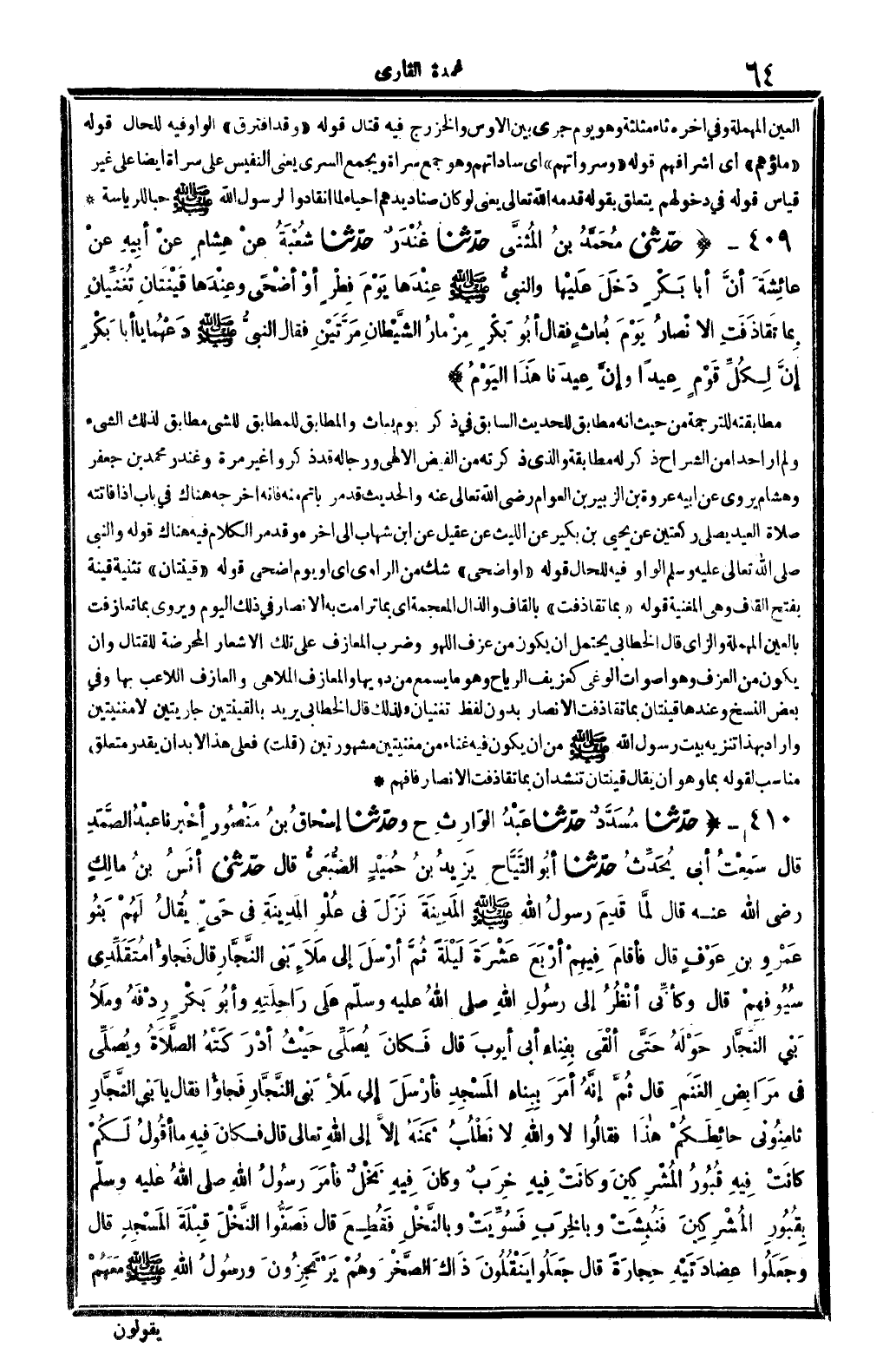 409 - (حَدثنِي مُحَمَّد بن الْمثنى حَدثنَا غنْدر حَدثنَا شُعْبَة عَن هِشَام عَن أَبِيه عَن عَائِشَة أَن أَبَا بكر دخل عَلَيْهَا وَالنَّبِيّ - صَلَّى اللَّهُ عَلَيْهِ وَسَلَّم َ - عِنْدهَا يَوْم فطر أَو أضحى وَعِنْدهَا قينتان تُغنيَانِ بِمَا تقاذفت الْأَنْصَار يَوْم بُعَاث فَقَالَ أَبُو بكر مزمار الشَّيْطَان مرَّتَيْنِ فَقَالَ النَّبِي - صَلَّى اللَّهُ عَلَيْهِ وَسَلَّم َ - دعهما يَا أَبَا بكر إِن لكل قوم عيدا وَإِن عيدنا هَذَا الْيَوْم) مطابقته للتَّرْجَمَة من حَيْثُ أَنه مُطَابق للْحَدِيث السَّابِق فِي ذكر يَوْم بُعَاث والمطابق للمطابق للشَّيْء مُطَابق لذَلِك الشَّيْء وَلم أر أحدا من الشُّرَّاح ذكر لَهُ مُطَابقَة وَالَّذِي ذكرته من الْفَيْض الالهي وَرِجَاله قد ذكرُوا غير مرّة وغندر مُحَمَّد بن جَعْفَر وَهِشَام يروي عَن أَبِيه عُرْوَة بن الزبير بن الْعَوام رَضِي الله تَعَالَى عَنهُ والْحَدِيث قد مر بأتم مِنْهُ فَإِنَّهُ أخرجه هُنَاكَ فِي بَاب إِذا فَاتَتْهُ صَلَاة الْعِيد يُصَلِّي رَكْعَتَيْنِ عَن يحيى بن بكير عَن اللَّيْث عَن عقيل عَن ابْن شهَاب إِلَى آخِره وَقد مر الْكَلَام فِيهِ هُنَاكَ قَوْله وَالنَّبِيّ - صَلَّى اللَّهُ عَلَيْهِ وَسَلَّم َ - الْوَاو فِيهِ للْحَال قَوْله " أَو أضحى " شكّ من الرَّاوِي أَي أَو يَوْم أضحى قَوْله " قينتان " تَثْنِيَة قينة بِفَتْح الْقَاف وَهِي الْمُغنيَة قَوْله " بِمَا تقاذفت " بِالْقَافِ والذال الْمُعْجَمَة أَي بِمَا ترامت بِهِ الْأَنْصَار فِي ذَلِك الْيَوْم ويروى بِمَا تعازفت بِالْعينِ الْمُهْملَة وَالزَّاي قَالَ الْخطابِيّ يحْتَمل أَن يكون من عزف اللَّهْو وَضرب المعازف على تِلْكَ الْأَشْعَار المحرضة لِلْقِتَالِ وَأَن يكون من العزف وَهُوَ أصوات الوغى كعزيف الرِّيَاح وَهُوَ مَا يسمع من دويها وَالْمَعَازِف الملاهي والعازف اللاعب بهَا وَفِي بعض النّسخ وَعِنْدهَا قينتان بِمَا تقاذفت الْأَنْصَار بِدُونِ لفظ تُغنيَانِ فَلذَلِك قَالَ الْخطابِيّ يُرِيد بالقينتين جارتين لَا مغنيتين وَأَرَادَ بِهَذَا تَنْزِيه بَيت رَسُول الله - صَلَّى اللَّهُ عَلَيْهِ وَسَلَّم َ - من أَن يكون فِيهِ غناء من مغنيتين مشهورتين (قلت) فعلى هَذَا الابدان بِقدر مُتَعَلق مُنَاسِب لقَوْله بِمَا وَهُوَ أَن يُقَال قينتان تنشدان بِمَا تقاذفت الْأَنْصَار فَافْهَم -