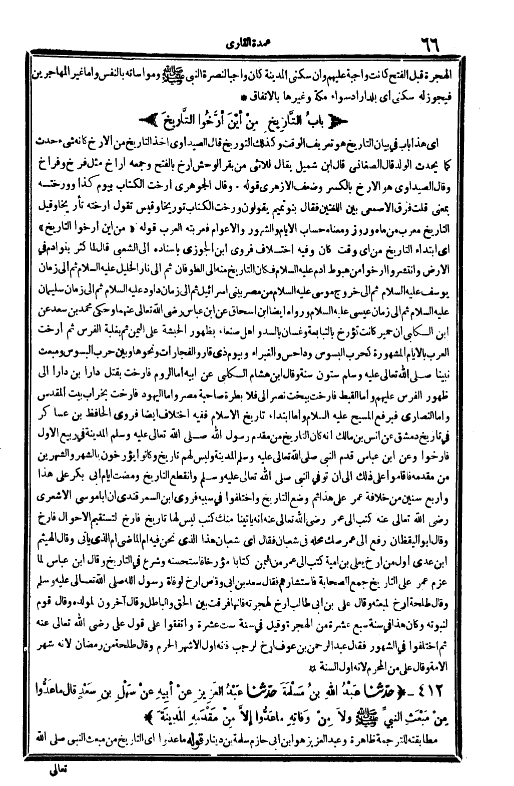 أَي: هَذَا بَاب فِي بَيَان التَّارِيخ: هُوَ تَعْرِيف الْوَقْت وَكَذَلِكَ التوريخ، قَالَ الصَّيْدَاوِيُّ: أَخذ التَّارِيخ من الأرخ، كَأَنَّهُ شَيْء حدث كَمَا يحدث الْوَلَد، قَالَ الصغاني: قَالَ ابْن شُمَيْل: يُقَال للانثى من بقر الْوَحْش: أرخ، بِالْفَتْح وَجمعه: اراخ، مثل: فرخ وفراخ، وَقَالَ الصَّيْدَاوِيُّ: هُوَ الارخ، بِالْكَسْرِ، وَضعف الْأَزْهَرِي قَوْله. وَقَالَ الْجَوْهَرِي: أرخت الْكتاب بِيَوْم كَذَا وورخته بِمَعْنى، قلت: فرق الْأَصْمَعِي بَين اللغتين، فَقَالَ: بَنو تَمِيم يَقُولُونَ: ورخت الْكتاب توريخاً، وَقيس تَقول: أرخته تأريخاً، وَقيل: التَّارِيخ مُعرب من: مَاء وروز، وَمَعْنَاهُ: حِسَاب الْأَيَّام والشهور والأعوام فعربته الْعَرَب، قَوْله: (من أَيْن أَرخُوا التَّارِيخ) ، أَي: ابْتِدَاء التَّارِيخ من أَي وَقت كَانَ، وَفِيه اخْتِلَاف. فروى ابْن الْجَوْزِيّ بِإِسْنَادِهِ إِلَى الشّعبِيّ، قَالَ: لما كثر بَنو آدم فِي الأَرْض وانتشروا أَرخُوا من هبوط آدم، عَلَيْهِ الصَّلَاة وَالسَّلَام ثمَّ إِلَى زمَان يُوسُف عَلَيْهِ السَّلَام ثمَّ إِلَى خُرُوج مُوسَى عَلَيْهِ السَّلَام من مصر بني اسرائيل ثمَّ إِلَى زمَان دَاوُد عَلَيْهِ السَّلَام، فَكَانَ التَّارِيخ مِنْهُ إِلَى الطوفان، ثمَّ إِلَى نَار الْخَلِيل، عَلَيْهِ الصَّلَاة وَالسَّلَام، ثمَّ إِلَى زمَان سُلَيْمَان، عَلَيْهِ الصَّلَاة وَالسَّلَام، ثمَّ إِلَى زمَان عِيسَى، عَلَيْهِ الصَّلَاة وَالسَّلَام، وَرَوَاهُ أَيْضا ابْن إِسْحَاق عَن ابْن عَبَّاس، رَضِي الله تَعَالَى عَنْهُمَا، وَحكى مُحَمَّد بن سعد عَن ابْن الْكَلْبِيّ: أَن حمير كَانَت تؤرخ بالتبابعة وغسان بالسد، وَأهل صنعاء بِظُهُور الْحَبَشَة على الْيمن، ثمَّ بِغَلَبَة الْفرس، ثمَّ أرخت الْعَرَب بِالْأَيَّامِ الْمَشْهُورَة: كحرب البسوس، وداحس والغبراء، وبيوم ذِي قار، والفجارات وَنَحْوهَا، وَبَين حَرْب البسوس ومبعث نَبينَا صلى الله عَلَيْهِ وَسلم، سِتُّونَ سنة. وَقَالَ ابْن هِشَام الْكَلْبِيّ عَن أَبِيه: أما الرّوم فَأَرختْ بقتل دَارا بن دَارا إِلَى ظُهُور الْفرس عَلَيْهِم، وَأما القبط فَأَرختْ ببخت نصر إِلَى فلابطرة صَاحِبَة مصر، وَأما الْيَهُود فَأَرختْ بخراب بَيت الْمُقَدّس، وَأما النَّصَارَى فبرفع الْمَسِيح، عَلَيْهِ الصَّلَاة وَالسَّلَام، وَأما ابْتِدَاء تَارِيخ الْإِسْلَام فَفِيهِ اخْتِلَاف أَيْضا، فروى الْحَافِظ ابْن عَسَاكِر فِي (تَارِيخ دمشق) : عَن أنس بن مَالك أَنه كَانَ التَّارِيخ من مقدم رَسُول الله، صلى الله عَلَيْهِ وَسلم، الْمَدِينَة فِي ربيع الأول، فأرخوا. وَعَن ابْن عَبَّاس: قدم النَّبِي صلى الله عَلَيْهِ وَسلم، الْمَدِينَة وَلَيْسَ لَهُم تَارِيخ، وَكَانُوا يؤرخون بالشهر والشهرين من مقدمه فأقاموا على ذَلِك إِلَى أَن توفّي النَّبِي صلى الله عَلَيْهِ وَسلم، وَانْقطع التَّارِيخ، وَمَضَت أَيَّام أبي بكر على هَذَا وَأَرْبع سِنِين من خلَافَة عمر على هَذَا، ثمَّ وضع التَّارِيخ، وَاخْتلفُوا فِي سَببه، فروى ابْن السَّمرقَنْدِي: أَن أَبَا مُوسَى الْأَشْعَرِيّ، رَضِي الله تَعَالَى عَنهُ، كتب إِلَى عمر، رَضِي الله تَعَالَى عَنهُ، أَنه يأتينا مِنْك كتب لَيْسَ لَهَا تَارِيخ، فأرخ لتستقيم الْأَحْوَال، فأرخ. وَقَالَ أَبُو الْيَقظَان: رفع إِلَى عمر صك مَحَله فِي شعْبَان، فَقَالَ: أَي شعْبَان هَذَا؟ الَّذِي نَحن فِيهِ أم الْمَاضِي أم الَّذِي يَأْتِي؟ وَقَالَ الْهَيْثَم ابْن عدي: أول من أرخ يعلى بن أُميَّة، كتب إِلَى عمر من الْيمن كتابا مؤرخاً فَاسْتَحْسَنَهُ وَشرع فِي التَّارِيخ. وَقَالَ ابْن عَبَّاس: لما عزم عمر على التَّارِيخ جمع الصَّحَابَة فاستشارهم، فَقَالَ سعد بن أبي وَقاص: أرخ لوفاة رَسُول الله، صلى الله عَلَيْهِ وَسلم، وَقَالَ طَلْحَة: أرخ لمبعثه، وَقَالَ عَليّ بن أبي طَالب: أرخ لهج