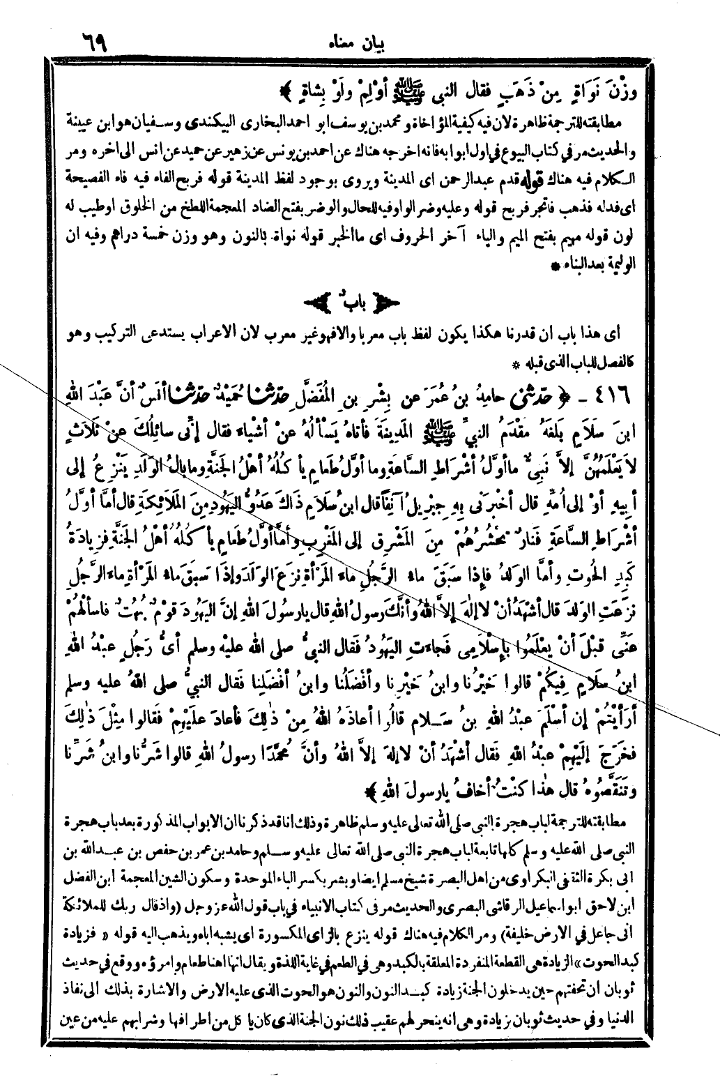 416 - (حَدثنِي حَامِد بن عمر عَن بشر بن الْمفضل حَدثنَا حميد حَدثنَا أنس أَن عبد الله بن سَلام بلغه مقدم النَّبِي - صَلَّى اللَّهُ عَلَيْهِ وَسَلَّم َ - الْمَدِينَة فَأَتَاهُ يسْأَله عَن أَشْيَاء فَقَالَ إِنِّي سَائِلك عَن ثَلَاث لَا يعلمهُنَّ إِلَّا نَبِي مَا أول أَشْرَاط السَّاعَة وَمَا أول طَعَام يَأْكُلهُ أهل الْجنَّة وَمَا بَال الْوَلَد ينْزع إِلَى أَبِيه أَو إِلَى أمه قَالَ أَخْبرنِي بِهِ جِبْرِيل آنِفا قَالَ ابْن سَلام ذَاك عَدو الْيَهُود من الْمَلَائِكَة قَالَ أما أول أَشْرَاط السَّاعَة فَنَار تَحْشُرهُمْ من الْمشرق إِلَى الْمغرب وَأما أول طَعَام يَأْكُلهُ أهل الْجنَّة فَزِيَادَة كبد الْحُوت وَأما الْوَلَد فَإِذا سبق مَاء الرجل مَاء الْمَرْأَة نزع الْوَلَد وَإِذا سبق مَاء الْمَرْأَة مَاء الرجل نزعت الْوَلَد قَالَ أشهد أَن لَا إِلَه إِلَّا الله وَأَنَّك رَسُول الله قَالَ يَا رَسُول الله إِن الْيَهُود قوم بهت فاسألهم عني قبل أَن يعلمُوا بِإِسْلَامِي فَجَاءَت الْيَهُود فَقَالَ النَّبِي - صَلَّى اللَّهُ عَلَيْهِ وَسَلَّم َ - أَي رجل عبد الله ابْن سَلام فِيكُم قَالُوا خيرنا وَابْن خيرنا وأفضلنا وَابْن أفضلنا فَقَالَ النَّبِي - صَلَّى اللَّهُ عَلَيْهِ وَسَلَّم َ - أَرَأَيْتُم إِن أسلم عبد الله بن سَلام قَالُوا أَعَاذَهُ الله من ذَلِك فَأَعَادَ عَلَيْهِم فَقَالُوا مثل ذَلِك فَخرج إِلَيْهِم عبد الله فَقَالَ أشهد أَن لَا إِلَه إِلَّا الله وَأَن مُحَمَّدًا رَسُول الله قَالُوا شَرنَا وَابْن شَرنَا وتنقصوه قَالَ هَذَا كنت أَخَاف يَا رَسُول الله) مطابقته للتَّرْجَمَة لباب هِجْرَة النَّبِي - صَلَّى اللَّهُ عَلَيْهِ وَسَلَّم َ - ظَاهِرَة وَذَلِكَ أَنا قد ذكرنَا أَن الْأَبْوَاب الْمَذْكُورَة بعد بَاب هِجْرَة النَّبِي - صَلَّى اللَّهُ عَلَيْهِ وَسَلَّم َ - كلهَا تَابِعَة لباب هِجْرَة النَّبِي - صَلَّى اللَّهُ عَلَيْهِ وَسَلَّم َ - وحامد بن عمر بن حَفْص بن عبد الله بن أبي بكرَة الثَّقَفِيّ البكراوي من أهل الْبَصْرَة شيخ مُسلم أَيْضا وَبشر بِكَسْر الْبَاء الْمُوَحدَة وَسُكُون الشين الْمُعْجَمَة ابْن الْفضل ابْن لَاحق أَبُو إِسْمَاعِيل الرقاشِي الْبَصْرِيّ والْحَدِيث مر فِي كتاب الْأَنْبِيَاء فِي بَاب قَول الله عز وَجل {وَإِذ قَالَ رَبك للْمَلَائكَة إِنِّي جَاعل فِي الأَرْض خَليفَة} وَمر الْكَلَام فِيهِ هُنَاكَ قَوْله ينْزع بالزاي الْمَكْسُورَة أَي يشبه أَبَاهُ وَيذْهب إِلَيْهِ قَوْله " فَزِيَادَة كبد الْحُوت " الزِّيَادَة هِيَ الْقطعَة المنفردة الْمُعَلقَة بالكبد وَهِي فِي الطّعْم فِي غَايَة اللَّذَّة وَيُقَال أَنَّهَا أهنأ طَعَام وأمرؤه وَوَقع فِي حَدِيث ثَوْبَان أَن تحفتهم حِين يدْخلُونَ الْجنَّة زِيَادَة كبد النُّون وَالنُّون هُوَ الْحُوت الَّذِي عَلَيْهِ الأَرْض وَالْإِشَارَة بذلك إِلَى نَفاذ الدُّنْيَا وَفِي حَدِيث ثَوْبَان بِزِيَادَة وَهِي أَنه ينْحَر لَهُم عقيب ذَلِك نون الْجنَّة الَّذِي كَانَ يَأْكُل من أطرافها وشرابهم عَلَيْهِ من عين