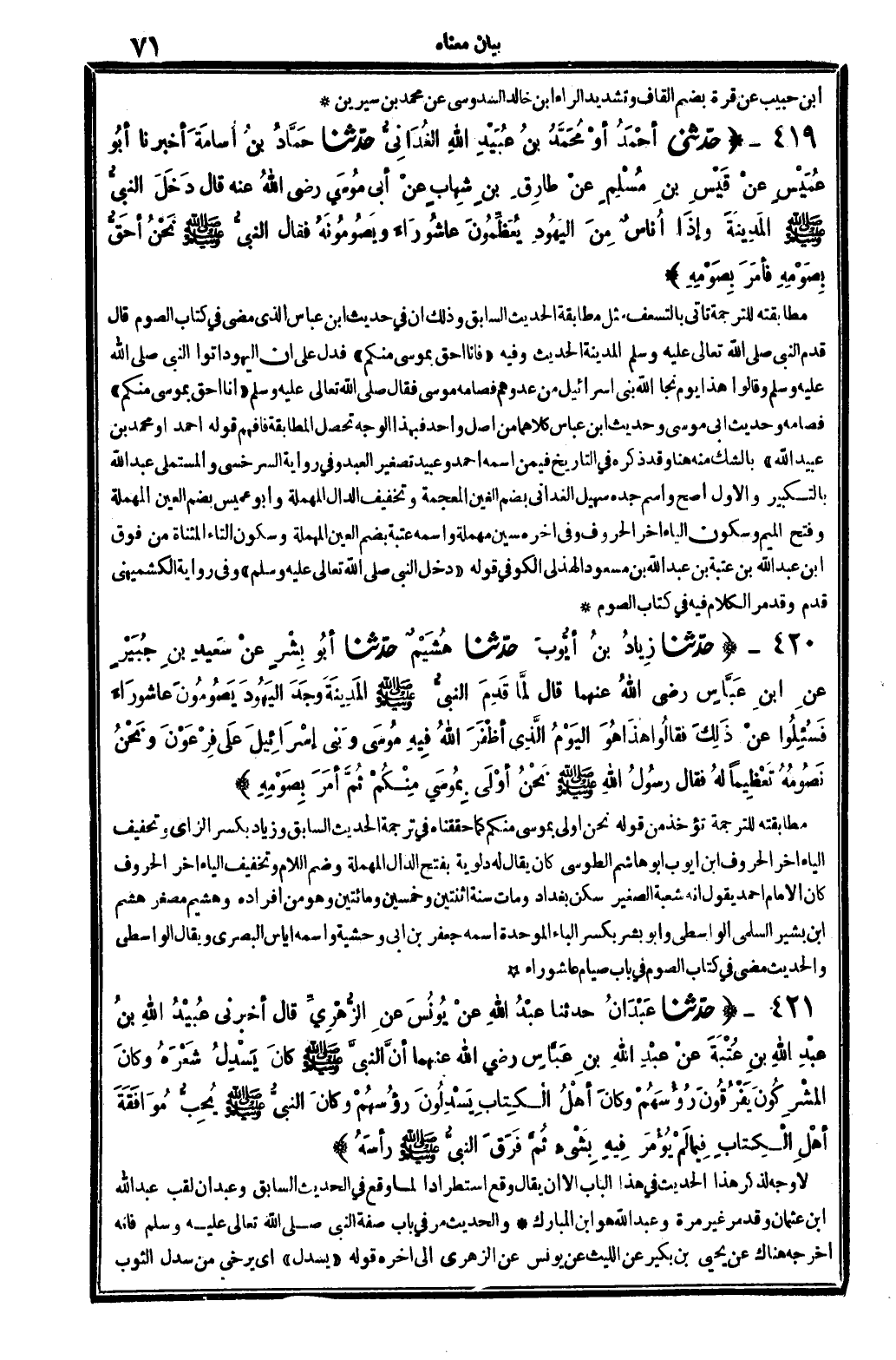 3942 - حدَّثني أحْمَدُ أوْ مُحَمَّدُ بنُ عُبَيْدِ الله الغُدَانِيُّ حدَّثنا حَمَّادُ بنُ أُسَامَةَ أخبرَنا أبُو عُمَيْسٍ عنْ قَيْسِ بنِ مُسْلِمٍ عنْ طارِقِ بنِ شِهَابٍ عنْ أبِي مُوسَى رَضِي الله تَعَالَى عَنهُ قَالَ دَخَلَ النَّبِي صلى الله عَلَيْهِ وَسلم المَدِينَةَ وإذَا أُنَاسٌ مِنَ اليَهُودِ يُعَظِّمُونَ عاشُورَاءَ ويَصُومُونَهُ فَقَالَ النَّبِيُّ صلى الله عَلَيْهِ وَسلم نَحْنُ أحَقُّ بِصَوْمِهِ فأمَرَ بِصَوْمِهِ. (انْظُر الحَدِيث 2005) .