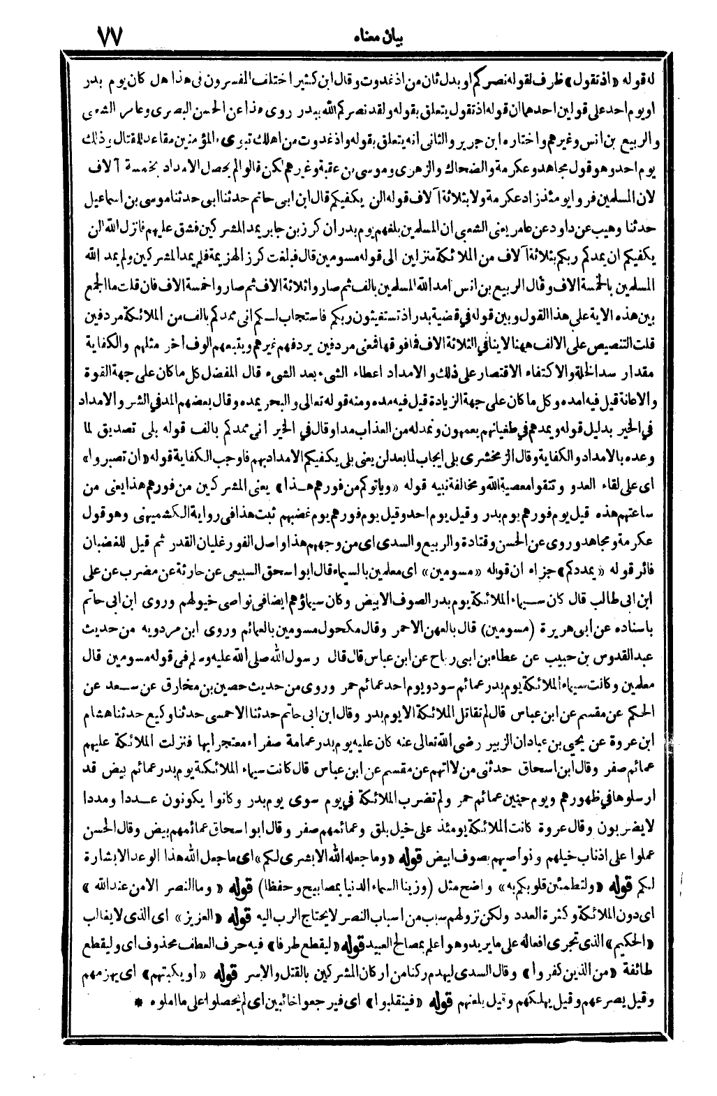 لَهُ. قَوْله: {إِذْ تَقول} ظرف لقَوْله: نصركم، أَو بدل ثَان من: إِذْ غَدَوْت، وَقَالَ ابْن كثير: اخْتلف الْمُفَسِّرُونَ فِي هَذَا، هَل كَانَ يَوْم بدر أَو يَوْم أحد؟ على قَوْلَيْنِ: أَحدهمَا: أَن قَوْله: (إِذْ تَقول) يتَعَلَّق بقوله: {وَلَقَد نصركم الله ببدر} ، رُوِيَ هَذَا عَن الْحسن الْبَصْرِيّ وعامر الشّعبِيّ وَالربيع بن أنس وَغَيرهم، وَاخْتَارَهُ ابْن جرير. وَالثَّانِي: أَنه يتَعَلَّق بقوله: {وَإِذ غَدَوْت من أهلك تبوىء الْمُؤمنِينَ مقاعد لِلْقِتَالِ} (آل عمرَان: 121) . وَذَلِكَ يَوْم أحد، وَهُوَ قَول مُجَاهِد وَعِكْرِمَة وَالضَّحَّاك وَالزهْرِيّ ومُوسَى بن عقبَة وَغَيرهم، لَكِن قَالُوا: لم يحصل الْإِمْدَاد بِخَمْسَة آلَاف لِأَن الْمُسلمين فروا يَوْمئِذٍ، زَاد عِكْرِمَة: وَلَا بِثَلَاثَة آلَاف. قَوْله: {ألن يكفيكم} قَالَ ابْن أبي حَاتِم: حَدثنَا أبي حَدثنَا مُوسَى بن إِسْمَاعِيل حَدثنَا وهيب عَن دَاوُد عَن عَامر يَعْنِي الشّعبِيّ: أَن الْمُسلمين بَلغهُمْ يَوْم بدر أَن كرز بن جَابر يمد الْمُشْركين، فشق عَلَيْهِم، فَأنْزل الله: {ألن يكفيكم أَن يمدكم ربكُم بِثَلَاثَة آلَاف من الْمَلَائِكَة منزلين} إِلَى قَوْله: {مسومين} قَالَ: فبلغت كرز الْهَزِيمَة فَلم يمد الْمُشْركين، وَلم يمد الله الْمُسلمين بالخمسة آلَاف. وَقَالَ الرّبيع بن أنس: أمد الله الْمُسلمين بِأَلف ثمَّ صَارُوا ثَلَاثَة آلَاف ثمَّ صَارُوا خَمْسَة آلَاف. فَإِن قلت: مَا الْجمع بَين هَذِه الْآيَة على هَذَا القَوْل، وَبَين قَوْله فِي قَضِيَّة بدر: {إِذْ تَسْتَغِيثُونَ ربكُم فَاسْتَجَاب لكم أَنِّي مُمِدكُمْ بِأَلف من الْمَلَائِكَة مُردفِينَ} (الْأَنْفَال: 9) . قلت: التَّنْصِيص على الْألف هَهُنَا لَا يُنَافِي الثَّلَاثَة آلَاف فَمَا فَوْقهَا، فَمَعْنَى: مُردفِينَ، يردفهم غَيرهم ويتبعهم أُلُوف أخر مثلهم، والكفاية مِقْدَار سد الْخلَّة، والاكتفاء الِاقْتِصَار على ذَلِك، والإمداد إِعْطَاء الشَّيْء بعد الشَّيْء. قَالَ الْمفضل: كل مَا كَانَ على جِهَة الْقُوَّة والإعانة قيل فِيهِ: أمده، وكل مَا كَانَ على جِهَة الزِّيَادَة قيل فِيهِ: مده، وَمِنْه قَوْله تَعَالَى: {وَالْبَحْر يمده} (لُقْمَان: 27) . وَقَالَ بَعضهم: الْمَدّ فِي الشَّرّ والإمداد فِي الْخَيْر، بِدَلِيل قَوْله: {ويمدهم فِي طغيانهم يعمهون} (الْبَقَرَة: 15) . {ونمد لَهُ من الْعَذَاب مدا} (مَرْيَم: 79) . وَقَالَ فِي الْخَيْر: {إِنِّي مُمِدكُمْ بِأَلف} (الْأَنْفَال: 9) . قَوْله: (بلَى) تَصْدِيق لما وعده بالإمداد والكفاية. وَقَالَ الزَّمَخْشَرِيّ: بلَى، إِيجَاب لما بعد لن، يَعْنِي: بل يكفيكم الْإِمْدَاد بهم، فَأوجب الْكِفَايَة. قَوْله: (أَن تصبروا) أَي: على لِقَاء الْعَدو وتتقوا مَعْصِيّة الله وَمُخَالفَة نبيه. قَوْله: (ويأتوكم من فورهم هَذَا) ، يَعْنِي الْمُشْركين من فورهم هَذَا يَعْنِي: من ساعتهم هَذِه، قيل: يَوْم فورهم يَوْم بدر، وَقيل: يَوْم أحد، وَقيل: يَوْم فورهم يَوْم غضبهم، ثَبت هَذَا فِي رِوَايَة الْكشميهني، وَهُوَ قَول عِكْرِمَة وَمُجاهد، وَرُوِيَ عَن الْحسن وَقَتَادَة وَالربيع وَالسُّديّ: أَي: من وجههم هَذَا، وأصل الْفَوْر غليان الْقدر، ثمَّ قيل للغضبان: فائر. قَوْله: (يمددكم) ، جَزَاء. أَن: قَوْله: (مسومين) ، أَي: معلمين بالسيماء، قَالَ أَبُو إِسْحَاق السبيعِي: عَن حَارِثَة عَن مضرب عَن عَليّ بن أبي طَالب قَالَ كَانَ سيماء الْمَلَائِكَة يَوْم بدر الصُّوف الْأَبْيَض وَكَانَ سيماؤهم أَيْضا فِي نواصي خيولهم وروى ابْن أبي حَاتِم بِإِسْنَادِهِ عَن أبي هُرَيْرَة: {مسومين} قَالَ: بالعهن الْأَحْمَر. وَقَالَ مَكْحُول: مسومين بالعمائم، وروى ابْن مرْدَوَيْه من حَدِيث عبد القدوس بن حبيب عَن عَطاء بن أبي رَبَاح عَن ابْن عَبَّاس، قَالَ: قَالَ رَسُول الله، صلى الله عَلَيْهِ وَسلم، فِي قَوْله: مسومين، قَالَ: معلمين، وَكَانَت سيماء الْمَلَائِكَة يَ
