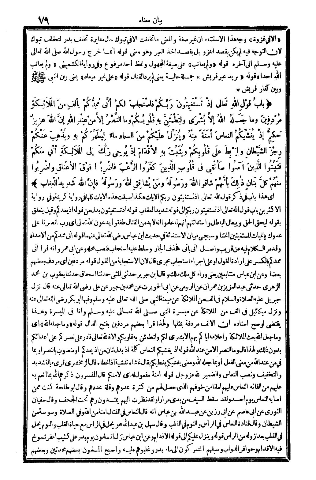 4 - (بابُ قَوْلِ الله تعَالى {إذْ تسْتَغِيثُونَ رَبَّكُمْ فاسْتَجَابَ لكُم أنِّي مُمِدُّكُمْ بألْفٍ مِنَ المَلائِكَةِ مُرْدِفِينَ وَمَا جَعَلَهُ الله إلاَّ بُشْرَى ولِتَطْمَئِنَّ بِهِ قُلُوبُكُمْ وَمَا النَّصْرُ إلاَّ مِنْ عِنْدِ الله إنَّ الله عَزِيزٌ حَكِيمٌ إذْ يُغَشِّيكُمْ النعاسَ أمَنَةً مِنْهُ ويُنَزِّلُ علَيْكُمْ مِنَ السَّمَاءِ مَاء لِيُطَهِّرَكُمْ بِهِ ويُذْهِبَ عَنْكُمْ رِجْزَ الشَّيْطَانِ ولِيَرْبِطَ عَلَى قُلُوبِكُمْ ويُثَبِّتَ بِهِ الأقْدَامَ إذْ يُوحِي رَبُّكَ إِلَى المَلائِكَةِ أنِّي مَعَكُمْ فثَبِّتُوا الَّذِينَ آمَنُوا سَأُلْقِي فِي قُلُوبِ الَّذِينَ كفَرُوا الرُّعْبَ فاضْرِبُوا فوقَ الأعْنَاقِ واضْرِبُوا مِنْهُمْ كلَّ بَنانٍ ذالِكَ بِأنَّهُمْ شَاقُوا الله ورَسُولَهُ ومَنْ يُشَاقِقِ الله ورَسُولَهُ فإنَّ الله شَديدَ العِقَابِ. (الْأَنْفَال: 9 12) .)