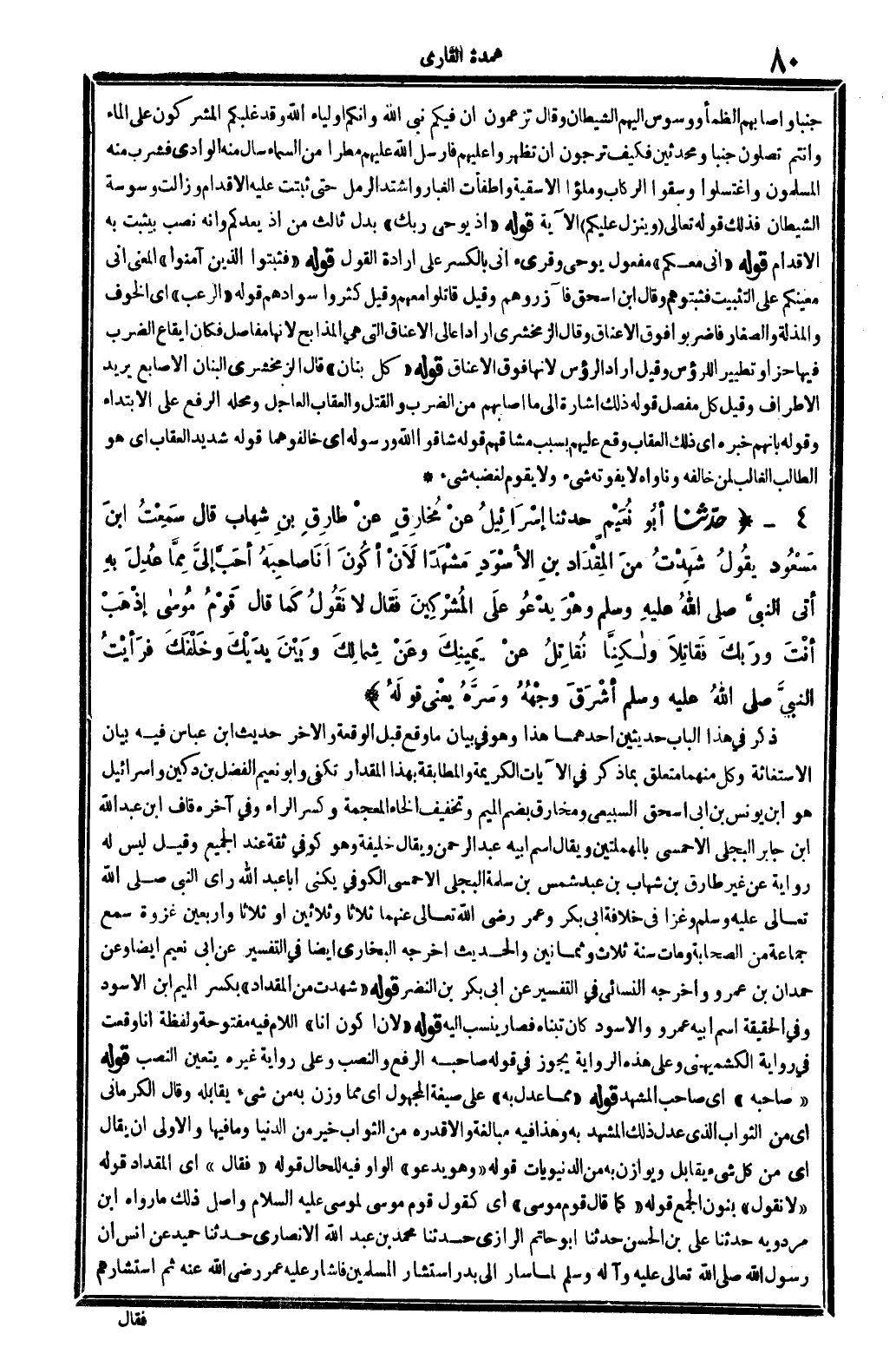 3952 - حدَّثنا أبُو نُعَيْمٍ حدَّثنا إسْرَائِيلُ عنْ مُخارِقٍ عنْ طارِقِ بنِ شِهَاب قَالَ سَمِعْتُ ابنَ مسْعُودٍ يقُولُ شَهِدْتُ مِنَ المِقْدَادِ بنِ الأسْوَدِ مَشْهَدَاً لأنْ أكُونَ أنَا صاحِبَهُ أحَبَّ إليَّ مِمَّا عُدِلَ بهِ أَتَى النَّبِيَّ صلى الله عَلَيْهِ وَسلم وهْوَ يدْعُو علَى المُشْرِكِينَ فَقال لَا نَقُولُ كَمَا قَالَ قَوْمُ مُوساى إذْهَبْ أنْتَ ورَبك فقَاتِلاَ ولاكِنَّا نُقاتِلُ عنْ يَمِينِكَ وعنْ شِمالِكَ وبَيْنَ يَدَيْكَ وخَلْفَكَ فرَأيْتُ النَّبِيَّ صلى الله عَلَيْهِ وَسلم أشْرَقَ وجْهُهُ وسَرَّهُ يَعْني قَوْلَهُ. (الحَدِيث 3952 طرفه فِي: 4609) .