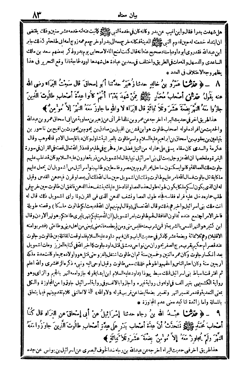 3957 - حدَّثنا عَمْرُو بنُ خالِدٍ حدَّثنا زُهَيْرٌ حدَّثنا أبُو إسْحَاقَ قَالَ سَمِعْت البَرَاءَ رَضِي الله تَعَالَى عَنهُ يقُولُ حدَّثنِي أصْحَابُ مُحَمَّدٍ صلى الله عَلَيْهِ وَسلم مِمَّنْ شَهِدَ بَدْرَاً أنَّهُمْ كانُوا عِدَّةَ أصْحَابِ طالُوتَ الَّذِينَ جازُوا معَهُ النَّهْرَ بِضْعَةَ عشَرَ وثَلاثَمِائَةٍ قَالَ البَرَاءُ لَا وَالله مَا جاوزَ معَهُ النَّهْرَ إلاَّ مُؤْمِنٌ.