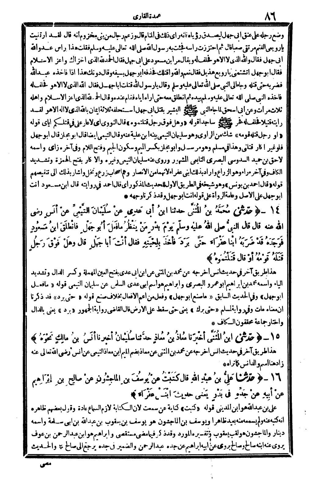 16 - (حَدثنَا عَليّ بن عبد الله قَالَ كتبت عَن يُوسُف بن الْمَاجشون عَن صَالح بن إِبْرَاهِيم عَن أَبِيه عَن جده فِي بدر يَعْنِي حَدِيث ابْني عفراء) عَليّ بن عبد الله هُوَ ابْن الْمَدِينِيّ قَوْله " كتبت " كِنَايَة عَن سَمِعت لِأَن الْكِتَابَة لَازم السماع عَادَة وَقَول بَعضهم ظَاهره أَنه كتبه عَنهُ وَلم يسمعهُ مِنْهُ بعيد ظَاهرا ويوسف بن الْمَاجشون هُوَ يُوسُف بن يَعْقُوب بن عبد الله بن أبي سَلمَة واسْمه دِينَار والماجشون هُوَ لقب يَعْقُوب وَتَفْسِيره المورد وَقد ذكر فِيمَا مضى مستقصى وَإِبْرَاهِيم هُوَ ابْن عبد الرَّحْمَن بن عَوْف يروي عَنهُ ابْنه صَالح وَصَالح يروي عَن أَبِيه إِبْرَاهِيم عَن جده عبد الرَّحْمَن وَالضَّمِير فِي جده يرجع إِلَى صَالح والْحَدِيث