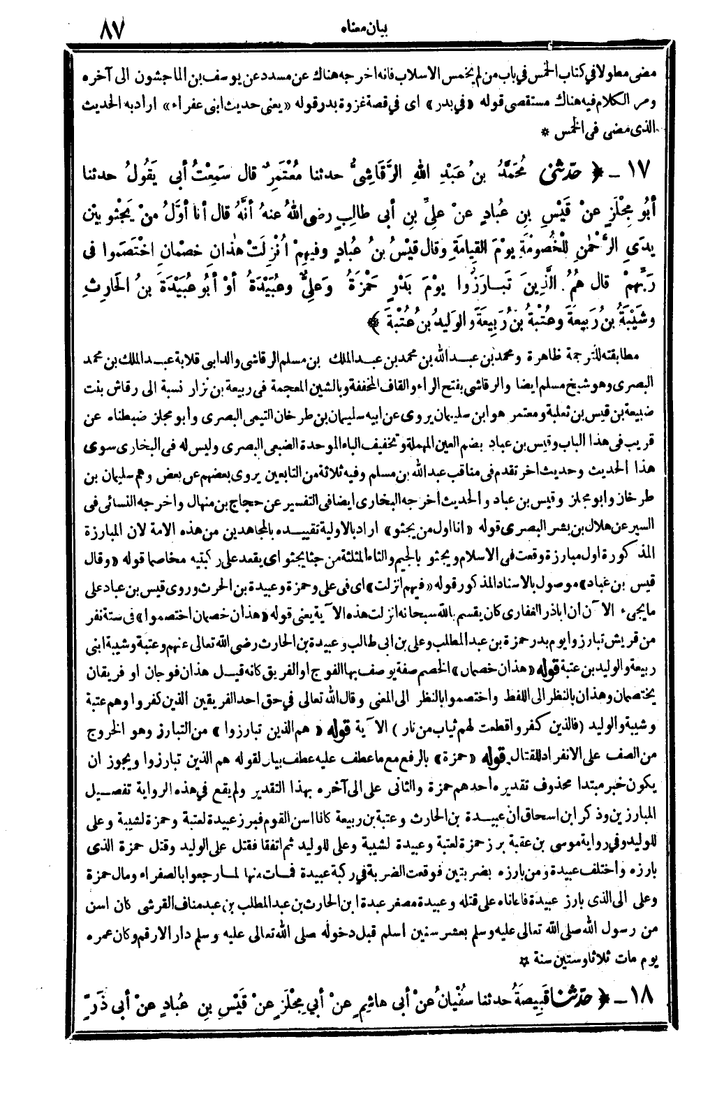 17 - (حَدثنِي مُحَمَّد بن عبد الله الرقاشِي حَدثنَا مُعْتَمر قَالَ سَمِعت أبي يَقُول حَدثنَا أَبُو مجلز عَن قيس بن عباد عَن عَليّ بن أبي طَالب رَضِي الله عَنهُ أَنه قَالَ أَنا أول من يجثو بَين يَدي الرَّحْمَن للخصومة يَوْم الْقِيَامَة وَقَالَ قيس بن عباد وَفِيهِمْ أنزلت هَذَانِ خصمان اخْتَصَمُوا فِي رَبهم قَالَ هم الَّذين تبارزوا يَوْم بدر حَمْزَة وَعلي وَعبيدَة أَو أَبُو عُبَيْدَة بن الْحَارِث وَشَيْبَة بن ربيعَة وَعتبَة بن ربيعَة والوليد بن عتبَة) مطابقته للتَّرْجَمَة ظَاهِرَة وَمُحَمّد بن عبد الله بن مُحَمَّد بن عبد الْملك بن مُسلم الرقاشِي وَالِد أبي قلَابَة عبد الْملك بن مُحَمَّد الْبَصْرِيّ وَهُوَ شيخ مُسلم أَيْضا وَالرَّقَاشِيُّ بِفَتْح الرَّاء وَالْقَاف المخففة وبالشين الْمُعْجَمَة فِي ربيعَة بن نزار نِسْبَة إِلَى رقاش بنت ضبيعة بن قيس بن ثَعْلَبَة ومعتمر هُوَ ابْن سُلَيْمَان يروي عَن أَبِيه سُلَيْمَان بن طرخان التَّيْمِيّ الْبَصْرِيّ وَأَبُو مجلز ضبطناه عَن قريب فِي هَذَا الْبَاب وَقيس بن عباد بِضَم الْعين الْمُهْملَة وَتَخْفِيف الْبَاء الْمُوَحدَة الضبعِي الْبَصْرِيّ وَلَيْسَ لَهُ فِي البُخَارِيّ سوى هَذَا الحَدِيث وَحَدِيث آخر تقدم فِي مَنَاقِب عبد الله بن مُسلم وَفِيه ثَلَاثَة من التَّابِعين يروي بَعضهم عَن بعض وهم سُلَيْمَان بن طرخان وَأَبُو مجلز وَقيس بن عباد والْحَدِيث أخرجه البُخَارِيّ أَيْضا فِي التَّفْسِير عَن حجاج بن منهال وَأخرجه النَّسَائِيّ فِي السّير عَن هِلَال بن بشر الْبَصْرِيّ قَوْله " أَنا أول من يجثو " أَرَادَ بالأولية تَقْيِيده بالمجاهدين من هَذِه الْأمة لِأَن المبارزة الْمَذْكُورَة أول مبارزة وَقعت فِي الْإِسْلَام ويجثو بِالْجِيم والثاء الْمُثَلَّثَة من جثا يجثو أَي يقْعد على رُكْبَتَيْهِ مخاصما قَوْله " وَقَالَ قيس بن عباد " مَوْصُول بِالْإِسْنَادِ الْمَذْكُور قَوْله " فيهم أنزلت " أَي فِي عَليّ وَحَمْزَة وَعبيدَة بن الْحَرْث وروى قيس بن عباد على مَا يَجِيء الْآن أَن أَبَا ذَر الْغِفَارِيّ كَانَ يقسم بِاللَّه سُبْحَانَهُ أنزلت هَذِه الْآيَة يَعْنِي قَوْله {هَذَانِ خصمان اخْتَصَمُوا} فِي سِتَّة نفر من قُرَيْش تبارزوا يَوْم بدر حَمْزَة بن عبد الْمطلب وَعلي بن أبي طَالب وَعبيدَة بن الْحَارِث رَضِي الله تَعَالَى عَنْهُم وَعتبَة وَشَيْبَة ابْني ربيعَة والوليد بن عتبَة قَوْله " هَذَا خصمان " الْخصم صفة يُوصف بهَا الفوج أَو الْفَرِيق كَأَنَّهُ قيل هَذَانِ فوجان أَو فريقان يختصمان وَهَذَانِ بِالنّظرِ إِلَى اللَّفْظ واختصموا بِالنّظرِ إِلَى الْمَعْنى وَقَالَ الله تَعَالَى فِي حق أحد الْفَرِيقَيْنِ الَّذين كفرُوا وهم عتبَة وَشَيْبَة والوليد {فَالَّذِينَ كفرُوا قطعت لَهُم ثِيَاب من نَار} الْآيَة قَوْله " هم الَّذين تبارزوا " من التبارز وَهُوَ الْخُرُوج من الصَّفّ على الِانْفِرَاد لِلْقِتَالِ قَوْله " حَمْزَة " بِالرَّفْع مَعَ مَا عطف عَلَيْهِ عطف بَيَان لقَوْله هم الَّذين تبارزوا وَيجوز أَن يكون خبر مُبْتَدأ مَحْذُوف تَقْدِيره أحدهم حَمْزَة وَالثَّانِي عَليّ إِلَى آخِره بِهَذَا التَّقْدِير وَلم يَقع فِي هَذِه الرِّوَايَة تَفْصِيل المبارزين وَذكر ابْن إِسْحَاق أَن عُبَيْدَة بن الْحَارِث وَعتبَة بن ربيعَة كَانَا أسن الْقَوْم فبرز عُبَيْدَة لعتبة وَحَمْزَة لشيبة وَعلي للوليد وَفِي رِوَايَة مُوسَى بن عقبَة برز حَمْزَة لعتبة وَعبيدَة لشيبة وَعلي للوليد ثمَّ اتفقَا فَقتل عَليّ الْوَلِيد وَقتل حَمْزَة الَّذِي بارزه وَاخْتلف عُبَيْدَة وَمن بارزه بضربتين فَوَقَعت الضَّرْبَة فِي ركبة عُبَيْدَة فَمَاتَ مِنْهَا لما رجعُوا بالصفراء وَمَال حَمْزَة وَعلي إِلَى الَّذِي بارز عُبَيْدَة فأعاناه على قَتله وَعبيدَة مصغر عَبدة ابْن الْحَارِث بن عبد الْمطلب بن عبد منَاف الْقرشِي كَانَ أسن من رَسُول الله