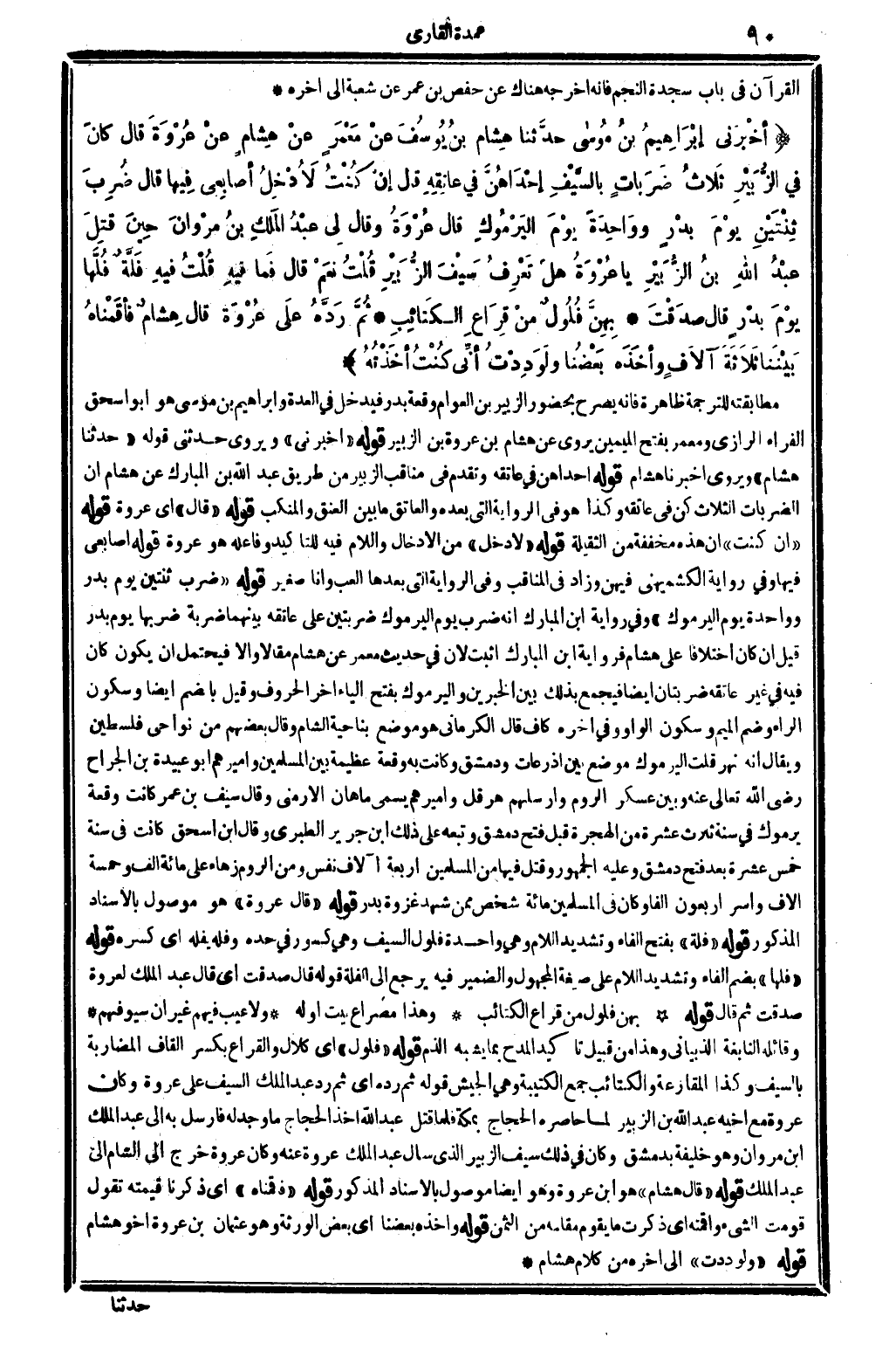 الْقُرْآن فِي: بَاب سَجْدَة النَّجْم، فَإِنَّهُ أخرجه هُنَاكَ عَن حَفْص بن عمر عَن شُعْبَة ... إِلَى آخِره.