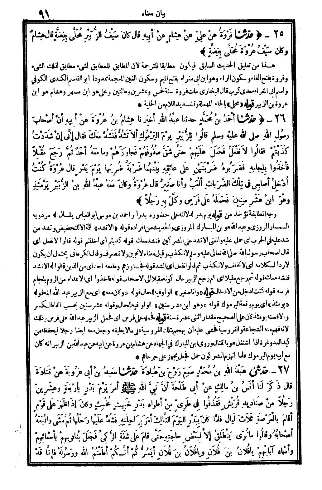 3975 - حدَّثنا أحْمَدُ بنُ مُحَمَّدٍ حدَّثنا عَبْدُ الله أخْبَرَنَا هِشامُ بنُ عُرْوَةَ عنْ أبِيهِ أنَّ أصْحَابَ رَسُولِ الله صلى الله عَلَيْهِ وَسلم قالُوا لِلزّبَيْرِ يَوْمَ اليَرْمُوكِ ألاَ تَشُدُّ فَنَشُدُّ مَعَكَ فَقَالَ إنِّي إنْ شَدَدْتُ كَذَبْتُمْ فقالُوا لاَ نَفْعَلُ فَحَمَلَ علَيْهِمْ حَتَّى شَقَّ صُفُوفَهُمْ فَجَاوَزَهُمْ ومَا مَعَهُ أحَدٌ ثُمَّ رَجَعَ مُقْبِلاً فأخَذُوا بِلِجَامِهِ فضَرَبُوهُ ضَرْبَتَيْنِ علَى عاتِقِهِ بَيْنَهُمَا علَى عاتِقهِ بَيْنَهُمَا ضَرْبَةٌ ضُرِبَهَا يَوْمَ بَدْرٍ قَالَ عُرْوَةُ كُنْتُ أُدْخِلُ أصَابِعِي فِي تِلْكَ الضَّرَبَاتِ ألْعَبُ وأنَا صَغِيرٌ قَالَ عُرْوَةُ وكانَ معَهُ عَبْدُ الله بنُ الزُّبَيْرِ يَوْمَئِذٍ وهْوَ ابنُ عَشْرِ سِنِينَ فحَمَلَهُ علَى فَرَسٍ وكَّلَ بِهِ رَجُلاً. (انْظُر الحَدِيث 3721 وطرفه) .