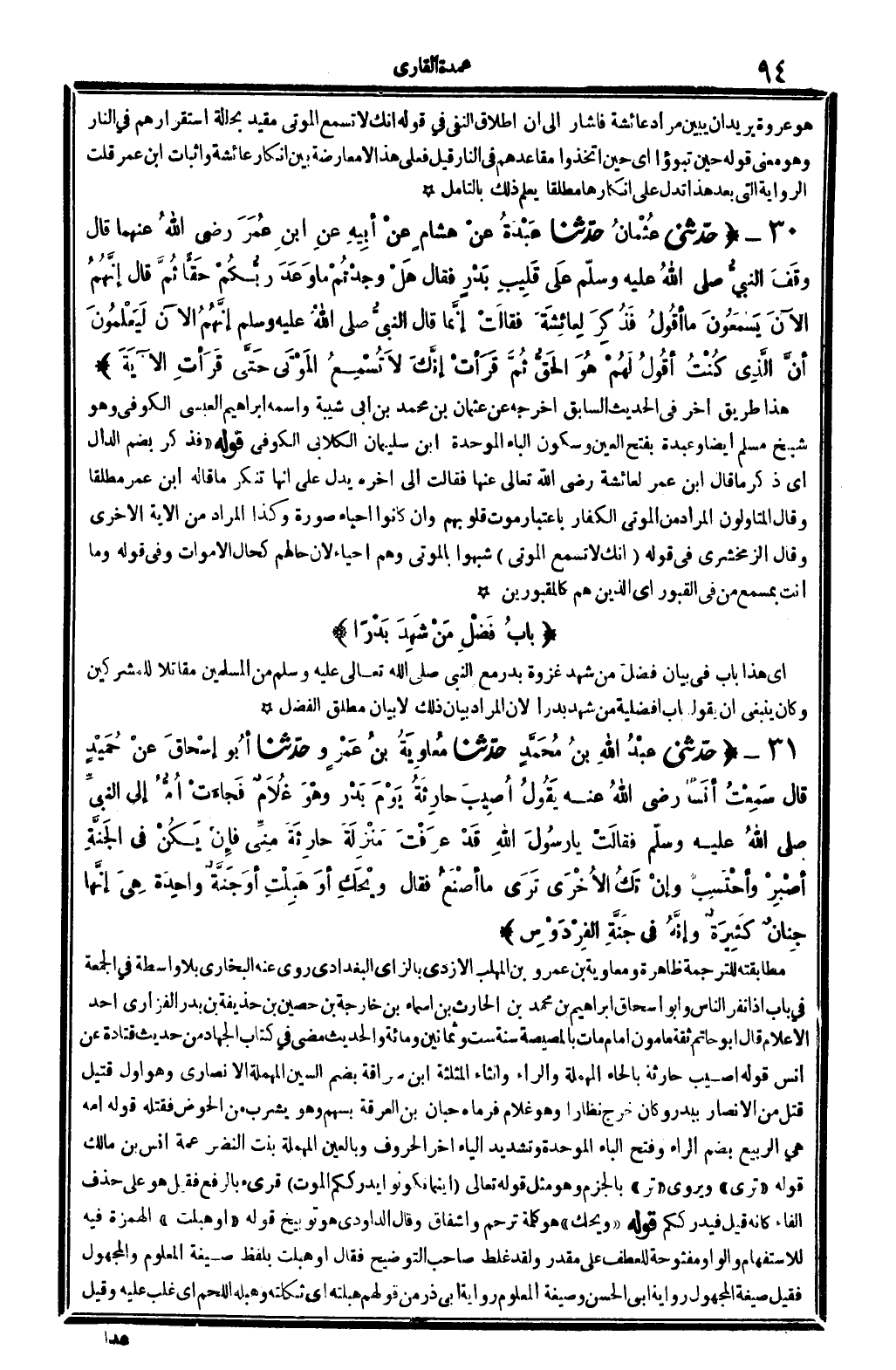 3982 - حدَّثني عَبْدُ الله بنُ مُحَمَّدٍ حدَّثنا مُعاوِيَةُ بنُ عَمْرٍ وحدَّثنا أبُو إسْحَاقَ عنْ حُمَيْدٍ قَالَ سَمِعْتُ أنَسَاً رَضِي الله تَعَالَى عَنهُ يَقُولُ أُصِيبَ حارِثَةُ يَوْمَ بَدْر وهْوَ غُلامٌ فَجاءَتْ أُمُّهُ إِلَى النَّبِي صلى الله عَلَيْهِ وَسلم فقالَتْ يَا رسُولَ الله قَدْ عَرَفْتَ مَنْزِلَةَ حارِثَةَ مِنِّي فإنْ يَكُنْ فِي الجَنَّةِ أصْبِرْ وأحْتَسِبْ وإنْ تَكُ الأخْرَى تَرَى مَا أصْنَعُ فَقَالَ ويْحَكِ أوَ هَبِلْتِ أوَ جَنَّةٌ واحِدَة هِيَ إنَّهَا جِنَانٌ كَثِيرَةٌ وإنَّهُ فِي جَنَّةِ الفِرْدَوْسِ.