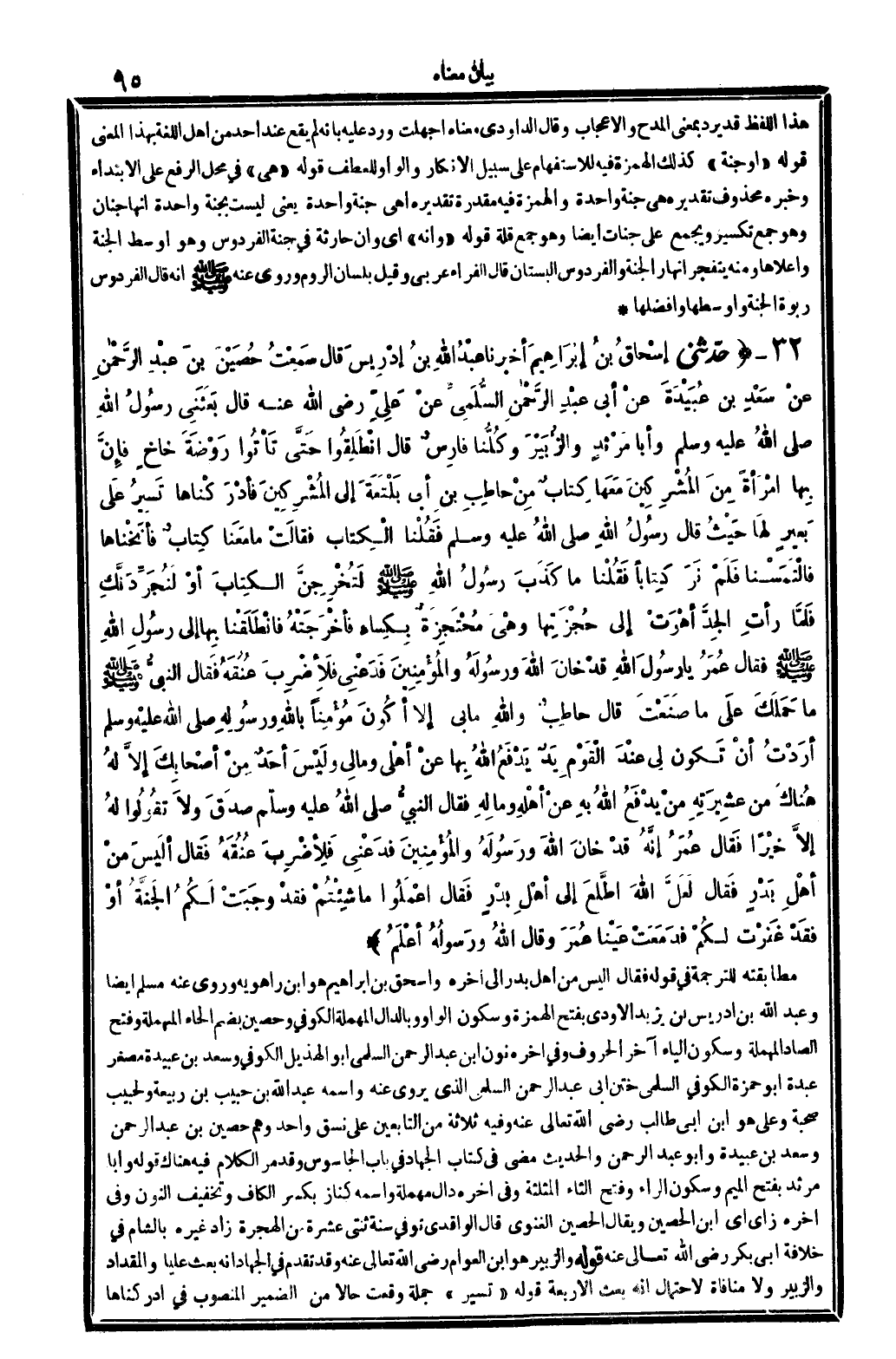 3983 - حدَّثني إسْحَاقُ بنُ إبْرَاهِيمَ أخْبرَنَا عَبْدُ الله بنُ إدْرِيسَ قَالَ سَمِعْتُ حُصَيْنَ بنَ عَبْدِ الرَّحْمانِ عنْ سَعْدِ بنِ عُبَيْدَةَ عنْ أبِي عَبْدِ الرَّحْمانِ السُّلَمِيِّ عنْ عَلِيُ رَضِي الله تَعَالَى عنهُ قَالَ بَعَثَنِي رَسُولُ الله صلى الله عَلَيْهِ وَسلم وَأَبا مَرْثدٍ والزُّبَيْرَ وكُلُّنَا فارِسٌ قالَ انْطَلِقُوا حَتَّى تَأتُوا رَوْضَةَ خاخٍ فإنَّ بِهَا امْرَأةً مِنَ المُشْرِكِينَ مَعَهَا كِتابٌ مِنْ حَاطِبِ بنِ أبِي بَلْتَعَةَ إلَى الْمُشْرِكِينَ فأدْرَكْنَاهَا تَسيرُ علَى بَعِيرٍ لَهَا حَيْثُ قَالَ رسُولُ الله صلى الله عَلَيْهِ وَسلم فَقُلْنَا الْكِتَاب فقالَتْ مَا مَعَنَا كِتَابٌ فأنَخْنَاها فالْتَمَسْنَا فلَمْ نَرَ كِتابَاً فَقُلْنَا مَا كَذَبَ رسُولُ الله صلى الله عَلَيْهِ وَسلم لَتُخْرِجِنَّ الكِتَابَ أوْ لَنُجَرِّدَنَّكِ فلَمَّا رأتِ الجِدَّ أهْوَتْ إلَى حُجْزَتِهَا وهْيَ مُحْتَجِزَةٌ بِكِسَاءٍ فأخْرَجَتْهُ فانْطَلَقْنَا بِهَا إلَى رَسُولِ الله صلى الله عَلَيْهِ وَسلم فَقَالَ عُمَرُ يَا رسُولَ الله قَدْ خَانَ الله ورسُولَهُ والْمُؤْمِنِينَ فَدَعْنِي فَلأضْرِبَ عُنُقَهُ فقالَ النَّبِيُّ صلى الله عَلَيْهِ وَسلم مَا حَمَلَكَ علَى مَا صَنَعْتَ قَالَ حاطِبٌ وَالله مَا بِي إِلَّا أكُونَ مُؤْمِنَاً بِاللَّه ورَسُولِهِ صلى الله عَلَيْهِ وَسلم أرَدْتُ أنْ تَكُونَ لِي عِنْدَ القَوْمِ يَدٌ يَدْفَعُ الله بِهَا عَنْ أهْلِي ومالِي ولَيْسَ أحَدٌ مِنْ أصْحَابِكَ إلاَّ لَهُ هُنَاكَ مِنْ عَشِيرَتِهِ مَنْ يَدْفَعُ الله بِهِ عنْ أهْلِهِ ومالِهِ فَقَالَ النَّبِيُّ صلى الله عَلَيْهِ وَسلم صَدَقَ ولاَ تَقُولُوا لَهُ إلاَّ خَيْرَاً فَقالَ عُمَرُ إنَّهُ قدْ خَانَ الله ورَسُولَهُ والمُؤْمِنِينَ فدَعْنِي فَلأَضْرِبَ عُنُقَهُ فَقالَ ألَيْسَ مِنْ أهْلِ بَدْرٍ فَقَالَ لَعَلَّ الله اطَّلَعَ إلَى أهْلِ بَدْرٍ فَقال اعْمَلُوا مَا شِئْتُمْ فقدْ وَجَبَتْ لَكُمْ الجَنَّةُ أوْ فَقَدْ غَفرْت لَكُمْ فدَمَعَتْ عَيْنَا عُمَرَ وَقَالَ الله ورَسُولُهُ أعْلَمُ. .