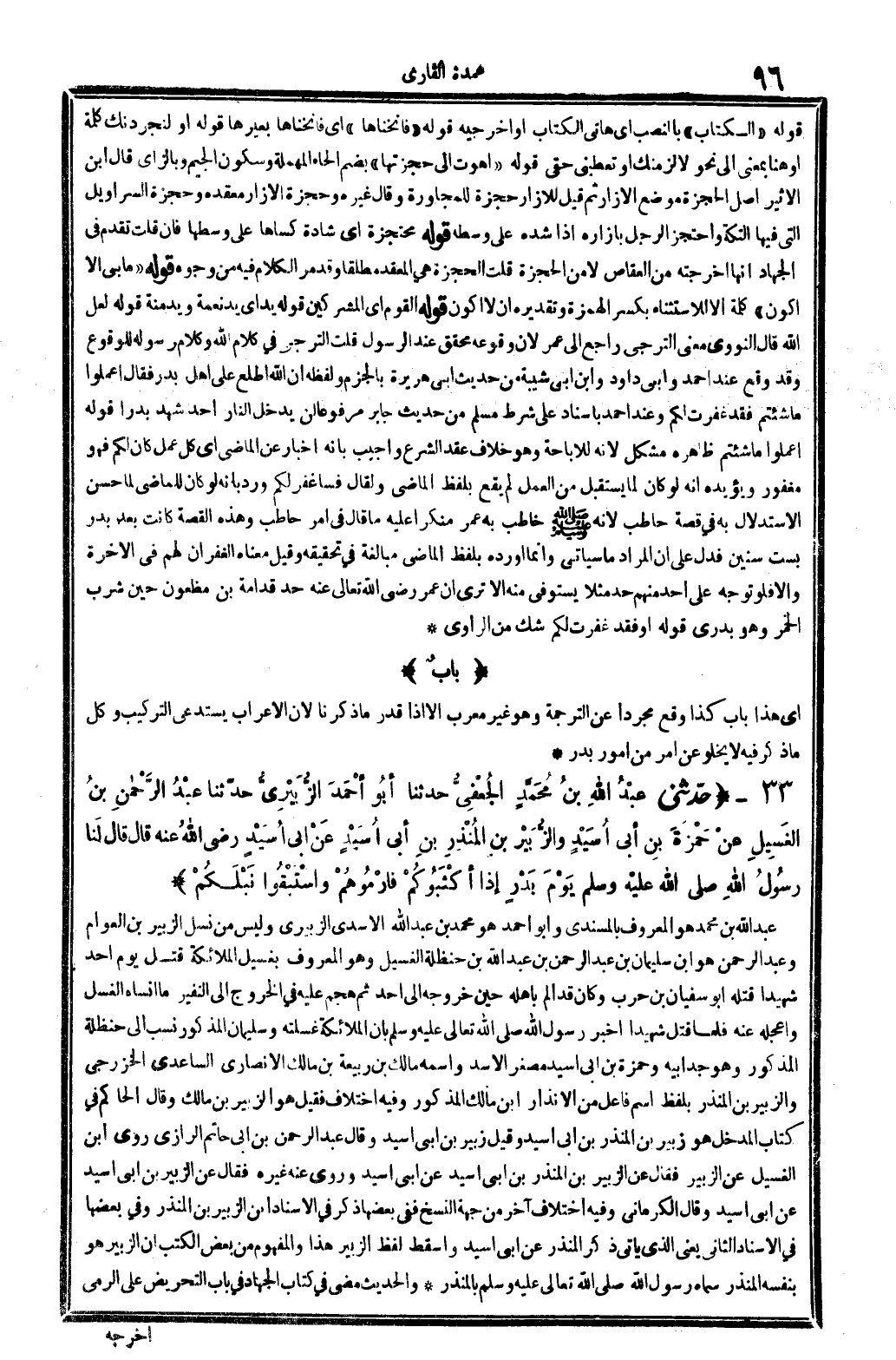 33 - (حَدثنِي عبد الله بن مُحَمَّد الْجعْفِيّ حَدثنَا أَبُو أَحْمد الزبيرِي حَدثنَا عبد الرَّحْمَن بن الغسيل عَن حَمْزَة بن أبي أسيد وَالزُّبَيْر بن الْمُنْذر بن أبي أسيد عَن أبي أسيد رَضِي الله عَنهُ قَالَ قَالَ لنا رَسُول الله - صَلَّى اللَّهُ عَلَيْهِ وَسَلَّم َ - يَوْم بدر إِذا أكثبوكم فارموهم واستبقوا نبلكم) عبد الله بن مُحَمَّد هُوَ الْمَعْرُوف بالمسندي وَأَبُو أَحْمد هُوَ مُحَمَّد بن عبد الله الْأَسدي الزبيرِي وَلَيْسَ من نسل الزبير بن الْعَوام وَعبد الرَّحْمَن هُوَ ابْن سُلَيْمَان بن عبد الرَّحْمَن بن عبد الله بن حَنْظَلَة الغسيل وَهُوَ الْمَعْرُوف بغسيل الْمَلَائِكَة قتل يَوْم أحد شَهِيدا قَتله أَبُو سُفْيَان بن حَرْب وَكَانَ قد ألم بأَهْله حِين خُرُوجه إِلَى أحد ثمَّ هجم عَلَيْهِ فِي الْخُرُوج إِلَى النفير مَا أنساه الْغسْل وأعجله عَنهُ فَلَمَّا قتل شَهِيدا أخبر رَسُول الله - صَلَّى اللَّهُ عَلَيْهِ وَسَلَّم َ - بِأَن الْمَلَائِكَة غسلته وَسليمَان الْمَذْكُور نسب إِلَى حَنْظَلَة الْمَذْكُور وَهُوَ جد أَبِيه وَحَمْزَة بن أبي أسيد مصغر الْأسد واسْمه مَالك بن ربيعَة بن مَالك الْأنْصَارِيّ السَّاعِدِيّ الخزرجي وَالزُّبَيْر بن الْمُنْذر بِلَفْظ اسْم فَاعل من الانذار ابْن مَالك الْمَذْكُور وَفِيه اخْتِلَاف فَقيل هُوَ الزبير بن مَالك وَقَالَ الْحَاكِم فِي كتاب الْمدْخل هُوَ زبير بن الْمُنْذر بن أبي أسيد وَقيل زبير بن أبي أسيد وَقَالَ عبد الرَّحْمَن بن أبي حَاتِم الرَّازِيّ روى ابْن الغسيل عَن الزبير فَقَالَ عَن الزبير بن الْمُنْذر بن أبي أسيد عَن أبي أسيد وروى عَنهُ غَيره فَقَالَ عَن الزبير بن أبي أسيد عَن أبي أسيد وَقَالَ الْكرْمَانِي وَفِيه اخْتِلَاف آخر من جِهَة النّسخ فَفِي بَعْضهَا ذكر فِي الْإِسْنَاد ابْن الزبير بن الْمُنْذر وَفِي بَعْضهَا فِي الْإِسْنَاد الثَّانِي يَعْنِي الَّذِي يَأْتِي ذكر الْمُنْذر عَن أبي أسيد وَأسْقط لفظ الزبير هَذَا وَالْمَفْهُوم من بعض الْكتب أَن الزبير هُوَ بِنَفسِهِ الْمُنْذر سَمَّاهُ رَسُول الله - صَلَّى اللَّهُ عَلَيْهِ وَسَلَّم َ - بالمنذر والْحَدِيث مضى فِي كتاب الْجِهَاد فِي بَاب التحريض على الرَّمْي