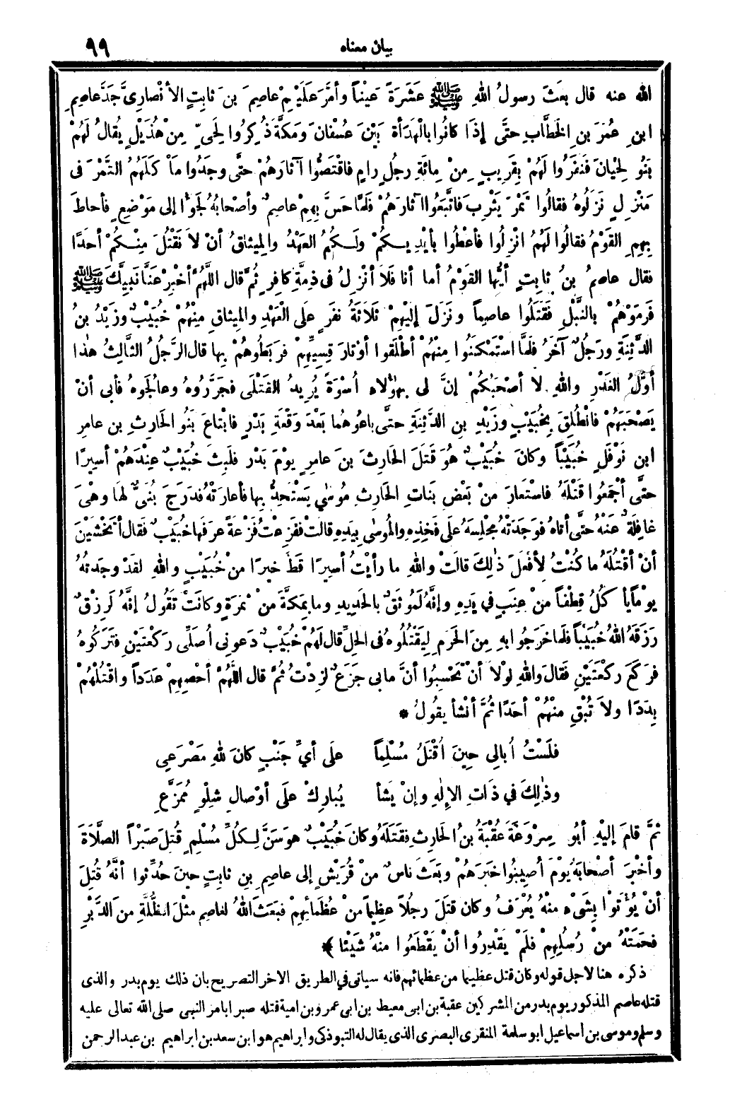 الله تَعَالَى عَنهُ قَالَ بَعَثَ رسُولُ الله صلى الله عَلَيْهِ وَسلم عَشَرَةَ عَيْنَاً وأمَّرَ عَلَيْهِمْ عاصِمَ بنَ ثابِتٍ الأنْصَارِيَّ جدَّ عاصِمِ ابنِ عُمرَ بنِ الخَطَّابِ حتَّى إذَا كَانُوا بالْهَدَأةِ بَيْنَ عُسْفَانَ ومَكَّةَ ذُكِرُوا لِحَيٍّ مِنْ هُذَيْلٍ يُقالُ لَهُمْ بَنُو لِحْيَانَ فنَفَرُوا لَهُمْ بِقَرِيبٍ مِنْ مِائَةِ رَجُلٍ رامٍ فاقْتَصُّوا آثَارَهُمْ حتَّى وجَدُوا مأكَلَهُمُ التَّمْرَ فِي مَنْزِلٍ نَزَلُوهُ فقالُوا تَمْرَ يَثْرِبَ فاتَّبَعُوا آثارَهُمْ فلَمَّا حَسَّ بِهِمْ عاصِمٌ وأصْحَابُهُ لَجؤا إِلَى مَوْضِعٍ فأحاطَ بِهِمِ القَوْمُ فقالُوا لَهُمْ انْزِلُوا فأعْطُوا بأيْدِيكُمْ ولَكُمُ العَهْدُ والمِيثَاقُ أنْ لاَ نَقْتُلَ مِنْكُمْ أحَدَاً فَقَالَ عاصِمُ بنُ ثابِتٍ أيُّهَا القَوْمُ أمَا أنَا فَلا أنْزِلُ فِي ذِمَّةِ كافِرٍ ثُمَّ قالَ أللَّهُمَّ أخْبِرْ عَنَّا نَبِيَّكَ صلى الله عَلَيْهِ وَسلم فرَمُوهُمْ بالنَّبْلِ فَقَتَلُوا عاصِمَاً ونَزَلَ إلَيْهِمْ ثلاَثَةُ نَفَرٍ علَى الْعَهْدِ والمِيثَاقِ مِنْهُمْ خُبَيْبٌ وزَيْدُ بنُ الدَّثِنَةِ ورَجُلٌ آخَرُ فلَمَّا اسْتَمْكَنُوا مِنْهُمْ أطْلَقُوا أوْتَارَ قِسِيِّهِمْ فرَبَطُوهُمْ بِهَا قَالَ الرَّجُلُ الثَّالِثُ هاذَا أوَّلُ الغَدْرِ وَالله لَا أصْحَبُكُمْ إنَّ لِي بِهاؤُلاءِ أُسْوَةً يُرِيدُ القَتْلَى فجَرَّرُوهُ وعَالَجُوهُ فأبَى أنْ يَصْحَبَهُمْ فانْطُلِقَ بِخُبَيْبٍ وزَيْدِ بنِ الدَّثِنَةِ حتَّى باعُوهَما بعْدَ وَقْعَةِ بَدْرٍ فابْتاعَ بنُو الحَرِثِ بنِ عامِرِ ابنِ نَوْفَلٍ خُبَيْبَاً وكانَ خُبَيْبٌ هُوَ قتَلَ الحَرِثَ بنَ عامِرٍ يَوْمَ بَدْرٍ فلَبِثَ خُبَيْبٌ عِنْدَهُمْ أسِيرَاً حتَّى أجْمَعُوا قتْلَهُ فاسْتَعَارَ مِنْ بَعْضِ بَناتِ الحَارِث مُوساى يَسْتَحِدُّ بِهَا فأعَارَتْهُ فدَرَجَ بُنَيُّ لَهَا وهْيَ غافِلَةٌ عَنْهُ حتَّى أتَاهُ فوَجَدَتْهُ مُجْلِسَهُ علَى فَخْذِهِ والمُوساى بِيَدِهِ قالَتْ فَفَزِعْتُ فَزْعَةً عَرَفَها خُبَيْبٌ فَقالَ أتَخْشَيْنَ أنْ أقْتُلَهُ مَا كُنْتُ لأفْعَلَ ذالِكَ قالَتْ وَالله مَا رأيْتُ أسِيراً قَطُّ خَيْرَاً مِنْ خُبِيبٍ وَالله لَقَدْ وجَدْتُهُ يَوْمَاً يأكُلُ قِطْفاً مِنْ عِنَبٍ فِي يَدِهِ وإنَّهُ لَمُوثَقٌ بالحَدِيدِ وَمَا بِمَكَّةَ مِنْ ثَمَرَةٍ وكانَتْ تَقُولُ إنَّهُ لَرِزْقٌ رَزَقَهُ الله خُبَيْبَاً فلَمَّا خَرَجُوا بِهِ مِنَ الحَرَمِ لِيَقْتُلُوهُ فِي الحِلِّ قَالَ لَهُمْ خُبَيْبٌ دَعُونِي أُصَلِّي رَكْعَتَيْنِ فتَرَكُوهُ فرَكَعَ رَكْعَتَيْنِ فَقالَ وَالله لَوْلاَ أنْ تَحْسِبُوا أنَّ مَا بِي جَزَعٌ لَزِدْتُ ثُمَّ قالَ اللَّهُمَّ أحْصِهِمْ عَدَدَاً واقْتُلْهُمْ بِدَدَاً ولاَ تُبْقِ مِنْهُمْ أحَدَاً ثُمَّ أنْشأ يَقُولُ: