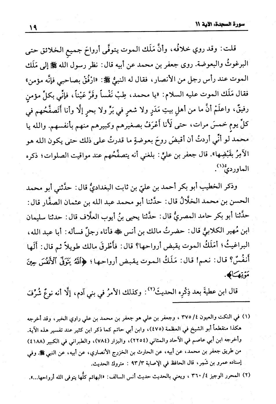 وَيُبَيِّنُ هَذَا الْمَعْنَى مَا رُوِيَ عَنِ ابْنِ مَسْعُودٍ أَنَّهُ قَالَ: مَا فِي النَّارِ بَيْتٌ وَلَا سِلْسِلَةٌ وَلَا مِقْمَعٌ وَلَا تَابُوتٌ إِلَّا وَعَلَيْهِ اسْمُ صَاحِبِهِ، فَكُلُّ وَاحِدٍ مِنَ الْخَزَنَةِ يَنْتَظِرُ صَاحِبَهُ الَّذِي قَدْ عَرَفَ اسْمَهُ وَصِفَتَهُ، فَإِذَا اسْتَوْفَى [كُلُّ وَاحِدٍ مِنْهُمْ «2»] مَا أُمِرَ بِهِ وَمَا يَنْتَظِرُهُ وَلَمْ يَبْقَ مِنْهُمْ أَحَدٌ قَالَ الْخَزَنَةُ: قَطْ قَطْ حَسْبُنَا حَسْبُنَا أَيِ اكْتَفَيْنَا اكْتَفَيْنَا، وَحِينَئِذٍ تَنْزَوِي جَهَنَّمُ عَلَى مَنْ فِيهَا وَتَنْطَبِقُ إِذْ لَمْ يَبْقَ أَحَدٌ يَنْتَظِرُ. فَعَبَّرَ عَنْ ذَلِكَ الْجَمْعِ الْمُنْتَظِرِ بِالرِّجْلِ وَالْقَدَمِ، وَيَشْهَدُ لِهَذَا التَّأْوِيلِ قَوْلُهُ فِي نَفْسِ الْحَدِيثِ: (وَلَا يَزَالُ فِي الْجَنَّةِ فَضْلٌ حَتَّى يُنْشِئَ اللَّهُ لَهَا خَلْقًا فَيُسْكِنَهُمْ فَضْلَ الْجَنَّةِ) وَقَدْ زِدْنَا هَذَا الْمَعْنَى بَيَانًا وَمَهَّدْنَاهُ فِي كِتَابِ الْأَسْمَاءِ وَالصِّفَاتِ مِنَ الْكِتَابِ الْأَسْنَى وَالْحَمْدُ لِلَّهِ. وَقَالَ النَّضْرُ بْنُ شُمَيْلٍ فِي مَعْنَى قَوْلِهِ عَلَيْهِ السَّلَامُ: (حَتَّى يَضَعَ الْجَبَّارُ فِيهَا قَدَمَهُ) أَيْ مَنْ سَبَقَ فِي عِلْمِهِ أَنَّهُ مِنْ أَهْلِ النَّارِ. قَوْلُهُ تَعَالَى: (وَأُزْلِفَتِ الْجَنَّةُ لِلْمُتَّقِينَ غَيْرَ بَعِيدٍ) أي فربت مِنْهُمْ. وَقِيلَ: هَذَا قَبْلَ الدُّخُولِ فِي الدُّنْيَا، أَيْ قُرِّبَتْ مِنْ قُلُوبِهِمْ حِينَ قِيلَ لَهُمُ اجتنبوا المعاصي. وقيل: بعد الدخول