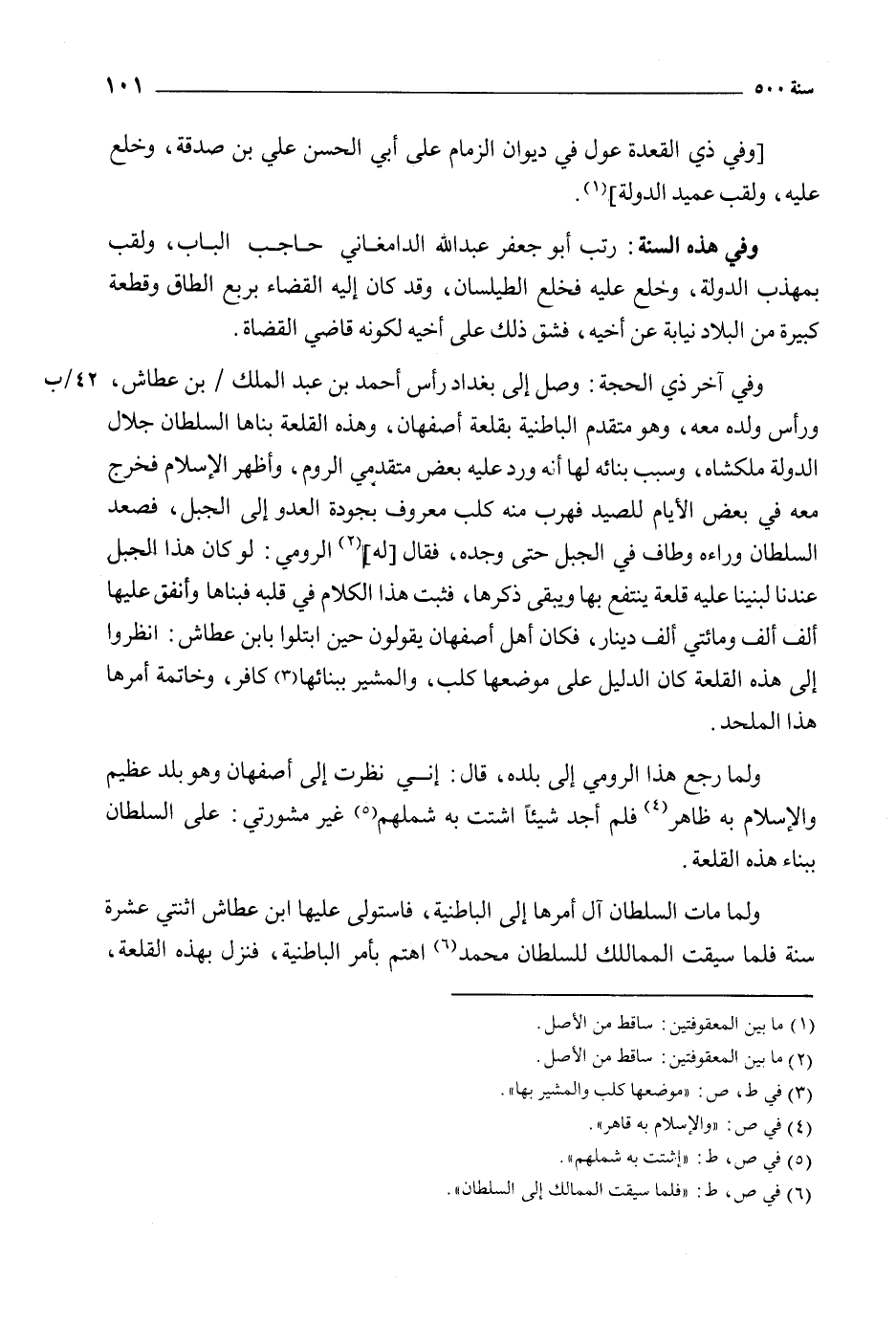 وفي آخر ذي الحجة: وصل إلى بغداد رأس أحمد بن عبد الملك/ بن عطاش، 42/ ب ورأس ولده معه، وهو متقدم الباطنية بقلعة أصفهان، وهذه القلعة بناها السلطان جلال الدولة ملك شاه، وسبب بنائه لها أنه ورد عليه بعض متقدمي الروم، وأظهر الإسلام فخرج معه في بعض الأيام للصيد فهرب منه كلب معروف بجودة العدو إلى الجبل، فصعد السلطان وراءه وطاف في الجبل حتى وجده، فقال [له] [2] الرومي: لو كان هذا الجبل عندنا لبنينا عليه قلعة ينتفع بها ويبقى ذكرها، فثبت هذا الكلام في قلبه فبناها وانفق عليها ألف ألف ومائتي ألف دينار، فكان أهل أصفهان يقولون حين ابتلوا بابن عطاش: انظروا إلى هذه القلعه كان الدليل على موضعها كلب، والمشير ببنائها [3] كافر، وخاتمة أمرها هذا الملحد.