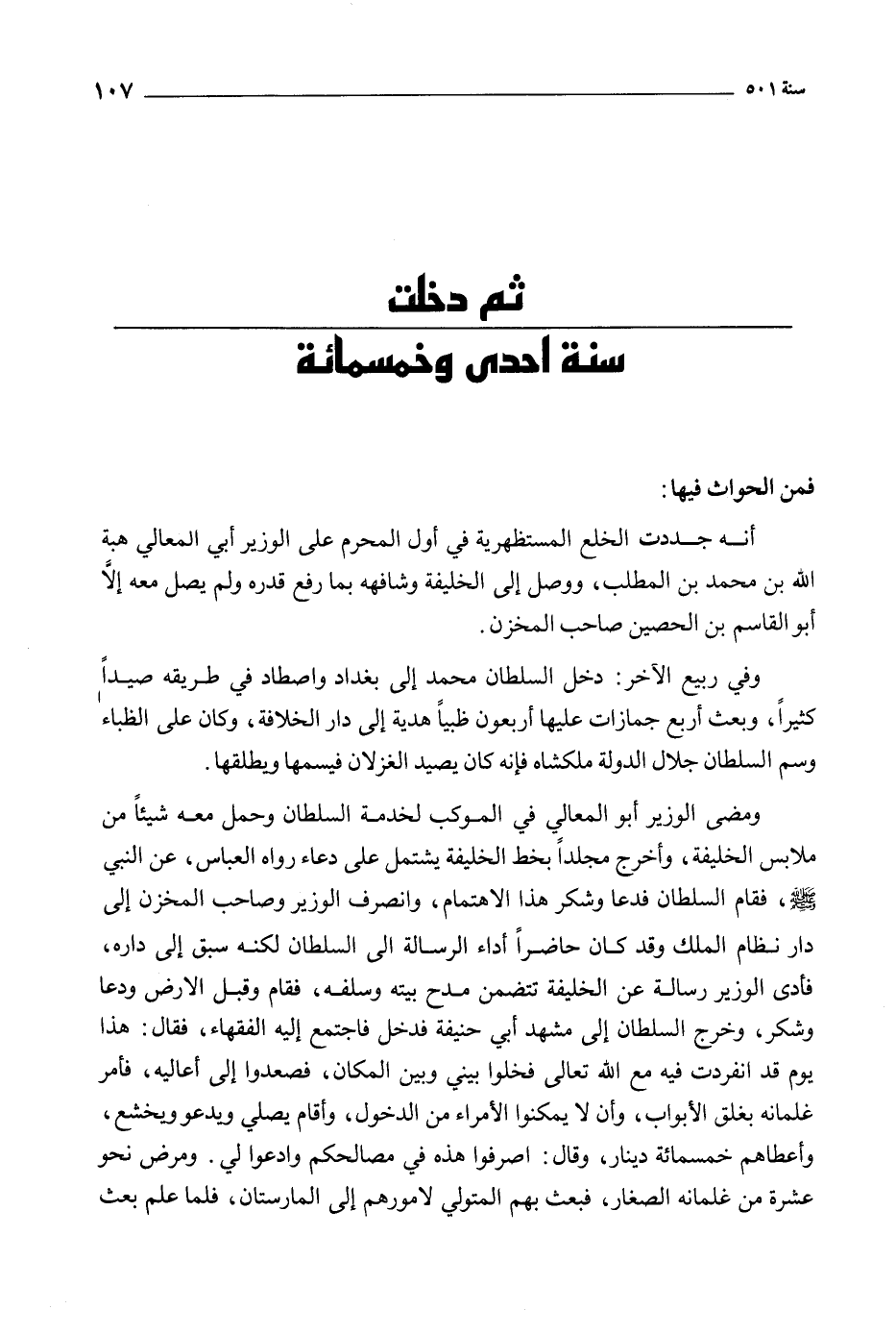 أنه جددت الخلع المستظهرية في أول المحرم على الوزير أبي المعالي هبة الله بن محمد بن المطلب، ووصل إلى الخليفة وشافهه بما رفع قدره ولم يصل معه إلا أبو القاسم بن الحصين صاحب المخزن.