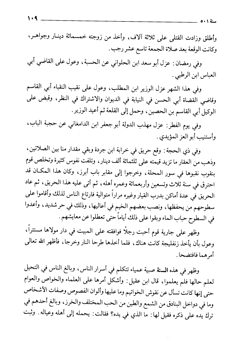 وفي ذي الحجة: وقع حريق في خرابة ابن جردة وبقي مقدار منا بين الصلاتين، وذهب من العقار ما تزيد قيمته على ثلاثمائة ألف دينار، وتلفت نفوس كثيرة وتخلص قوم بنقوب نقبوها في سور المحلة، وخرجوا إلى مقابر باب أبرز، وكان هذا المكان قد احترق في سنة ثلاث وتسعين وأربعمائة وعمره أهله، ثم أتى عليه هذا الحريق، ثم عاد الحريق في عدة أماكن بدرب القيار وغيره مرارا متوالية فارتاع الناس لذلك وأقاموا على سطوحهم من يحفظها، ونصب بعضهم الخيم في أعاليها، وذلك في حر شديد، وأعدوا في السطوح حباب الماء وبقوا على ذلك أياما حتى تعطلوا عن معايشهم.