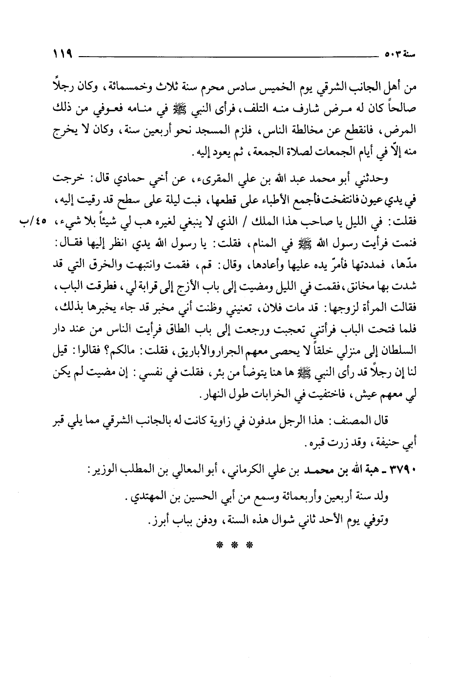 مدها، فمددتها فأمر يده عليها وأعادها، وقال: قم، فقمت وانتبهت والخرق التي قد شدت بها مخانق، فقمت في الليل ومضيت إلى باب الأزج إلى قرابة لي، فطرقت الباب، فقالت المرأة لزوجها: قد مات فلان، تعنيني وظنت أني مخبر قد جاء يخبرها بذلك، فلما فتحت الباب فرأتني تعجبت ورجعت إلى باب الطاق فرأيت الناس من عند دار السلطان إلى منزلي خلقا لا يحصى معهم الجرار والأباريق، فقلت: ما لكم؟ فقالوا: قيل لنا أن رجلا قد رأى النبي صلى الله عليه وسلم ها هنا يتوضأ من بئر، فقلت في نفسي: إن مضيت لم يكن لي معهم عيش، فاختفيت في الخرابات طول النهار.