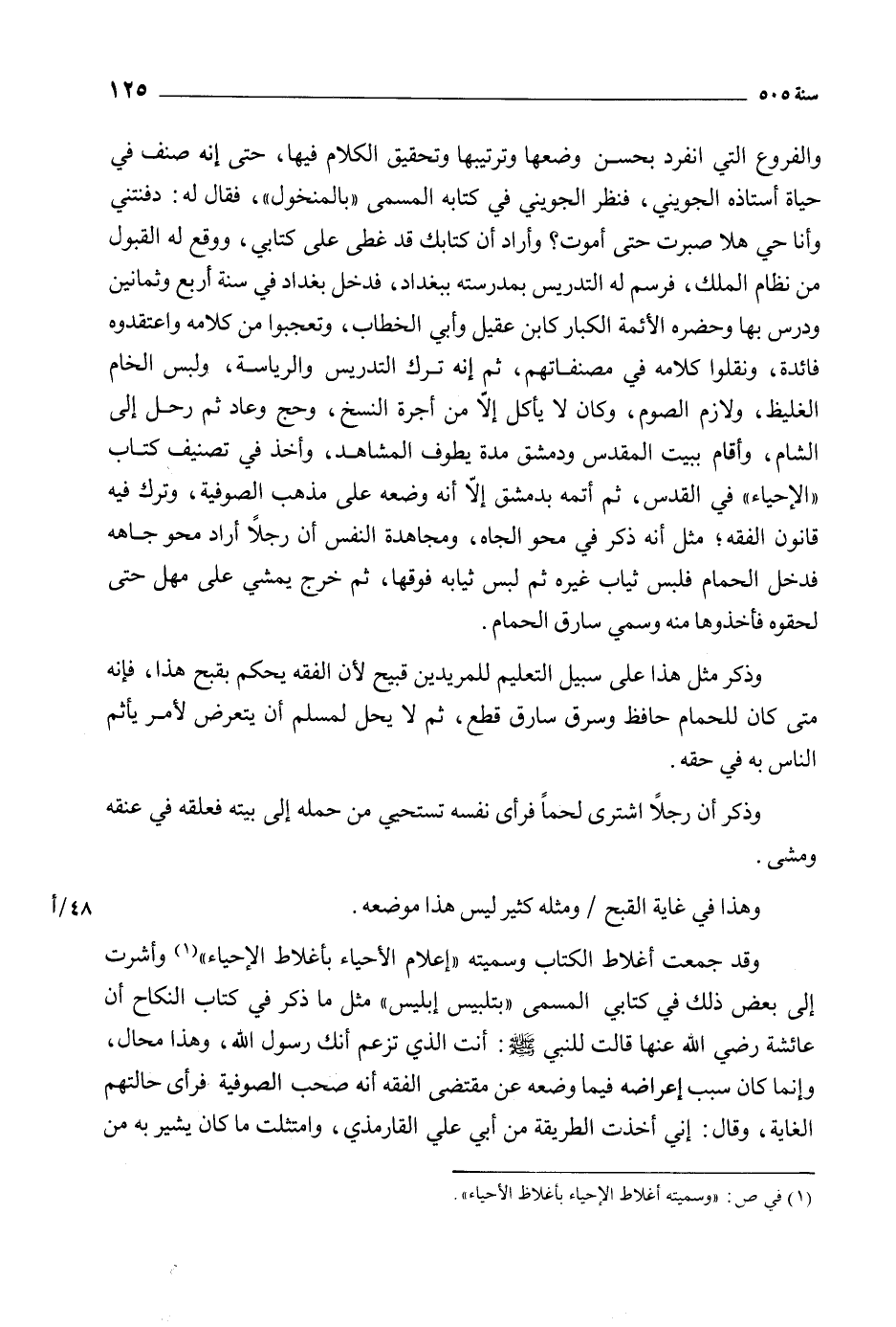 وهذا في غاية القبح/ ومثله كثير ليس هذا موضعه. 48/ أوقد جمعت أغلاط الكتاب وسميته «إعلام الإحياء بأغلاط الإحياء» [1] وأشرت إلى بعض ذلك في كتابي المسمى «بتلبيس إبليس» مثل ما ذكر في كتاب النكاح أن عائشة رضي الله عنها قالت للنبي صلى الله عليه وسلم: أنت الذي تزعم أنك رسول الله، وهذا محال، وإنما كان سبب إعراضه فيما وضعه عن مقتضى الفقه أنه صحب الصوفية فرأى حالتهم الغاية، وقال: إني أخذت الطريقة من أبي علي الفارمذي، وامتثلت ما كان يشير به من