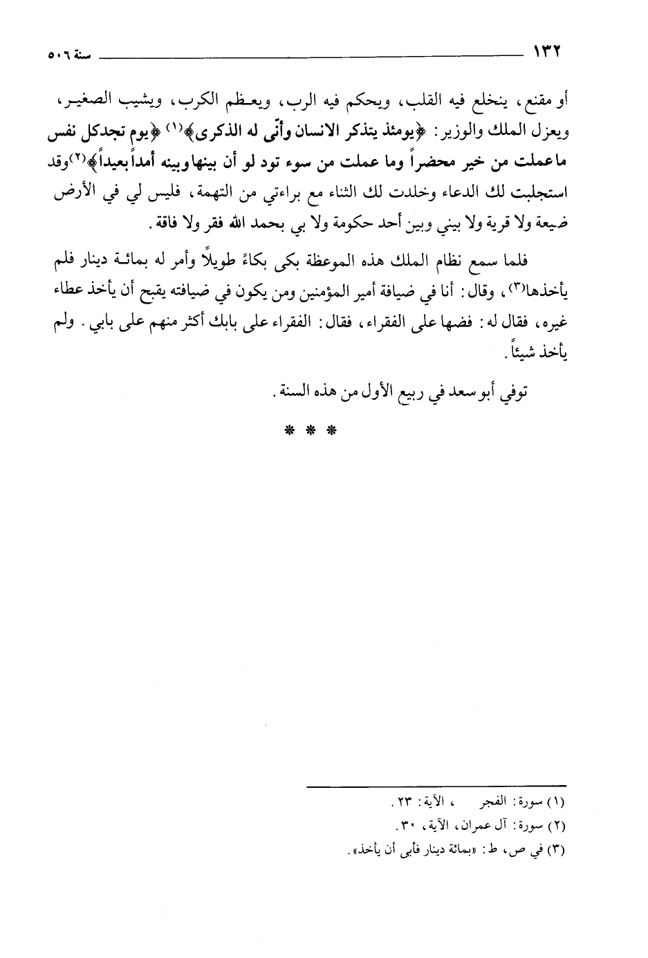 أو مقنع، ينخلع فيه القلب، ويحكم فيه الرب، ويعظم الكرب، ويشيب الصغير، ويعزل الملك والوزير: يَوْمَئِذٍ يَتَذَكَّرُ الْإِنْسانُ وَأَنَّى لَهُ الذِّكْرى 89: 23 [1] يَوْمَ تَجِدُ كُلُّ نَفْسٍ مَا عَمِلَتْ مِنْ خَيْرٍ مُحْضَراً وَما عَمِلَتْ مِنْ سُوءٍ تَوَدُّ لَوْ أَنَّ بَيْنَها وَبَيْنَهُ أَمَداً بَعِيداً 3: 30 [2] وقد استجلبت لك الدعاء وخلدت لك الثناء مع براءتي من التهمة، فليس لي في الأرض ضيعة ولا قرية ولا بيني وبين أحد حكومة ولا بي بحمد الله فقر ولا فاقة.