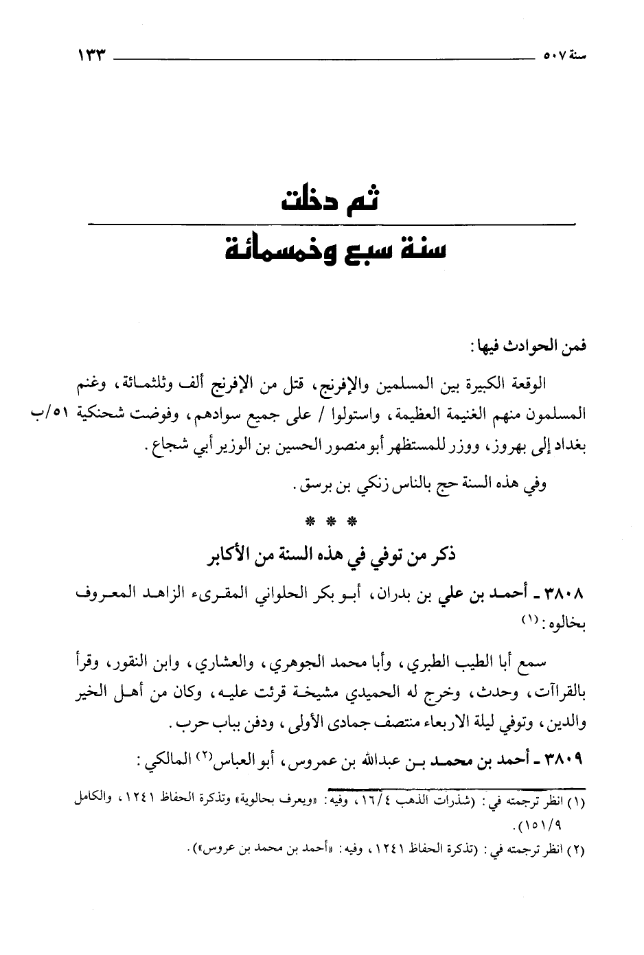 الوقعة الكبيرة بين المسلمين والإفرنج، قتل من الإفرنج ألف وثلاثمائة، وغنم المسلمون منهم الغنيمة العظيمة، واستولوا/ على جميع سوادهم، وفوضت شحنكية 51/ ب بغداد إلى بهروز، ووزر للمستظهر أبو منصور الحسين بن الوزير أبى شجاع.
