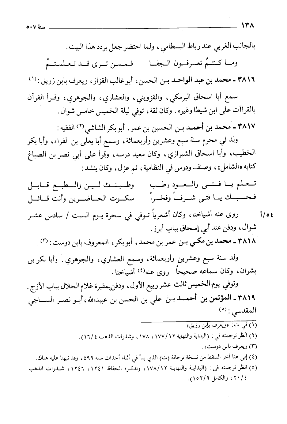 [5] انظر ترجمته في: (البداية والنهاية 12/ 178، وتذكرة الحفاظ 1241، 1246، شذرات الذهب 4/ 20، والكامل 9/ 152) .