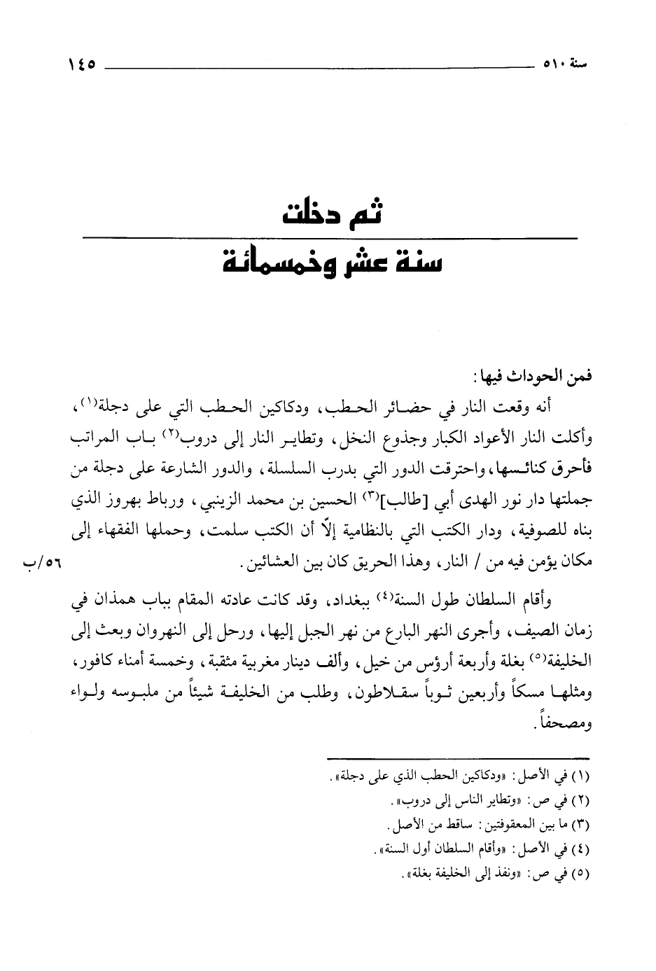 أنه وقعت النار في حضائر الحطب، ودكاكين الحطب التي على دجلة [1] ، وأكلت النار الأعواد الكبار وجذوع النخل، وتطاير النار إلى دروب [2] باب المراتب فأحرق كنائسها، واحترقت الدور التي بدرب السلسلة، والدور الشارعة على دجلة من جملتها دار نور الهدى أبي [طالب] [3] الحسين بن محمد الزينبي، ورباط بهروز الذي بناه للصوفية، ودار الكتب التي بالنظامية إلا ان الكتب سلمت، وحملها الفقهاء إلى مكان يؤمن فيه من/ النار، وهذا الحريق كان بين العشائين.
