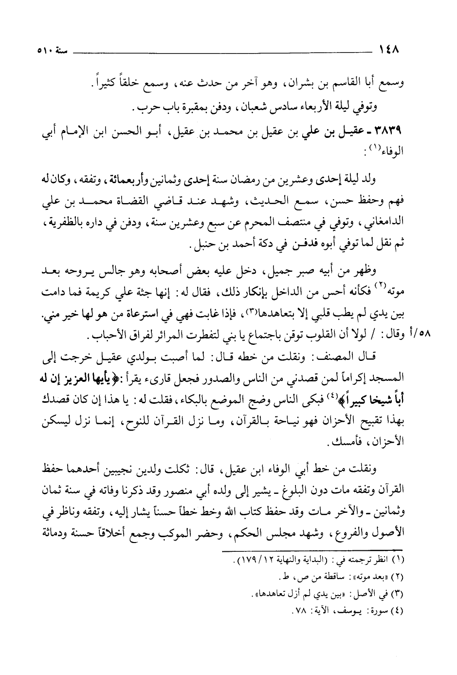 3839- عقيل بن على بن عقيل بن محمد بن عقيل، أبو الحسن ابن الإمام أبي الوفاء