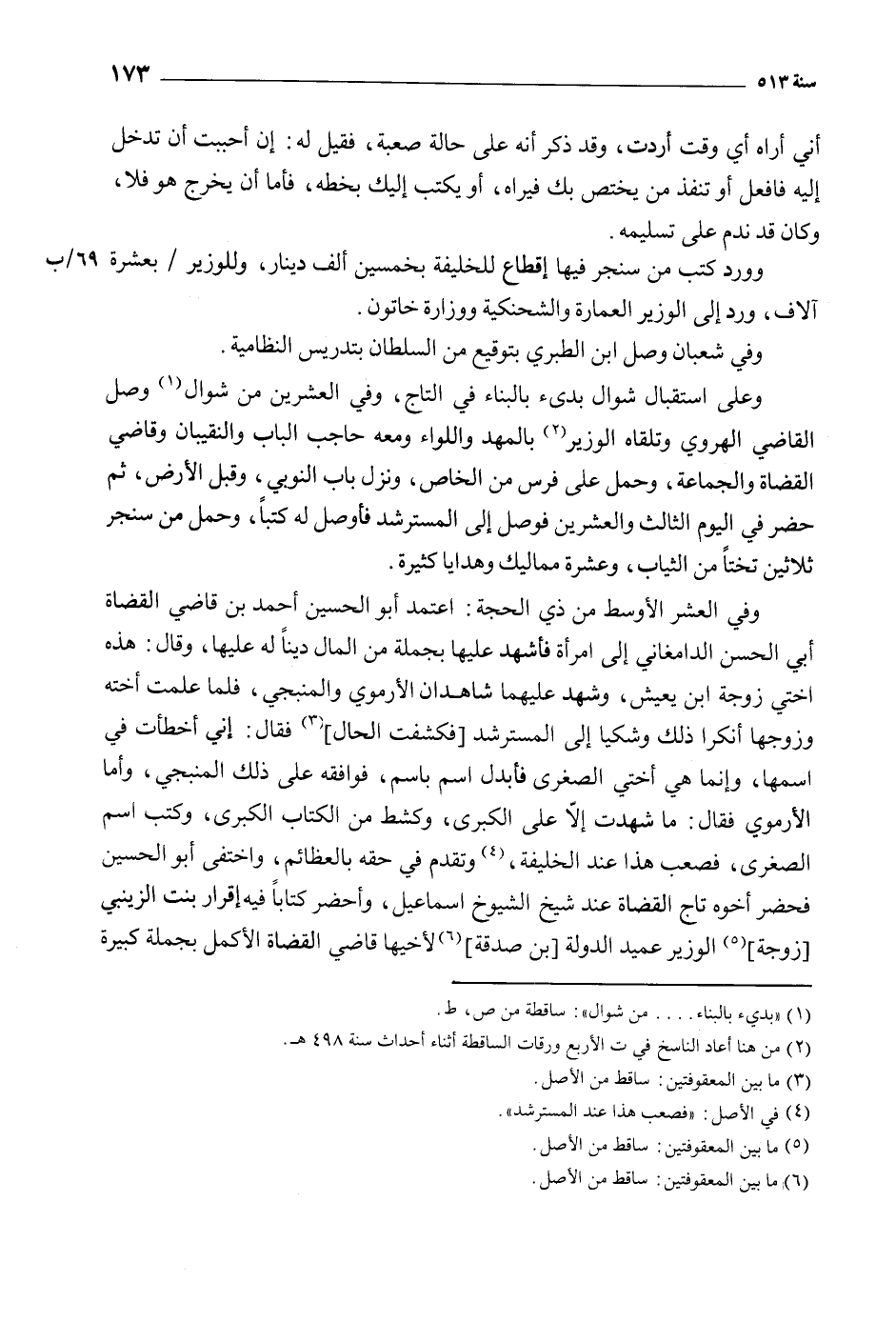 وفي العشر الأوسط من ذي الحجة: اعتمد أبو الحسين أحمد بن قاضي القضاة أبي الحسن الدامغاني إلى امرأة فأشهد عليها بجملة من المال دينا له عليها، وقال: هذه أختي زوجة ابن يعيش، وشهد عليهما شاهدان الأرموي والمنبجي، فلما علمت أخته وزوجها أنكرا ذلك وشكيا إلى المسترشد [فكشفت الحال] [3] فقال: إني أخطأت في اسمها، وإنما هي أختي الصغرى فأبدل اسم باسم، فوافقه على ذلك المنبجي، وأما الأرموي فقال: ما شهدت إلا على الكبرى، وكشط من الكتاب الكبرى، وكتب اسم الصغرى، فصعب هذا عند الخليفة، [4] وتقدم في حقه بالعظائم، واختفى أبو الحسين فحضر أخوه تاج القضاة عند شيخ الشيوخ إِسْمَاعِيل، وأحضر كتابا فيه إقرار بنت الزينبي [زوجة] [5] الوزير عميد الدولة [بن صدقة] [6] لأخيها قاضي القضاة الأكمل بجملة كبيرة