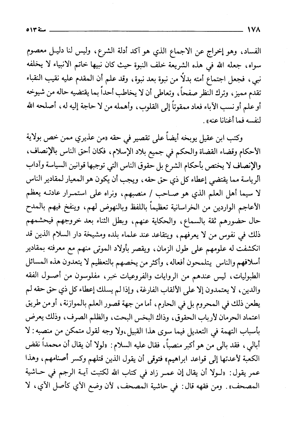 وكتب ابن عقيل يوبخه أيضا على تقصير في حقه «من عذيري ممن خص بولاية الأحكام وقضاء القضاة والحكم في جميع بلاد الإسلام، فكان أحق الناس بالإنصاف، والإنصاف لا يختص بأحكام الشرع بل حقوق الناس التي توجبها قوانين السياسة وآداب الرئاسة مما يقتضي إعطاء كل ذي حق حقه، ويجب أن يكون هو المعيار لمقادير الناس لا سيما أهل العلم الذي هو صاحب/ منصبهم، ونراه على استمرار عادته يعظم الأعاجم الواردين من الخراسانية تعظيما باللفظ وبالنهوض لهم، وينفخ فيهم بالمدح حال حضورهم ثقة بالسماع، والحكاية عنهم، وبطل الثناء بعد خروجهم فيحشمهم ذلك في نفوس من لا يعرفهم، ويتقاعد عند علماء بلده ومشيخة دار السلام الذين قد انكشفت له علومهم على طول الزمان، ويقصر بأولاد الموتى منهم مع معرفته بمقادير أسلافهم والناس يتلمحون أفعاله، وأكثر من يخصهم بالتعظيم لا يتعدون هذه المسائل الطبوليات، ليس عندهم من الروايات والفروعيات خبر، مفلوسون من أصول الفقه والدين، لا يعتمدون إلا على الألقاب الفارغة، وإذا لم يسلك إعطاء كل ذي حق حقه لم يطعن ذلك في المحروم بل في الحارم، أما من جهة قصور العلم بالموازنة، أو من طريق اعتماد الحرمان لأرباب الحقوق، وذاك البخس البحت، والظلم الصرف، وذلك يعرض بأسباب التهمة في التعديل فيما سوى هذا القبيل، ولا وجه لقول متمكن من منصبه: لا أبالي، فقد بالي من هو أكبر منصبا، فقال عليه السلام: «لولا أن يقال أن محمدا نقض الكعبة لأعدتها إلى قواعد إبراهيم» فتوقى أن يقول الذين قتلهم وكسر أصنامهم، وهذا عمر يقول: «لولا أن يقال أن عمر زاد في كتاب الله لكتبت آية الرجم في حاشية المصحف» . ومن فقهه قال: في حاشية المصحف، لأن وضع الآي كأصل الآي، لا