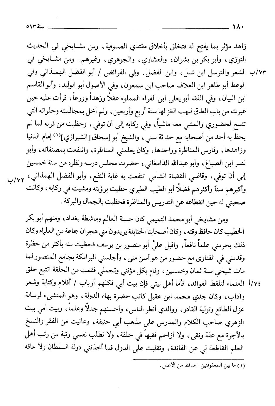 زاهد مؤثر بما يفتح له فتخلق بأخلاق مقتدى الصوفية، ومن مشايخي في الحديث التوزي، وأبو بكر بن بشران، والعشاري، والجوهري، وغيرهم. ومن مشايخي في 73/ ب الشعر والترسل ابن شبل، وابن الفضل. وفي الفرائض/ أبو الفضل الهمذاني وفي الوعظ أبو طاهر ابن العلاف صاحب ابن سمعون، وفي الأصول أبو الوليد، وأبو القاسم ابن البيان، وفي الفقه أبو يعلى ابن الفراء المملوء عقلا وزهدا وورعا، قرأت عليه حين عبرت من باب الطاق لنهب الغز لها سنة أربع وأربعين، ولم أخل بمجالسته وخلواته التي تتسع لحضوري والمشي معه ماشيا، وفي ركابه إلى أن توفي، وحظيت من قربه لما لم يحظ به أحد من أصحابه مع حداثة سني، والشيخ أبو إسحاق [الشيرازي] [1] إمام الدنيا وزاهدها، وفارس المناظرة وواحدها، وكان يعلمني المناظرة، وانتفعت بمصنفاته، وأبو نصر ابن الصباغ، وأبو عبد الله الدامغاني، حضرت مجلس درسه ونظره من سنة خمسين إلى أن توفي، وقاضي القضاة الشامي انتفعت به غاية النفع، وأبو الفضل الهمذاني، 72/ ب وأكبرهم سنا وأكثرهم فضلا أبو الطيب الطبري حظيت برؤيته ومشيت في ركابه، وكانت صحبتي له حين انقطاعه عن التدريس والمناظرة فحظيت بالجمال والبركة.