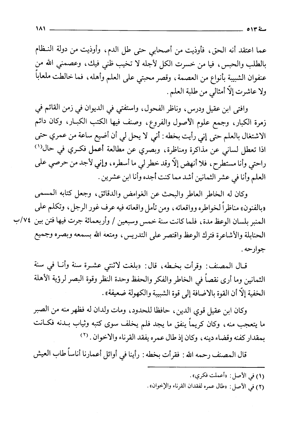 وأفتى ابن عقيل ودرس، وناظر الفحول، واستفتى في الديوان في زمن القائم في زمرة الكبار، وجمع علوم الأصول والفروع، وصنف فيها الكتب الكبار، وكان دائم الاشتغال بالعلم حتى إني رأيت بخطه: إني لا يحل لي أن أضيع ساعة من عمري حتى إذا تعطل لساني عن مذاكرة ومناظرة، وبصرى عن مطالعة أعمل فكري في حال [1] راحتي وأنا مستطرح، فلا أنهض إلا وقد خطر لي ما أسطره، وإني لأجد من حرصي على العلم وأنا في عشر الثمانين أشد مما كنت أجده وأنا ابن عشرين.