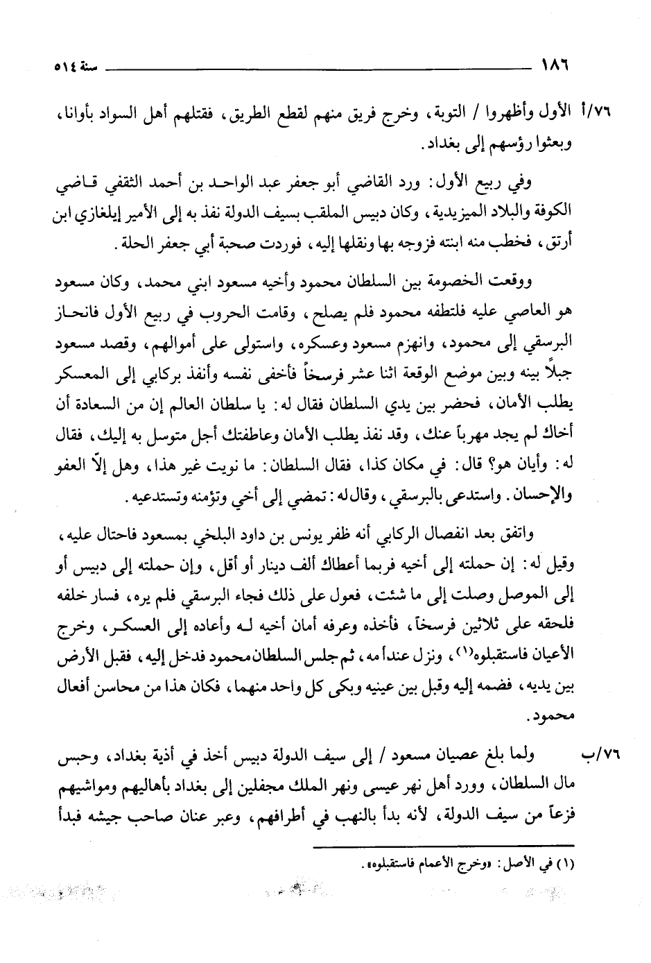 76/ أالأول وأظهروا/ التوبة، وخرج فريق منهم لقطع الطريق، فقتلهم أهل السواد بأوانا، وبعثوا رءوسهم إلى بغداد.