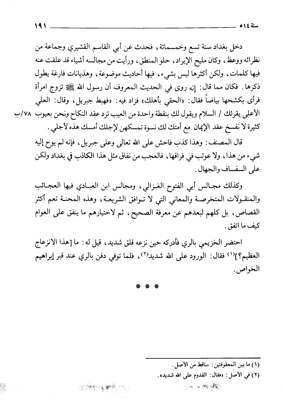 قال المصنف: وهذا كذب فاحش على الله تعالى وعلى جبريل، فإنه لم يوح إليه شيء من هذا، ولا عوتب في فراقها، فالعجب من نفاق مثل هذا الكاذب في بغداد ولكن على السفساف والجهال.