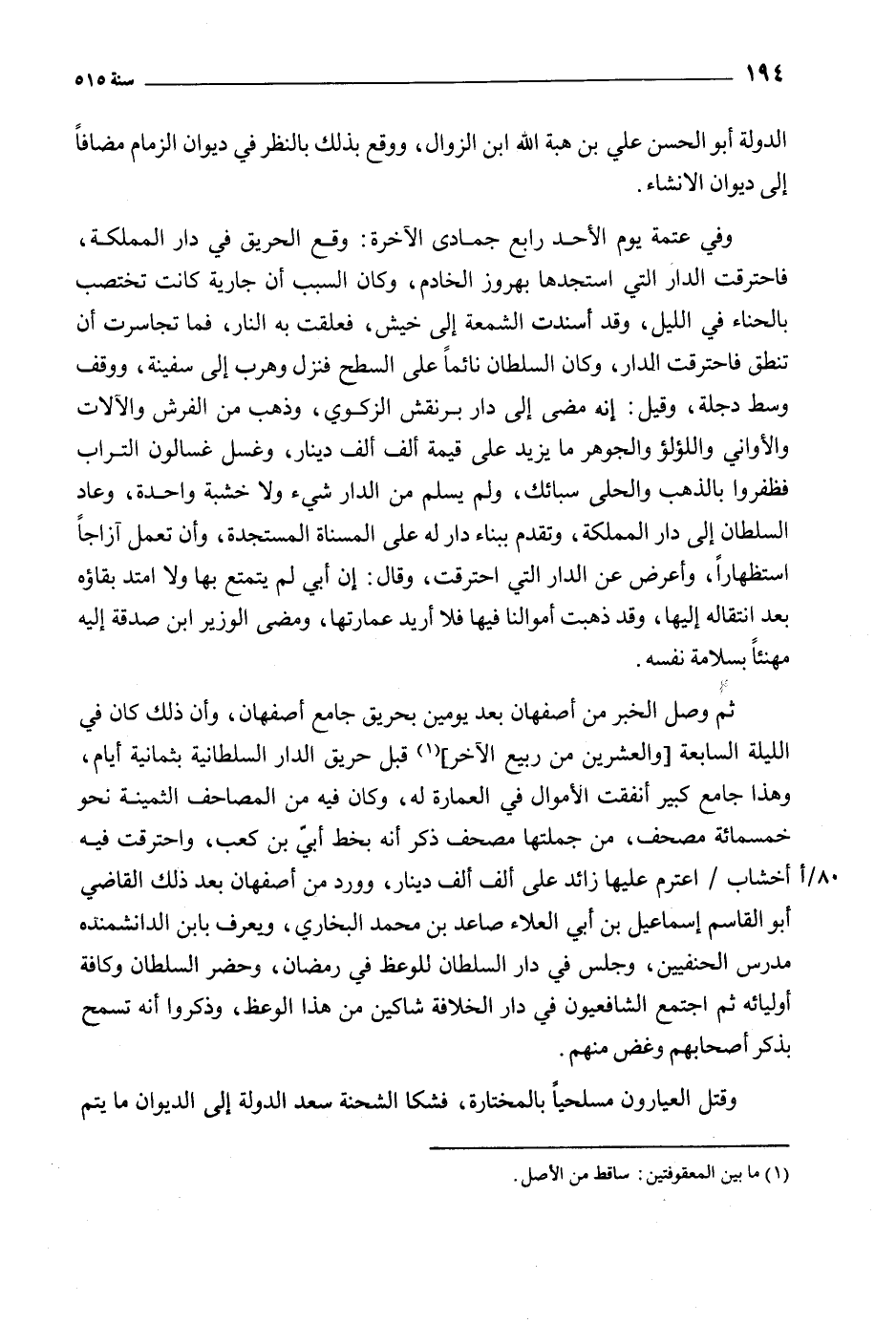 ثم وصل الخبر من أصفهان بعد يومين بحريق جامع أصفهان، وأن ذلك كان في الليلة السابعة [والعشرين من ربيع الآخر] [1] قبل حريق الدار السلطانية بثمانية أيام، وهذا جامع كبير أنفقت الأموال في العمارة له، وكان فيه من المصاحف الثمينة نحو خمسمائة مصحف، من جملتها مصحف ذكر أنه بخط أبيّ بن كعب، واحترقت فيه 80/ أأخشاب/ اعترم عليها زائد على ألف ألف دينار، وورد من أصفهان بعد ذلك القاضي أبو القاسم إِسْمَاعِيل بن أبي العلاء صاعد بن محمد البخاري، ويعرف بابن الدانشمنده مدرس الحنفيين، وجلس في دار السلطان للوعظ في رمضان، وحضر السلطان وكافة أوليائه ثم اجتمع الشافعيون في دار الخلافة شاكين من هذا الوعظ، وذكروا أنه تسمح بذكر أصحابهم وغض منهم.