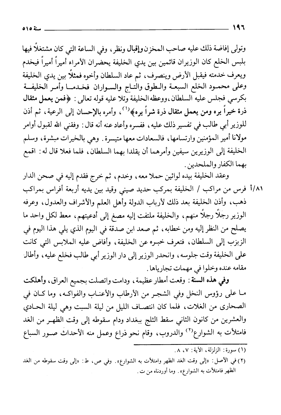 وتولى إفاضة ذلك عليه صاحب المخزن وإقبال ونظر، وفي الساعة التي كان مشتغلا فيها بلبس الخلع كان الوزيران قائمين بين يدي الخليفة يحضران الأمراء أميرا أميرا فيخدم ويعرف خدمته فيقبل الأرض وينصرف، ثم عاد السلطان وأخوه فمثلا بين يدي الخليفة وعلى محمود الخلع السبعة والطوق والتاج والسواران فخدما وأمر الخليفة بكرسي فجلس عليه السلطان، ووعظه الخليفة وتلا عليه قوله تعالى: فَمَنْ يَعْمَلْ مِثْقالَ ذَرَّةٍ خَيْراً يَرَهُ وَمن يَعْمَلْ مِثْقالَ ذَرَّةٍ شَرًّا يَرَهُ 99: 7- 8 [1] ، وأمره بالإحسان إلى الرعية، ثم أذن للوزير أبي طالب في تفسير ذلك عليه، ففسره وأعاد عنه أنه قال: وفقني الله لقبول أوامر مولانا أمير المؤمنين وارتسامها، فالسعادات معها متيسرة. وهي بالخيرات مبشرة، وسلم الخليفة إلى الوزيرين سيفين وأمرهما أن يقلدا بهما السلطان، فلما فعلا قال له: اقمع بهما الكفار والملحدين.