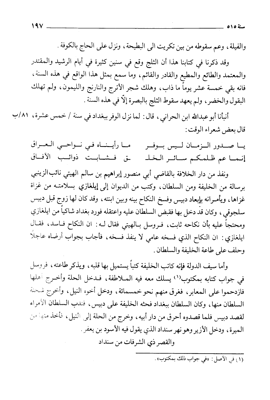 وقد ذكرنا في كتابنا هذا أن الثلج وقع في سنين كثيرة في أيام الرشيد والمقتدر والمعتمد والطائع والمطيع والقادر والقائم، وما سمع بمثل هذا الواقع في هذه السنة، فإنه بقي خمسة عشر يوما ما ذاب، وهلك شجر الأترج والنارنج والليمون، ولم تهلك البقول والخضر، ولم يعهد سقوط الثلج بالبصرة إلا في هذه السنة.