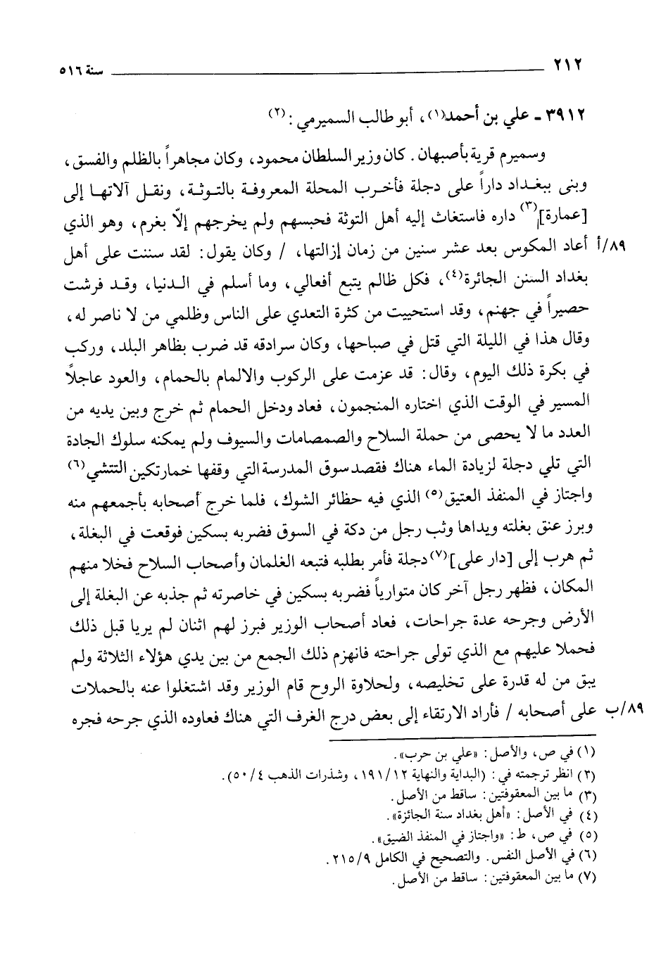 [2] وسميرم قرية بأصبهان. كان وزير السلطان محمود، وكان مجاهرا بالظلم والفسق، وبنى ببغداد دارا على دجلة فأخرب المحلة المعروفة بالتوثة، ونقل آلاتها إلى [عمارة] [3] داره فاستغاث إليه أهل التوثة فحبسهم ولم يخرجهم إلا بغرم، وهو الذي 89/ أأعاد المكوس بعد عشر سنين من زمان إزالتها، / وكان يقول: لقد سننت على أهل بغداد السنن الجائرة [4] ، فكل ظالم يتبع أفعالي، وما أسلم في الدنيا، وقد فرشت حصيرا في جهنم، وقد استحييت من كثرة التعدي على الناس وظلمي من لا ناصر له، وقال هذا في الليلة التي قتل في صباحها، وكان سرادقه قد ضرب بظاهر البلد، وركب في بكرة ذلك اليوم، وقال: قد عزمت على الركوب والإلمام بالحمام، والعود عاجلا المسير في الوقت الذي اختاره المنجمون، فعاد ودخل الحمام ثم خرج وبين يديه من العدد ما لا يحصى من حملة السلاح والصمصامات والسيوف ولم يمكنه سلوك الجادة التي تلي دجلة لزيادة الماء هناك فقصد سوق المدرسة التي وقفها خمارتكين التتشي [5] واجتاز في المنفذ العتيق [6] الذي فيه حظائر الشوك، فلما خرج أصحابه بأجمعهم منه وبرز عنق بغلته ويداها وثب رجل من دكة في السوق فضربه بسكين فوقعت في البغلة، ثم هرب إلى [دار على] [7] دجلة فأمر بطلبه فتبعه الغلمان وأصحاب السلاح فخلا منهم المكان، فظهر رجل آخر كان متواريا فضربه بسكين في خاصرته ثم جذبه عن البغلة إلى الأرض وجرحه عدة جراحات، فعاد أصحاب الوزير فبرز لهم اثنان لم يريا قبل ذلك فحملا عليهم مع الذي تولى جراحته فانهزم ذلك الجمع من بين يدي هؤلاء الثلاثة ولم يبق من له قدرة على تخليصه، ولحلاوة الروح قام الوزير وقد اشتغلوا عنه بالحملات 89/ ب على أصحابه/ فأراد الارتقاء إلى بعض درج الغرف التي هناك فعاوده الذي جرحه فجره