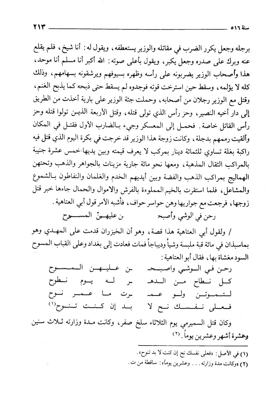 برجله وجعل يكرر الضرب في مقاتله والوزير يستعطفه، ويقول له: أنا شيخ، فلم يقلع عنه وبرك على صدره وجعل يكبر، ويقول بأعلى صوته: الله اكبر أنا مسلم أنا موحد، هذا وأصحاب الوزير يضربونه على رأسه وظهره بسيوفهم ويرشقونه بسهامهم، وذلك كله لا يؤلمه، وسقط حين استرخت قوته فوجدوه لم يسقط حتى ذبحه كما يذبح الغنم، وقتل مع الوزير رجلان من أصحابه، وحملت جثة الوزير على بارية أخذت من الطريق إلى دار أخيه النصير، وحز رأس الذي تولى قتله، وقتل الأربعة الذين تولوا قتله وحز رأس القاتل خاصة. فحمل إلى المعسكر وجيء بالضارب الأول فقتل في المكان وألقيت رممهم بدجلة، وكانت زوجة هذا الوزير قد خرجت في بكرة اليوم الذي قتل فيه راكبة بغلة تساوي ثلاثمائة دينار بمركب لا يعرف قيمته وبين يديها خمس عشرة جنيبة بالمراكب الثقال المذهبة، ومعها نحو مائة جارية مزينات بالجواهر والذهب وتحتهن الهماليج بمراكب الذهب والفضة وبين أيديهم الخدم والغلمان والنفاطون بالشموع والمشاعل، فلما استقرت بالخيم المملوءة بالفرش والأموال والحمال جاءها خبر قتل زوجها، فرجعت مع جواريها وهن حواسر حواف، فأشبه الأمر قول أبي العتاهية.