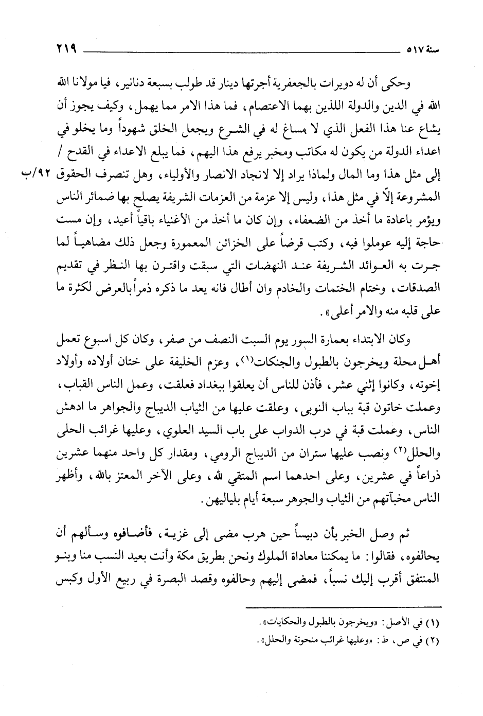 وحكي أن له دويرات بالجعفرية أجرتها دينار قد طولب بسبعة دنانير، فيا مولانا الله الله في الدين والدولة اللذين بهما الاعتصام، فما هذا الأمر مما يهمل، وكيف يجوز أن يشاع عنا هذا الفعل الذي لا مساغ له في الشرع ويجعل الخلق شهودا وما يخلو في أعداء الدولة من يكون له مكاتب ومخبر يرفع هذا اليهم، فما يبلع الأعداء في القدح/ إلى مثل هذا وما المال ولماذا يراد إلا لإنجاد الأنصار والأولياء، وهل تنصرف الحقوق 92/ ب المشروعة إلا في مثل هذا، وليس إلا عزمة من العزمات الشريفة يصلح بها ضمائر الناس ويؤمر بإعادة ما أخذ من الضعفاء، وإن كان ما أخذ من الأغنياء باقيا أعيد، وإن مست حاجة إليه عوملوا فيه، وكتب قرضا على الخزائن المعمورة وجعل ذلك مضاهيا لما جرت به العوائد الشريفة عند النهضات التي سبقت واقترن بها النظر في تقديم الصدقات، وختام الختمات والخادم وإن أطال فإنه يعد ما ذكره ذمرا بالعرض لكثرة ما على قلبه منه والأمر أعلى» .