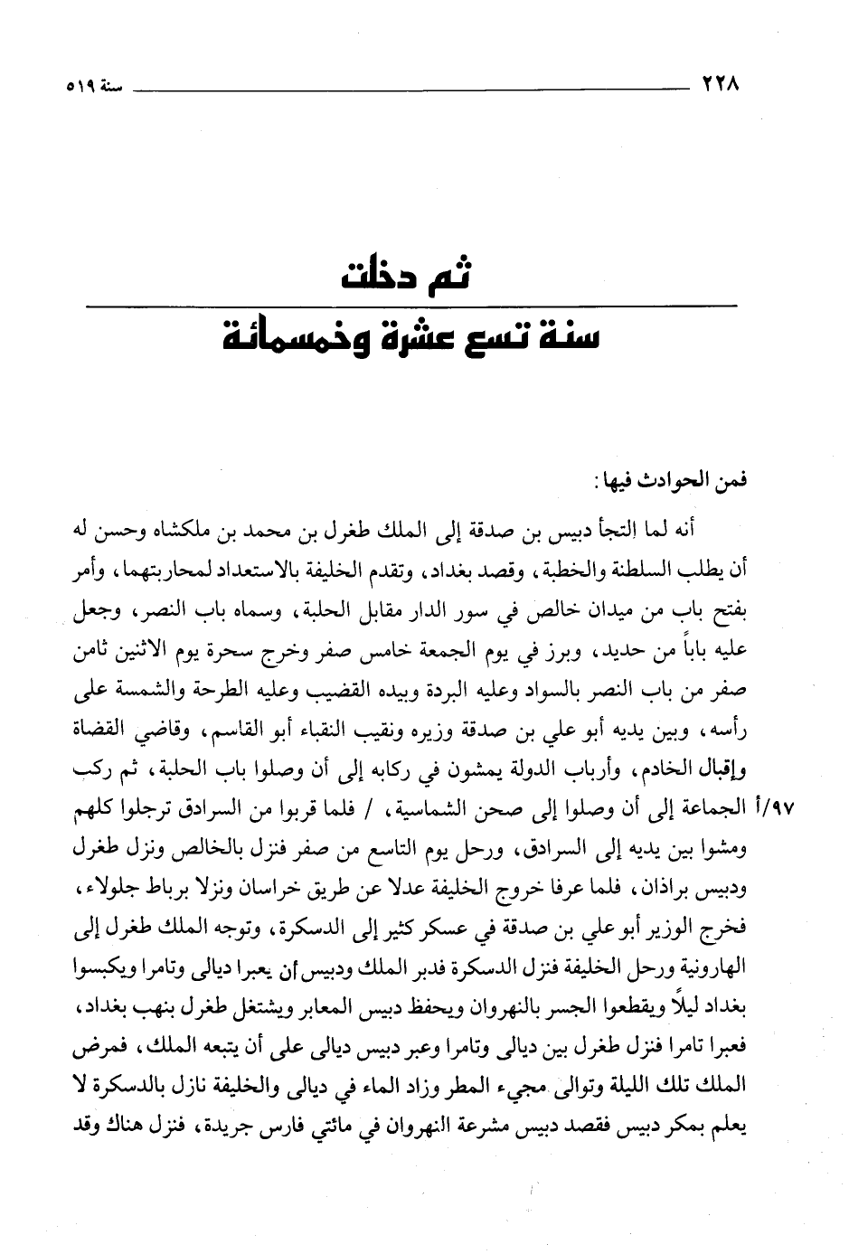 أنه لما التجأ دبيس بن صدقة إلى الملك طغرل بن محمد بن ملك شاه وحسن له أن يطلب السلطنة والخطبة، وقصد بغداد، وتقدم الخليفة بالاستعداد لمحاربتهما، وأمر بفتح باب من ميدان خالص في سور الدار مقابل الحلبة، وسماه باب النصر، وجعل عليه بابا من حديد، وبرز في يوم الجمعة خامس صفر وخرج سحرة يوم الاثنين ثامن صفر من باب النصر بالسواد وعليه البردة وبيده القضيب وعلية الطرحة والشمسة على رأسه، وبين يديه أبو على بن صدقة وزيره ونقيب النقباء أبو القاسم، وقاضي القضاة وإقبال الخادم، وأرباب الدولة يمشون في ركابه إلى أن وصلوا باب الحلبة، ثم ركب 97/ أالجماعة إلى أن وصلوا إلى صحن الشماسية، / فلما قربوا من السرادق ترجلوا كلهم ومشوا بين يدية إلى السرادق، ورحل يوم التاسع من صفر فنزل بالخالص ونزل طغرل ودبيس براذان، فلما عرفا خروج الخليفة عدلا عن طريق خراسان ونزلا برباط جلولاء، فخرج الوزير أبو على بن صدقة في عسكر كثير إلى الدسكرة، وتوجه الملك طغرل إلى الهارونية ورحل الخليفة فنزل الدسكرة فدبر الملك ودبيس ان يعبرا ديالى وتامرا ويكبسوا بغداد ليلا ويقطعوا الجسر بالنهروان ويحفظ دبيس المعابر ويشتغل طغرل بنهب بغداد، فعبرا تامرا فنزل طغرل بين ديالي وتامرا وعبر دبيس ديالي على أن يتبعه الملك، فمرض الملك تلك الليلة وتوالى مجيء المطر وزاد الماء في ديالى والخليفة نازل بالدسكرة لا يعلم بمكر دبيس فقصد دبيس مشرعة النهروان في مائتي فارس جريدة، فنزل هناك وقد