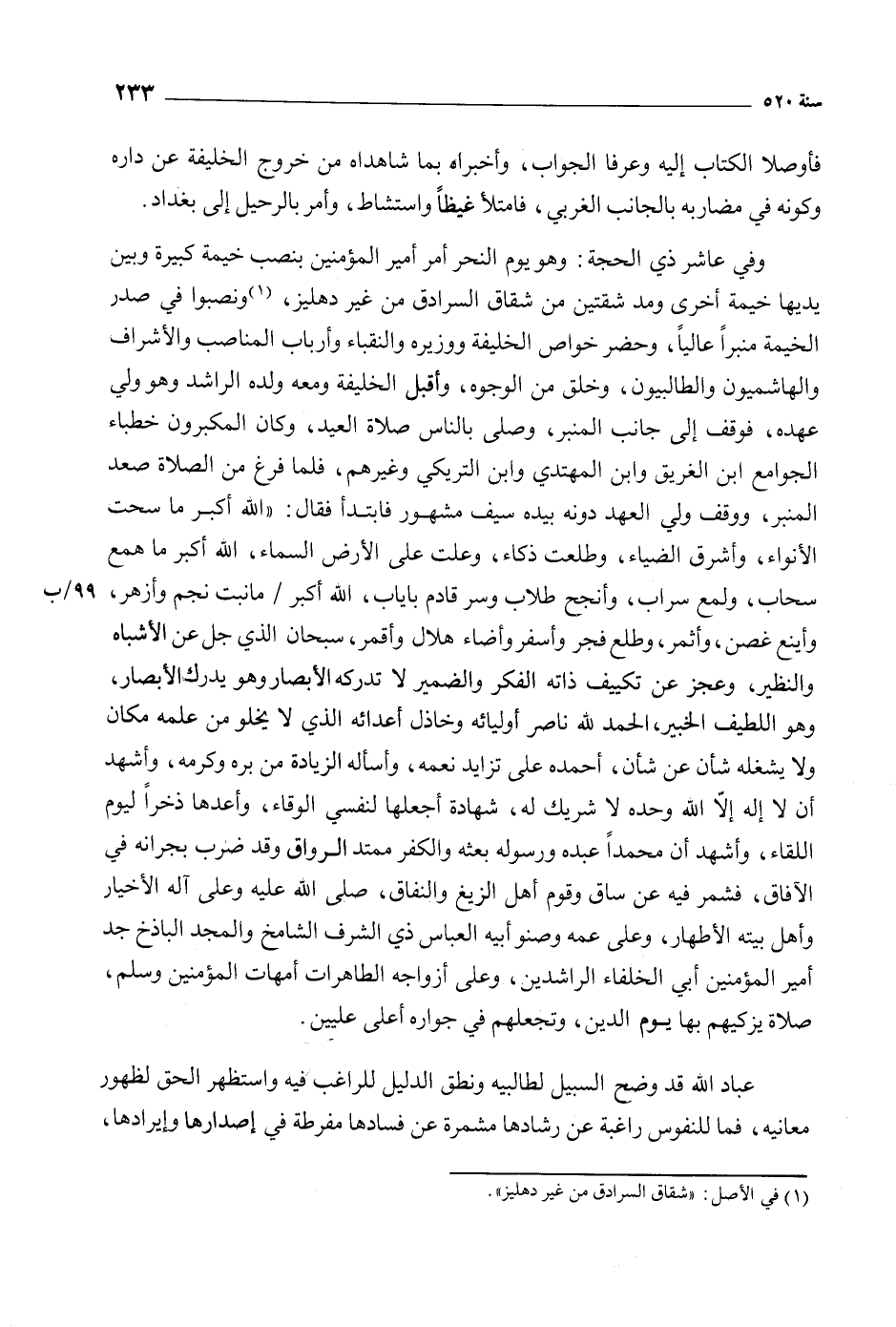 وفي عاشر ذي الحجة: وهو يوم النحر أمر أمير المؤمنين بنصب خيمة كبيرة وبين يديها خيمة أخرى ومد شقتين من شقاق السرادق من غير دهليز، [1] ونصبوا في صدر الخيمة منبرا عاليا، وحضر خواص الخليفة ووزيره والنقباء وأرباب المناصب والأشراف والهاشميون والطالبيون، وخلق من الوجوه، وأقبل الخليفة ومعه ولده الراشد وهو ولى عهده، فوقف إلى جانب المنبر، وصلى بالناس صلاة العيد، وكان المكبرون خطباء الجوامع ابن الغريق وابن المهتدى وابن التريكي وغيرهم، فلما فرغ من الصلاة صعد المنبر، ووقف ولى العهد دونه بيده سيف مشهور فابتدأ فقال: «الله أكبر ما سحت الأنواء، وأشرق الضياء، وطلعت ذكاء، وعلت على الأرض السماء، الله أكبر ما همع سحاب، ولمع سراب، وأنجح طلاب وسر قادم بإياب، الله أكبر/ ما نبت نجم وأزهر، 99/ ب وأينع غصن، وأثمر، وطلع فجر وأسفر وأضاء هلال وأقمر، سبحان الذي جل عن الأشباه والنظير، وعجز عن تكييف ذاته الفكر والضمير لا تدركه الأبصار وهو يدرك الأبصار، وهو اللطيف الخبير، الحمد للَّه ناصر أوليائه وخاذل أعدائه الذي لا يخلو من علمه مكان ولا يشغله شأن عن شأن، أحمده على تزايد نعمه، وأسأله الزيادة من بره وكرمه، وَأَشْهَدُ أَنْ لا إِلَهَ إِلا اللَّهُ وَحْدَهُ لا شريك له، شهادة أجعلها لنفسي الوقاء، وأعدها ذخرا ليوم اللقاء، وأشهد أن محمدا عبده ورسوله بعثه والكفر ممتد الرواق وقد ضرب بجرانه في الآفاق، فشمر فيه عن ساق وقوم أهل الزيغ والنفاق، صلى الله عليه وعلى إله الأخيار وأهل بيته الأطهار، وعلى عمه وصنو أبيه العباس ذي الشرف الشامخ والمجد الباذخ جد أمير المؤمنين أبي الخلفاء الراشدين، وعلى أزواجه الطاهرات أمهات المؤمنين وسلم، صلاة يزكيهم بها يوم الدين، وتجعلهم في جواره أعلى عليين.