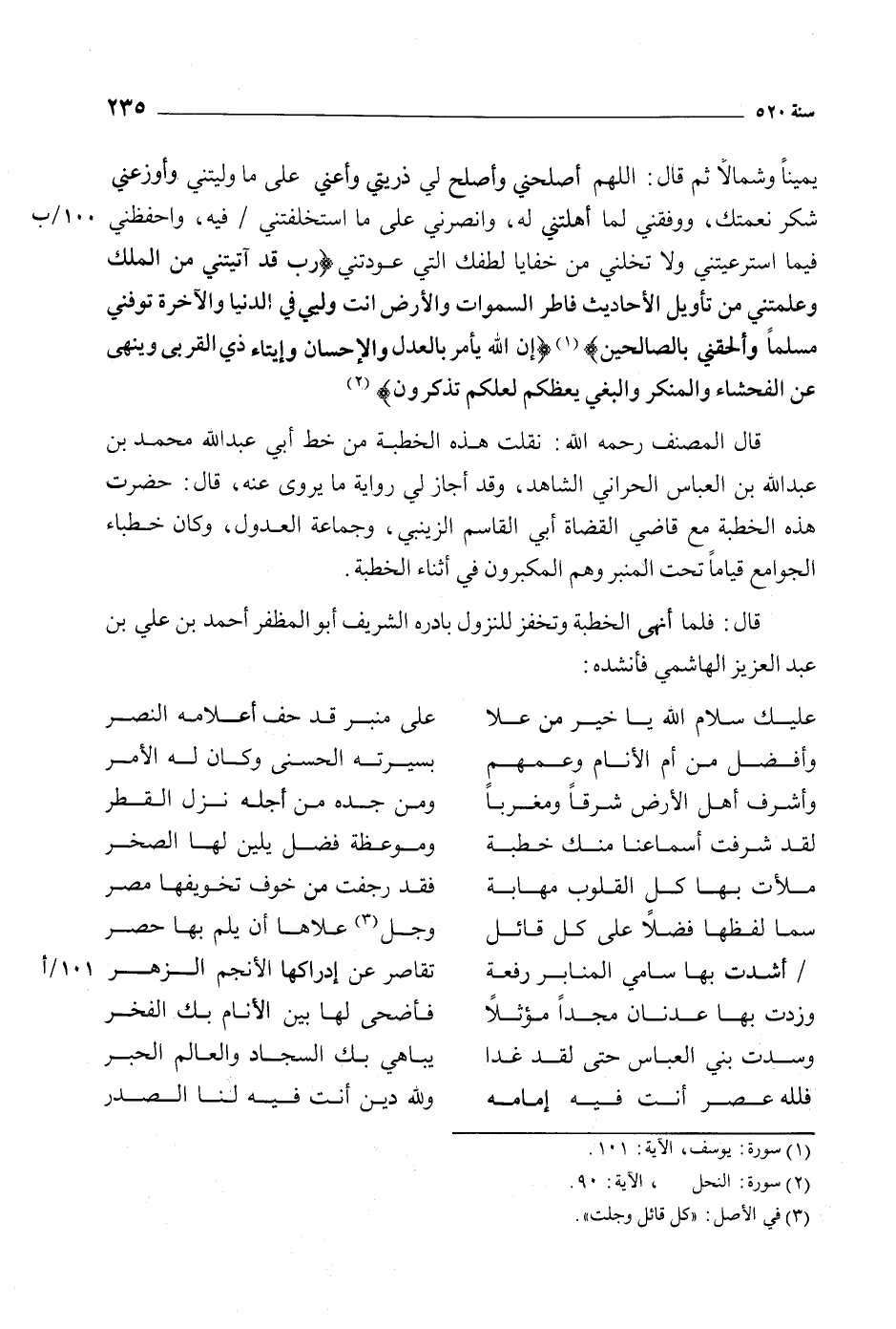 يمينا وشمالا ثم قال: اللَّهمّ أصلحني وأصلح لي ذريتي وأعنى على ما وليتني وأوزعني شكر نعمتك، ووفقني لما أهلتني له، وانصرني على ما استخلفتني/ فيه، واحفظني 100/ ب فيما استرعيتني ولا تخلني من خفايا لطفك التي عودتني «رَبِّ قَدْ آتَيْتَنِي مِنَ الْمُلْكِ وَعَلَّمْتَنِي من تَأْوِيلِ الْأَحادِيثِ فاطِرَ السَّماواتِ وَالْأَرْضِ أَنْتَ وَلِيِّي فِي الدُّنْيا وَالْآخِرَةِ تَوَفَّنِي مُسْلِماً وَأَلْحِقْنِي بِالصَّالِحِينَ 12: 101 [1] «إِنَّ اللَّهَ يَأْمُرُ بِالْعَدْلِ وَالْإِحْسانِ وَإِيتاءِ ذِي الْقُرْبى وَيَنْهى عَنِ الْفَحْشاءِ وَالْمُنْكَرِ وَالْبَغْيِ يَعِظُكُمْ لَعَلَّكُمْ تَذَكَّرُونَ» 16: 90 [2] قال المصنف رحمه الله: نقلت هذه الخطبة من خط أبي عَبْد اللَّهِ مُحَمَّد بْن عَبْد اللَّهِ بْن العباس الحراني الشاهد، وقد أجاز لي رواية ما يروى عنه، قال: حضرت هذه الخطبة مع قاضي القضاة أبي القاسم الزينبي، وجماعة العدول، وكان خطباء الجوامع قياما تحت المنبر وهم المكبرون في أثناء الخطبة.