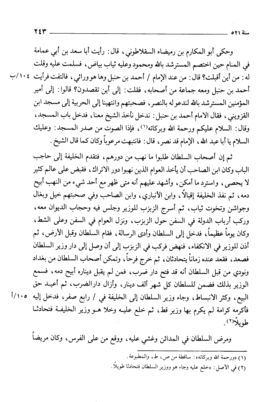 ثم ان أصحاب السلطان طلبوا ما نهب من دورهم، فتقدم الخليفة إلى حاجب الباب وكان ابن الصاحب أن يأخذ العوام الذين نهبوا دور الأتراك، فقبض على عالم كثير لا يحصى، واسترد ما أمكن، وأشهد عليهم أنه متى ظهر مع أحد شيء من النهب أبيح دمه، ثم نفذ الخليفة إقبالًا، وابن الأنباري، وابن الصاحب وفي صحبتهم خيل وبغال وجواشن وتخوت ثياب، ثم أسرج الزبزب للوزير وجلس فيه وحجاب الديوان معه، وركب أرباب الدولة في السفن حول الزبزب، ونزل العوام في السفن وعلى الشط، وكان يوما عظيما، فدخل إلى السلطان وأدى الرسالة، فقام السلطان وقبل الأرض، ثم أذن للوزير في الانكفاء، فنهض فركب في الزبزب إلى أن وصل إلى دار وزير السلطان فصعد، فقعد عنده زمانا يتحادثان، ثم خرج فرحا، وتمكن أصحاب السلطان من بغداد ونودي من قبل السلطان أنه قد فتح دار ضرب، فمن لم يقبل ديناره أبيح دمه، فسمع الوزير بذلك فضمن للسلطان كل شهر ألف دينار، وأزال دار الضرب، ثم أعيد حق البيع، وكثر الانبساط، وجاء وزير السلطان إلى الخليفة في/ رابع صفر، فدخل إليه 105/ أفأكرمه كرامة لم يكرم بها وزير قط، ثم خلع عليه وخلا هو وزير الخليفة فتحادثا طويلا [2] .