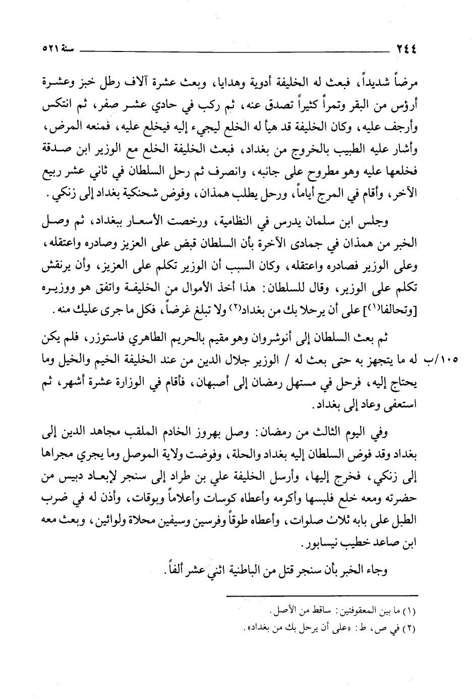 مرضا شديدا، فبعث له الخليفة أدوية وهدايا، وبعث عشرة آلاف رطل خبز وعشرة أرؤس من البقر وتمرا كثيرا تصدق عنه، ثم ركب في حادي عشر صفر، ثم انتكس وأرجف عليه، وكان الخليفة قد هيأ له الخلع ليجيء إليه فيخلع عليه، فمنعه المرض، وأشار عليه الطبيب بالخروج من بغداد، فبعث الخليفة الخلع مع الوزير ابن صدقة فخلعها عليه وهو مطروح على جانبه، وانصرف ثم رحل السلطان في ثاني عشر ربيع الآخر، وأقام في المرج أياما، ورحل يطلب همذان، وفوض شحنكية بغداد إلى زنكي.